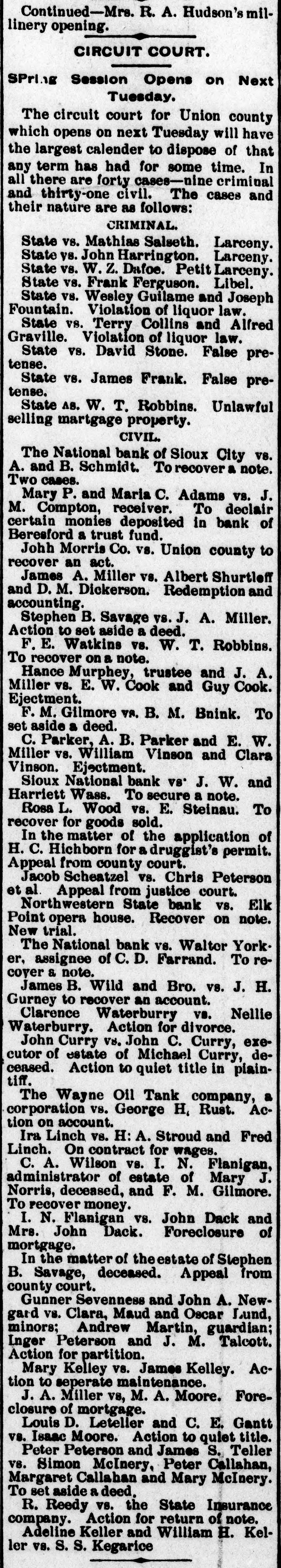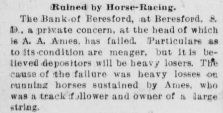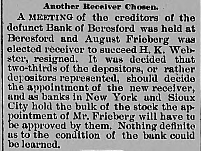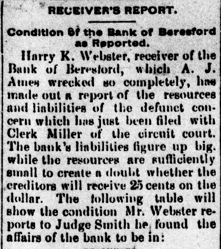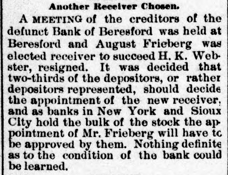 repeated violations of law on the part of the management and the refusal to pay assessments, thereby producing a condition rendering them insolvent. The examiner will give out no statement of assets or liabilities. Cashier Mears announces the small indebtedness does not exceed $60,000, with assets five times that amount. PLATTE CITY, Mo., May 29.-The Platte City Mill & Elevator Company assigned to the Exchange bank of Platte City, Mo., to-day. Assets, about $20,000; liabilities estimated at $15,000. The company will doubtless continue business in three or four days, as wealthy Iowa parties are interested. BLOOMINGTON, IND., May 30.-The Worley bank at Ellettevile, a private in stitution, has assigned. The liabilities are about $35,000, and the assets will reach $50,000. It was impossible to realize on notes and property, necessitating assignment. It is believed that the bank will pay all obligations. SIOUX CITY, IA., May 30.-The bank failure of Beresford, S. D., a private concorn, at the head of which is A. A. Ames, has failed. It is believed the depositors will be heavy losers. The cause of the failure was heavy losses on running horses sustained by Ames, who was a track follower and the owner of a large string. BRISTOL, TENN., May 30.-The Big Stone Gap Land Company, capitalized at $2,000,000, and with a bonded indebtedness of $2,000,000, was forced into liquidation yesterday by a suit entered in the United States district court at Abingdon, by William McGeorge, Jr., John H. Dingee, John C. Bullitt, Samuel W. Coulter, Jr., and Dr. William Pepper, all of Philadelphia. The bill alleges gross mismanagement and misappropriation of its funds. ST. JOSEPH, May 31.-The wholesale lumber firm of Meuhleisen & Co., filed a deed of assignment at midnight. B. K. Tenny, of Chicago, was named as trustee. The firm has several yards in this section also in Kansas. The liabilities are not fully known, but a rough estimate places them at $150,000. The failure was caused by the assignment of S.B. Baker, the lumber dealer at Chicago, who failed yesterday. MILWAUKEE, June 1.-The Plankinton bank closed its doors at 10:05 o'clock to-day, when the following notice was tacked to the front door of the institution: Owing to the failure of our efforts to reorganize the bank and to the oontinual withdrawal of deposits, we have thought it best for the interest of all depositors and stockholders to close the PLANKINTON BANK. bank. The suspension is largely due to the failure of F. A. Lappen & Co., and the Lappen Furniture Company two weeks ago with liabilities that will probably amount to $750,000 when the worst is known. The Lappen firms, so far as claims have been recorded, owe the Plankinton bank between $200,000 and $250,000, and this sum is due on Lappen's personal notes, which are considered practically valueless. The Lappen in-
