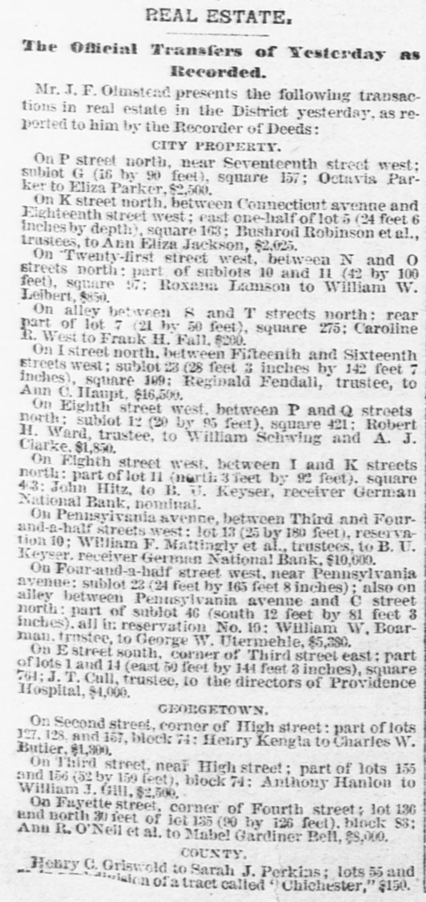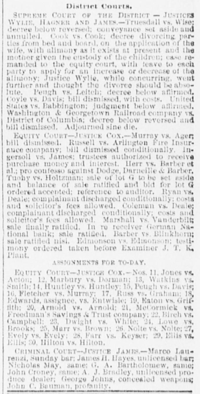 District Courts. SUPREME COURT OF THE DISTRICT - JUSTICES WYLIE, HAGNER AND JAMES.-Truesdall vs. Wise: decree below reversed; conveyance set aside and annulled. Cook VS. Cook: decree divorcing parties from bed and board. on the application of the wife, with alimony as it exists at present and the mother given the enstody of the children; case remanded to the equity court, with leave to each party to apply for an increase or decrease of the alimony; Justice Wylie, while concurring, went further and thought the divorce should be absolute. Peugh vs. Leitch: decree below affirmed. Coyle vs. Davis; bill dismissed, with costs. United States vs. Babbington; judgment below affirmed. Washington & Georgetown Railroad company VS. District of Columbia; decree below reversed and bill dismissed. Adjourned sine die. EQUITY COURT-JUSTICE Cox.-Murray vs. Ager; bill dismissed. Russell vs. Arlington Fire Insurance company; bill dismissed conditionally. Ingersoll vs. James: trustees authorized to receive purchase money and interest. Herr vs. Barber et al.; pro confesso against Dodge, Darneille & Barber. Tuohy vs. Holtzman: sale of lot G to be set aside and balance of sale ratified and bid for lot G ordered accepted; reference to auditor. Ryan VS. Deale: complainant discharged conditionally: costs and solicitor's fees allowed. Coleman vs. Deale; complainant discharged conditionally; costs and solicitor's fees allowed. Marshall vs. Vanderbilt; sale finally ratified. In TO receiver German National bank; sale ratified. Barber vs. Blinkhorn; sale ratified nisi. Edmonson VS. Edmonson: testimony ordered taken before Examiner J. T. K. Plant. ASSIGNMENTS FOR TO-DAY. EQUITY COURT-JUSTICE Cox.-Nos. 11, Jones VS. Acton: 12, Marbury vs. Dorman: 13, Watkins VS. Smith: 14, Huntley vs. Huntley: 15, Peugh vs. Davis; 16, Fletcher vs. Murray: 17, Russ vs. Graham: 18, Edwards, assignee, vs. Entwisle: 19, Eaton vs. Griffith: 20, Arnold vs. Arnold; 21, McCormick vs. Freedman's Savings & Trust company: 22. Birch VS. Campbell: 23, Dwight vs. White: 24, Lowe vs. Brooks; 25, Marr vs. Brown: 26. Nolte vs. Nolte: 27, Evely vs. Evely: 28, Farr vs. Keyser; 29, Ellis VS. Ellis; 30, Hilton vs. Hilton. CRIMINAL COURT-JUSTICE JAMES-Marco Laurenzi, Sunday bar; James H. Hayes, unlicensed bar; Nicholas May, same: G. A. Bartholomew, same; John Croney, same: A. J. Bradley, unlicensed produce dealer; George Johns, concealed weapons; John C. Bauman, profanity.