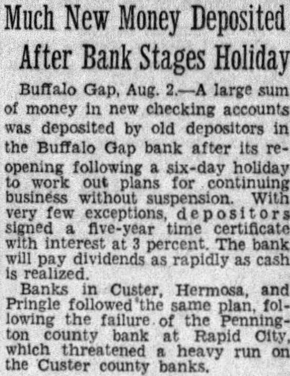 Buffalo Gap, Aug. 2.-A large sum of money in new was deposited by old depositors in the Buffalo Gap bank after its reopening following six-day holiday work out for without With very few exceptions, certificate percent. The bank will pay dividends as rapidly as cash realized. Banks in Custer, Hermosa, and Pringle plan, following the failure the Pennington bank at Rapid City, which heavy run on the Custer county banks.