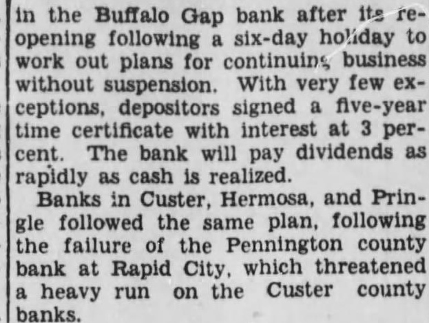 in the Buffalo Gap bank after opening following six-day holiday to work out plans for continuing business without suspension. With very few ceptions, depositors signed five-year time certificate with interest at percent. The bank will pay dividends rapidly as cash is realized. Banks in Custer, Hermosa, and Pringle followed the same plan, following the failure of the Pennington county bank at Rapid City, which threatened heavy run on the Custer county banks.