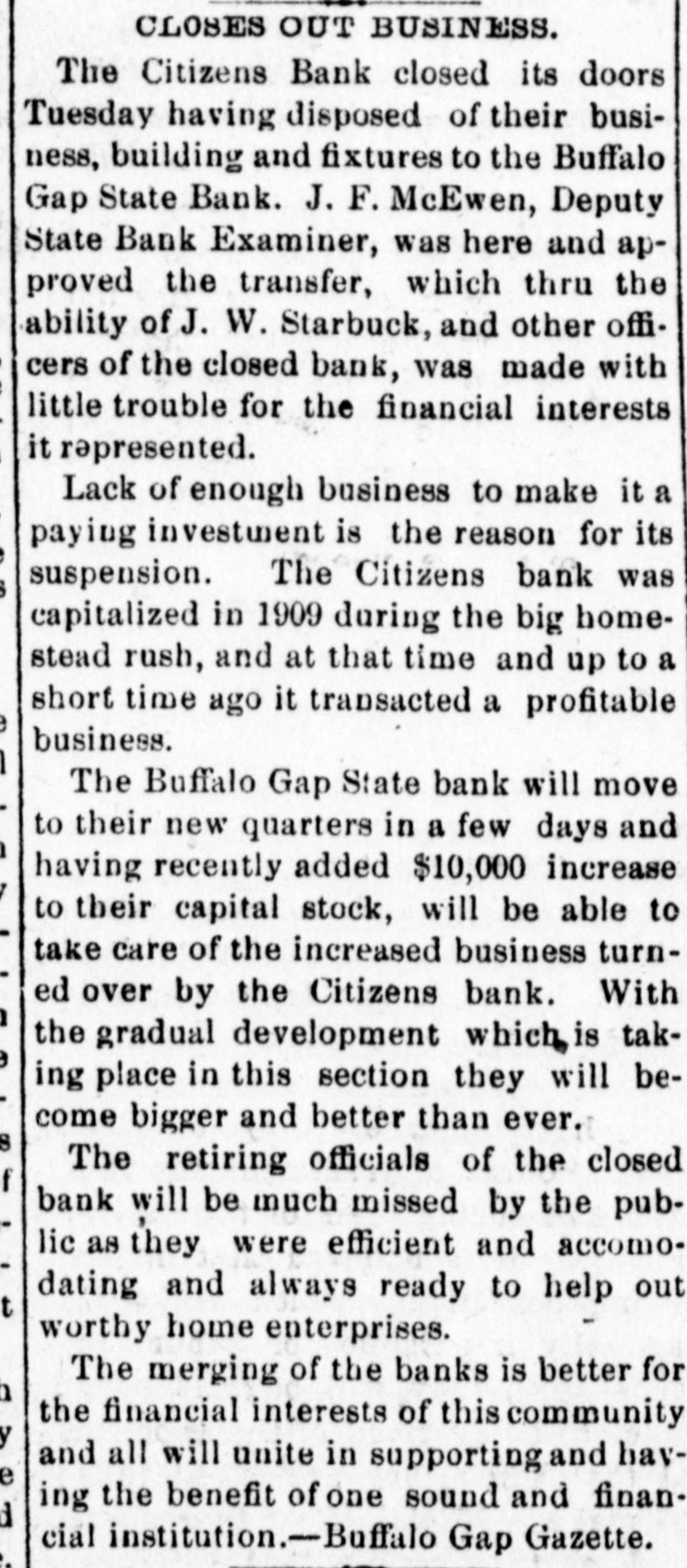 CLOSES OUT BUSINESS. The Citizens Bank closed its doors Tuesday having disposed of their business, building and fixtures to the Buffalo Gap State Bank. J. F. McEwen, Deputy State Bank Examiner, was here and approved the transfer, which thru the ability of J. W. Starbuck, and other officers of the closed bank, was made with little trouble for the financial interests it represented. Lack of enough business to make it a paying investment is the reason for its suspension. The Citizens bank was capitalized in 1909 during the big homestead rush, and at that time and up to a short time ago it transacted a profitable business. The Buffalo Gap State bank will move to their new quarters in a few days and having recently added $10,000 increase to their capital stock, will be able to take care of the increased business turned over by the Citizens bank. With the gradual development which is taking place in this section they will become bigger and better than ever. The retiring officials of the closed bank will be much missed by the public as they were efficient and accomodating and always ready to help out worthy home enterprises. The merging of the banks is better for the financial interests of this community and all will unite in supporting and having the benefit of one sound and financial institution.-Buffalo Gap Gazette.