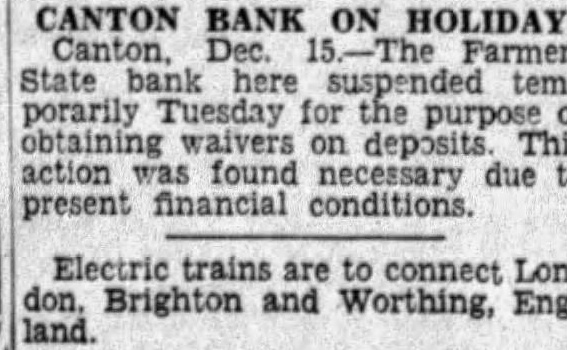 CANTON BANK ON HOLIDAY Canton. Farmers State bank here suspended temporarily Tuesday for the purpose of obtaining waivers on deposits. This action was found necessary due to present financial conditions. Electric trains are to connect London. Brighton and Worthing, England.
