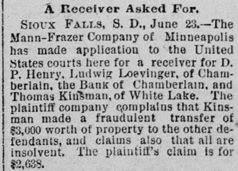 A Receiver Asked For. SIOUX FALLS, S. D., June 23.--The Mann-Frazer Company of Minneapolis has made application to the United States courts here for a receiver for D. P. Henry, Ludwig Loevinger, of Chamberlain. the Bank of Chamberlain, and Thomas Kinsman, of White Lake. The plaintiff company complains that Kinsman made a fraudulent transfer of $3,000 worth of property to the other defendants, and claims also that all are insolvent. The plaintiff's claim is for $2,638.
