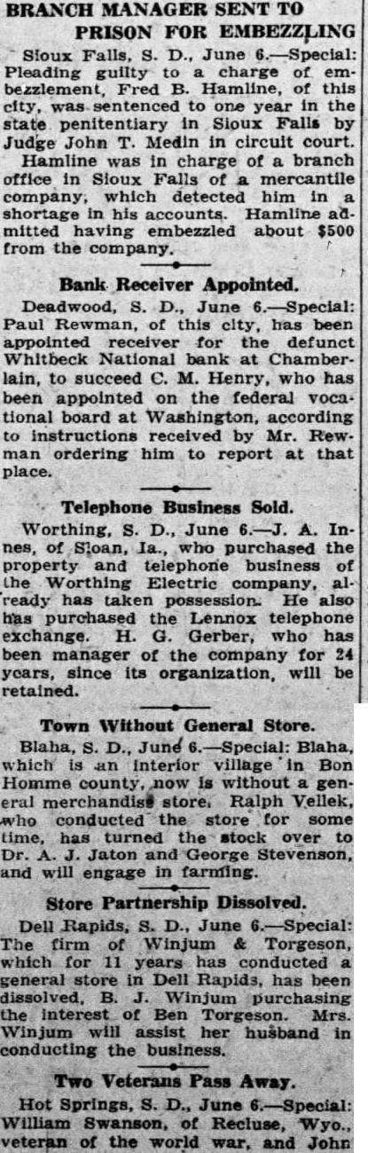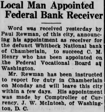 Deadwood, June this city, been appointed receiver the defunct Whitbeck National bank at Chamberlain, succeed M. Henry, has been appointed the federal vocational board Washington, according instructions received by Mr. Rew man ordering him to report at that place.