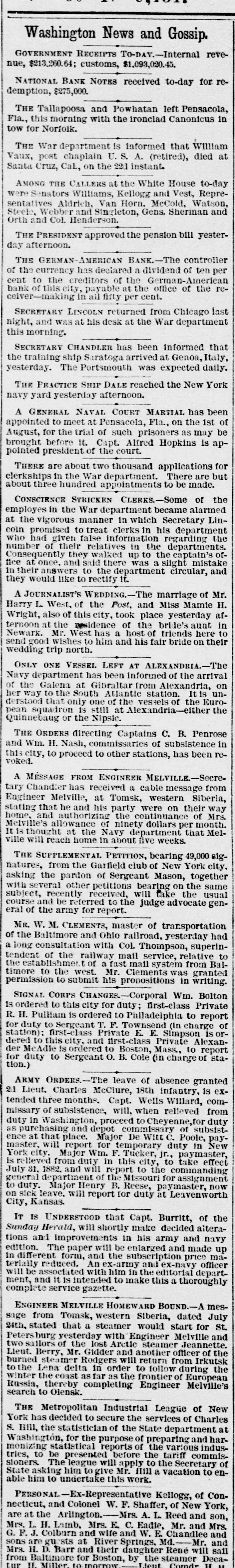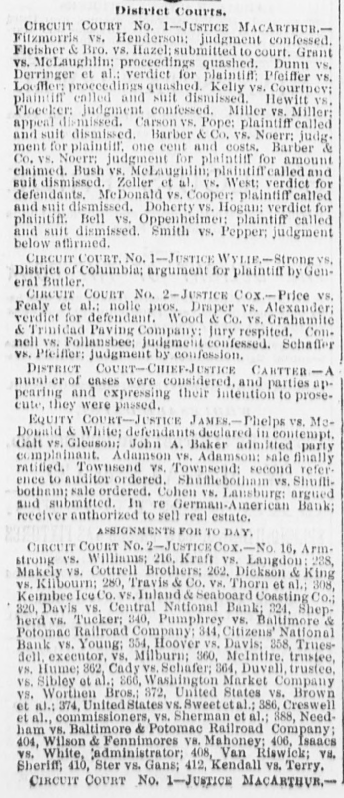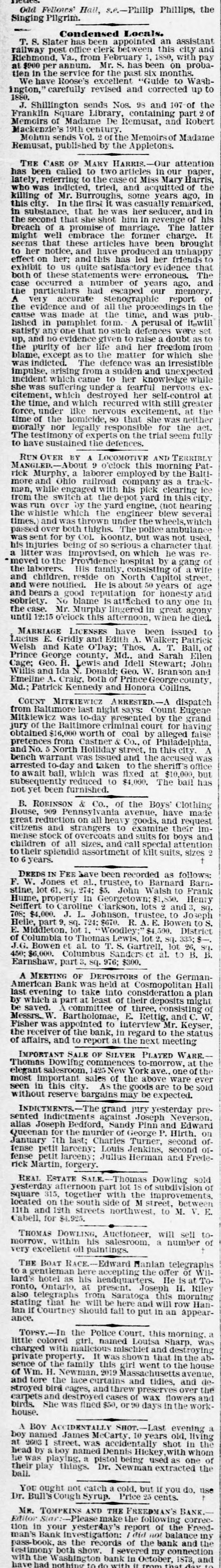 at $900 per annum. Mr. S. has been on probation in the service for the past six months. We have Roose's excellent "Guide to Washington," carefully revised and corrected up to 1880. J. Shillington sends Nos. 98 and 107 of the Franklin Square Library, containing part 2 of Memoirs of Madame De Remusat, and Robert Mackenzie's 19th century. Mohun sends Vol. of the Memoirsof Madame Remusat, published by the Appletons. THE CASE OF MARY HARRIS.-Our attention has been called to two articles in our paper, lately, referring to the case of Miss Mary Harris, who was indicted. tried, and acquitted of the killing of Mr. Burroughs, some years ago, in this city. In the first it was casually remarked. in substance. that he was her seducer, and in the second that she shot him in revenge of his breach of a promise of marriage. The latter might well embrace the former charge. It seems that these articles have been brought to her notice, and have produced an unhappy effect on her; and this has led her friends to exhibit to us quite satisfactory evidence that both of these statements were erroneous. The case occurred a number of years ago, and the particulars had escaped our memory. A very accurate stenographic report of the evidence and of all the proceedings in the cause was made at the time, and was published in pamphlet form. A perusal of it will satisfy any one that no such defences were set up, and no evidence given to raise a doubt as to the purity of her life and her freedom from blame, except as to the matter for which she was indicted. The defence was an irresistible impulse, arising from a sudden and unexpected incident which came to her knowledge while she was suffering under a fearful nervous excitement, which destroyed her self-control at the time, and which recurred with still greater force, under like nervous excitement, at the time of the homicide, S0 that she was neither morally nor legally responsible for the act. The testimony of experts on the trial seem fully to have sustained the defences. RUN OVER BY A LOCOMOTIVE AND TERRIBLY MANGLED.-About 9 o'clock this morning Patrick Murphy, a laborer employed by the Baltimore and Ohio railroad company as a trackman, while engaged with his pick clearing ice from the switch at the depot yard in this city. was run over by the yard engine, (not hearing the whistle which the engineer blew several times, and was thrown under the wheels.which passed over both thighs. The police ambulance was sent for by Col. Koontz. but was not used. his injuries being of SO serious a character that a litter was improvised. on which he was re moved to the Providence hospital by a gang of the laborers. His family consisting of a wife and children. reside on North Capitol street. and were notified. He is about 50 years of age and bears a good reputation for honesty and sobriety. No blame is attached to any one in the case. Mr. Murphy lingered in great agony until 12:15 o'clock this afternoon, when he died. MARRIAGE LICENSES have been issued to Lucius E. Gridly and Edith A. Walker: Patrick Welsh and Kate O'Day; Thos. A. T. Ball, of Prince George county. Md., and Sarah Ellen Cage: Geo. H. Lewis and Idell Stewart: John Willis and Ida N. Donald; Geo. W. Branson and Emeline A. Craig. both of PrinceGeorgecounty, Md.; Patrick Kennedy and Honora Collins. COUNT MITKIEWICZ ARRESTED.-A dispatch from Baltimore last night says: Count Eugene Mitkiewicz was to-day presented by the grand jury of the Baltimore criminal court for having obtained $16,000 worth of coal by alleged false pretences from Castner & Co., or Philadelphia, and No. 5 North Holliday street. in this city. A bench warrant was issued and the accused was arrested to-day and taken to the sheriff's office to await bail, which was fixed at $10,000, but subsequently reduced to $4,000. The ball has not yet been furnished. B. ROBINSON & Co., of the Boys' Clothing House, 909 Pennsylvania avenue, have made great reduction on all heavy goods, and request citizens and strangers to examine their immense stock or overcoats and suits for boys and children of all sizes, and call special attention to their splendid assortment of kilt suits, sizes 2 to years. DEEDS IN FEE have been recorded as follows: F. W. Jones et al., trustee, to Barnard Barnstine, lot 61, sq. 274; $5. John Walsh to Frank Hume, property in Georgetown: $1,850. Henry Seiffert to Caroline Clarkson. lots 2 and 3, Sq. 708: $4,000. J. L. Johnson. trustee. to Joseph Heile, part 9. Sq. 724: $670. R. A. E. Bowen to S. E. Middleton. lot 1, "Woodley;" $4,500. District of Columbia to Thomas Lewis. lot 2. sq. 335; $-. J.G. Bowen et al. to T. S. Gartrell, lot 26, sq. 450; $6,000. Columbus Sanders et al. to B. B. Earnshaw, part 3. Sq. 976; $300. A MEETING OF DEPOSITORS of the GermanAmerican Bank was held at Cosmopolitan Hall last evening to take into consideration a plan by which a part at least of their deposits might be saved. A committee of three, consisting of Messrs. W. Bartholomae, E. Rettig, and C. W. Fisher was appointed to interview Mr. Keyser. the receiver of the bank, in regard to the status of affairs, and to report at the next meeting IMPORTANT SALE OF SILVER PLATED WARE. Thomas Dowling commences to-morrow, at the elegant salesroom, 1425 New York ave., one of the most important sales of the above ware ever seen in this city. AS the goods are to be sold without reserve bargains may be expected. INDICTMENTS.-The grand jury yesterday presented indictments against Joseph Neverson. alias Joseph Bedford, Sandy Pinn and Edward Queenan for the murder of George P. Hirth. on January 7th last; Charles Turner, second oftense petit larceny: Louis Jenkins, second 01fense petit larceny: Julius Herman and Frederick Martin, forgery. REAL ESTATE SALE-Thomas Dowling sold yesterday afternoon part lot 18 of subdivision of square 315, together with the improvements. located on the south side of M street. between 11th and 12th streets northwest. to M. V. E. Cabell, for $4.925. THOMAS DOWLING, 