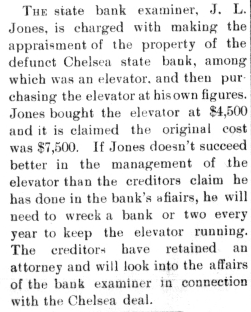 THE state bank examiner, J. L. Jones, is charged with making the appraisment of the property of the defunct Chelsea state bank, among which was an elevator, and then purchasing the elevator at his own figures. Jones bought the elevator at $4,500 and it is claimed the original cost was $7,500. If Jones doesn't succeed better in the management of the elevator than the creditors claim he has done in the bank's afiairs, he will need to wreck a bank or two every year to keep the elevator running. The creditors have retained an attorney and will look into the affairs of the bank examiner in connection with the Chelsea deal.