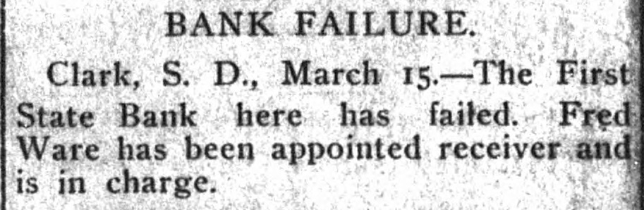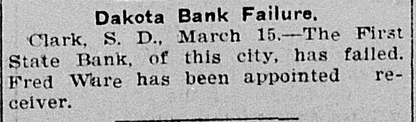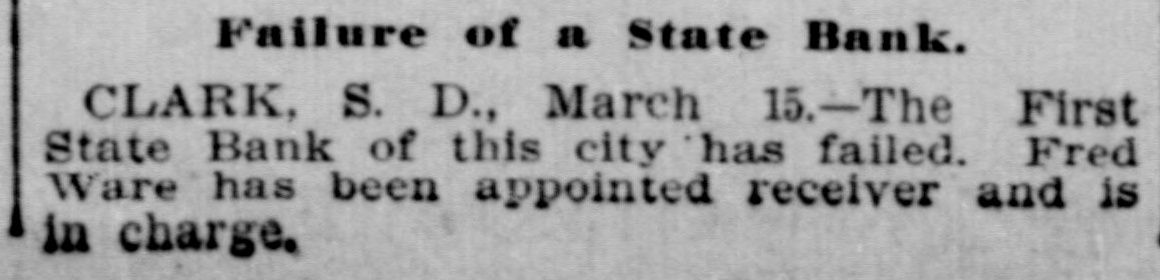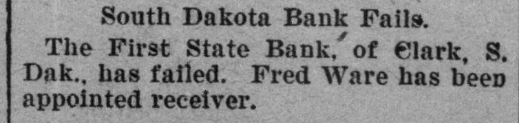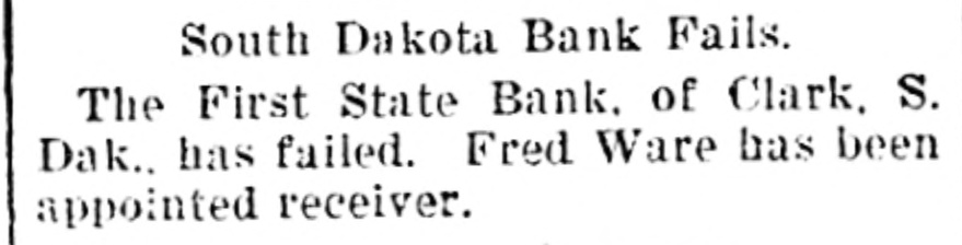 South Dakota Bank Fails. The First State Bank, of Clark, S. Dak., has failed. Fred Ware has been appointed receiver.
