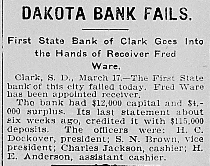 DAKOTA BANK FAILS. First State Bank of Clark Goes Into the Hands of Receiver Fred Ware. Clark, S. D., March 17.-The First State bank of this city falled today. Fred Ware has been appointed receiver. The bank had $12,000 capital and $4,000 surplus. Its last statement about six weeks ago, credited it with $115,000 deposits. The officers were: H. C. Dockover, president; S. N. Brown, vice president; Charles Jackson, cashier; H. E. Anderson, assistant cashier.
