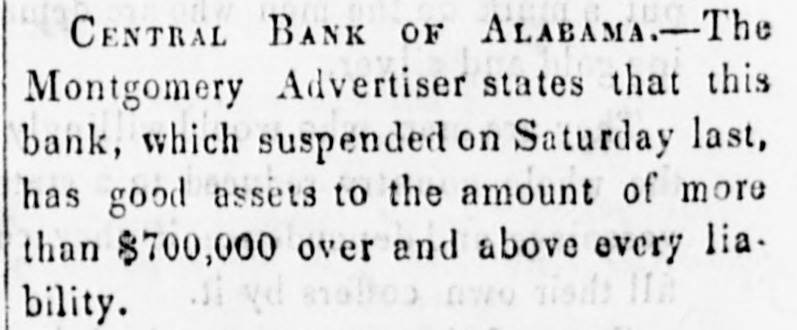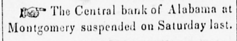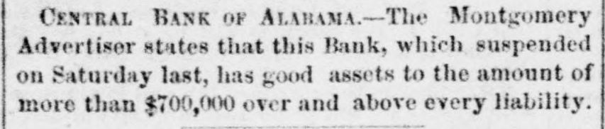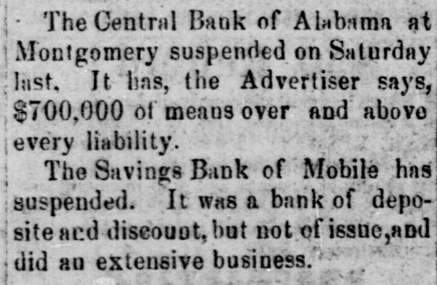 The Central Bank of Alabama at Montgomery suspended on Saturday last, It has, the Advertiser says, $700,000 of means over and above every liability. The Savings Bank of Mobile has suspended. It Was a bank of deposite and discount, but not of issue,and did an extensive business.