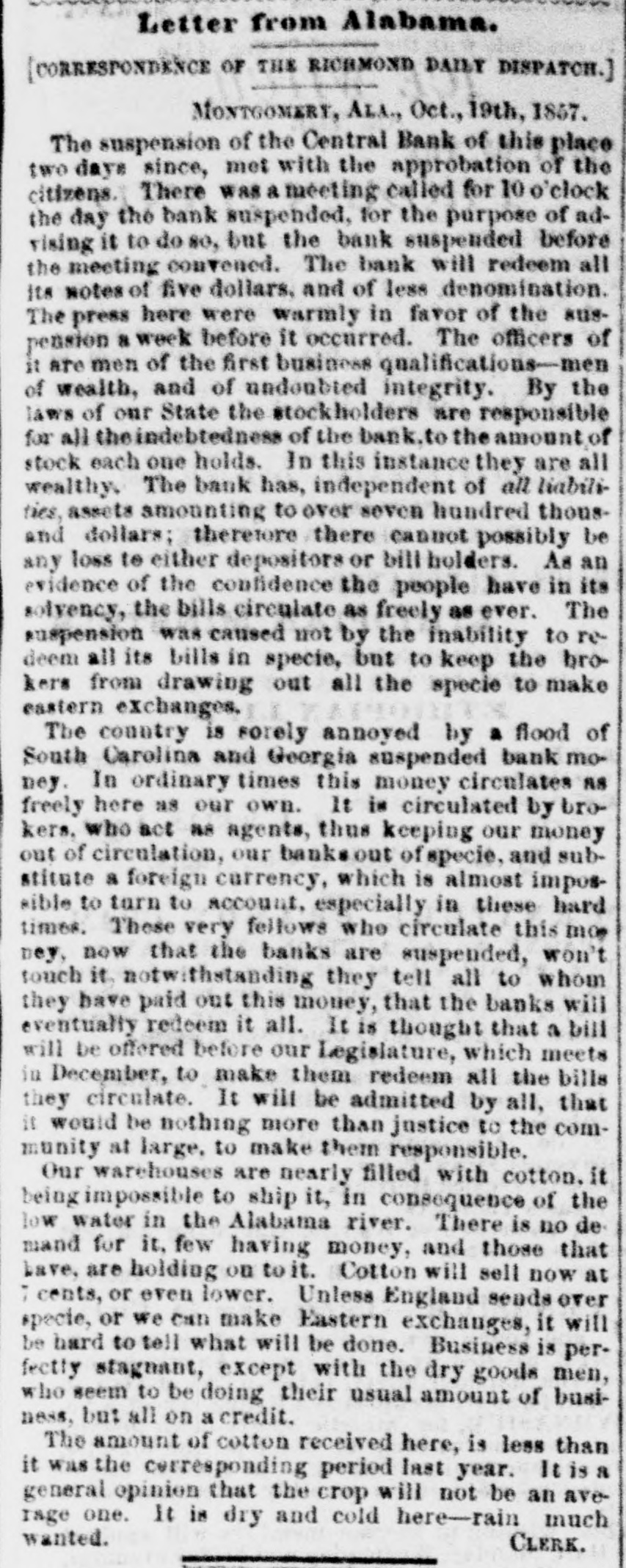 Letter from Alabama. [CORRESPONDENCE OF THE RICHMOND DAILY DISPATCH.] MONTGOMERY, ALA., Oct., 19th, 1857. The suspension of the Central Bank of this place two days since, met with the approbation of the citizens. There was a meeting called for 10 o'clock the day the bank suspended, for the purpose of advising it to do so, but the bank suspended before the meeting convened. The bank will redeem all its notes of five dollars, and of less denomination. The press here were warmly in favor of the suspension a week before it occurred. The officers of it are men of the first business qualifications-men of wealth, and of undoubted integrity. By the laws of our State the stockholders are responsible for all the indebtedness of the bank to the amount of stock each one holds. In this instance they are all wealthy, The bank has, independent of all liabilities, assets amounting to over soven hundred thousand dollars; therefore there cannot possibly be any loss to either depositors or bill holders. As an evidence of the confidence the people have in its solvency, the bills circulate as freely as ever. The suspension was caused not by the inability to redeem all its bills in specie, but to keep the brokers from drawing out all the specie to make eastern exchanges, The country is sorely annoyed by a flood of South Carolina and Georgia suspended bank money. In ordinary times this money circulates as freely here as our own. It is circulated by brokers. who act as agents, thus keeping our money out of circulation, our banks out of specie, and substitute a foreign currency, which is almost impossible to turn to account. especially in these hard times. These very fellows who circulate this moe mey, now that the banks are suspended, won't touch it notwithstanding they tell all to whom they have paid out this money, that the banks will eventually redeem it all. It is thought that a bill will be offered before our Legislature, which meets in December, to make them redeem all the bills they circulate. It will be admitted by all, that it would be nothing more than justice to the community at large, to make them responsible. Our warehouses are nearly filled with cotton. it being impossible to ship it, in consequence of the low water in the Alabama river. There is no de mand for it. few having money, and those that have, are holding on to it. Cotton will sell now at : cents, or even lower. Unless England sends over specie, or we can make Eastern exchanges, it will be hard to tell what will be done. Business is perfectly stagnant, except with the dry goods men, who seem to be doing their usual amount of business, but all on a credit. The amount of cotton received here, is less than it was the corresponding period last year. It is a general opinion that the crop will not be an average one. It is dry and cold here-rain much wanted. CLERK.