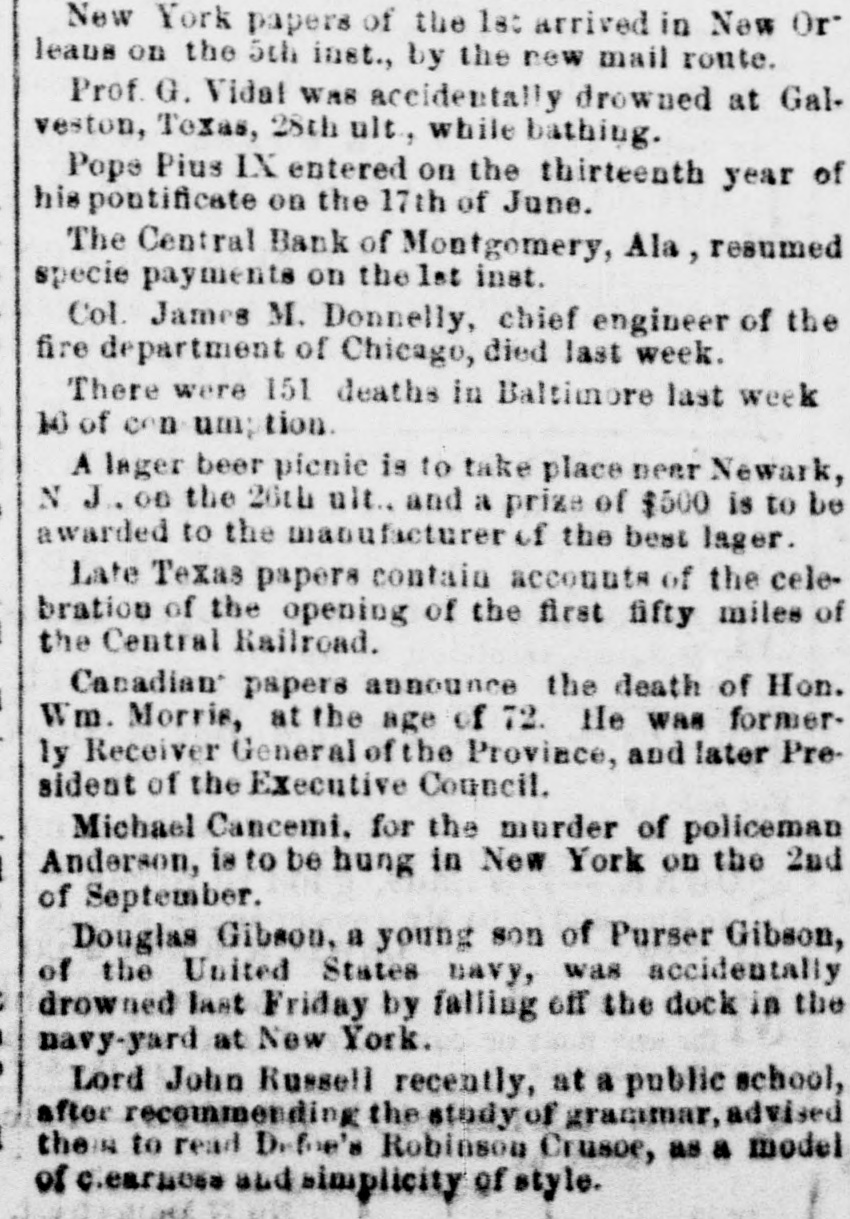 New York papers of the 1st arrived in New Or leaus on the 5th inst., by the new mail route. Prof. G. Vidal Was accidentally drowned at Galveston, Texas, 28th ult, while bathing. Pops Pius IX entered on the thirteenth year of his pontificate on the 17th of June. The Central Bank of Montgomery, Ala, resumed specie payments on the 1st inst. Col. James M. Donnelly, chief engineer of the fire department of Chicago, died last week. There were 151 deaths in Baltimore last week 10 of con um; tion. A lager beer pienie is to take place near Newark, N J.. on the 20th ult., and a prize of $500 is to be awarded to the manufacturer of the best lager. Late Texas papers contain accounts of the celebration of the opening of the first fifty miles of the Central Railroad. Canadian papers assounce the death of Hon. Wm. Morris, at the age of 72. He was formerly Receiver General of the Province, and later President of the Executive Council. Michael Cancemi. for the murder of policeman Anderson, is to be hung in New York on the 2nd of September. Douglas Gibson, a young son of Purser Gibson, of the United States navy, was accidentally drowned last Friday by falling off the dock in the navy-yard at New York. Lord John Russell recently, at a public school, after recommending the study of grammar, advised them to read Defoe's Robinson Crusoe, as a model of clearmoss and simplicity of style.