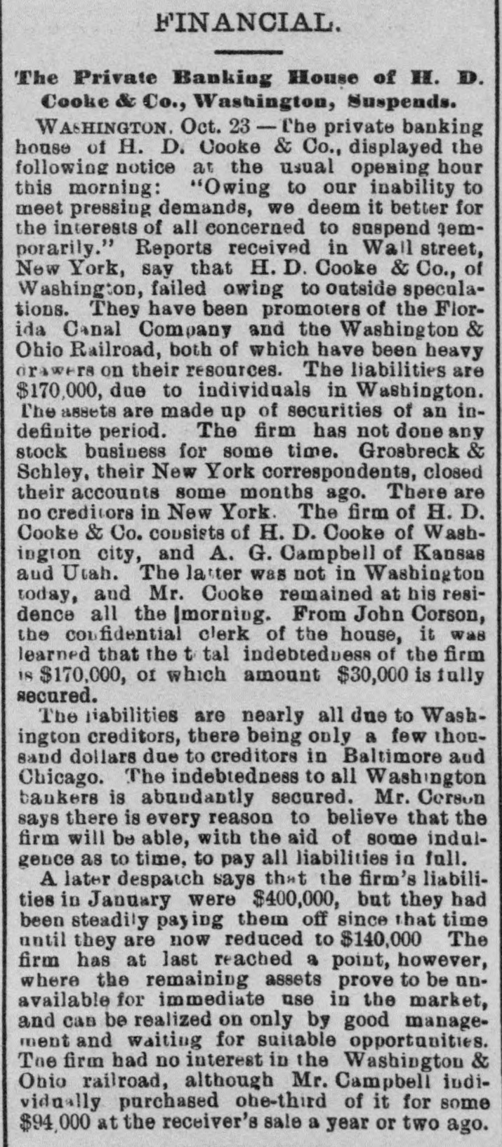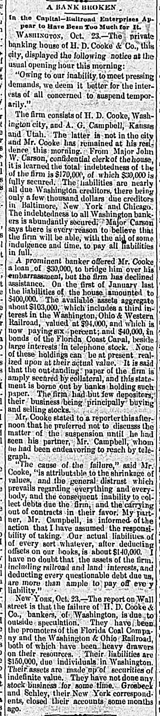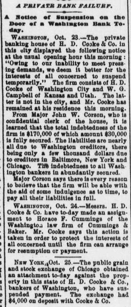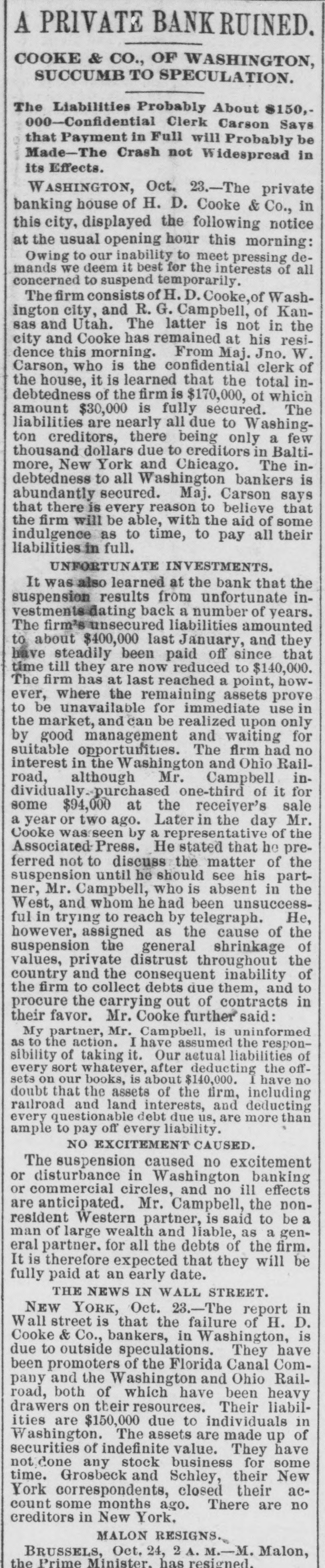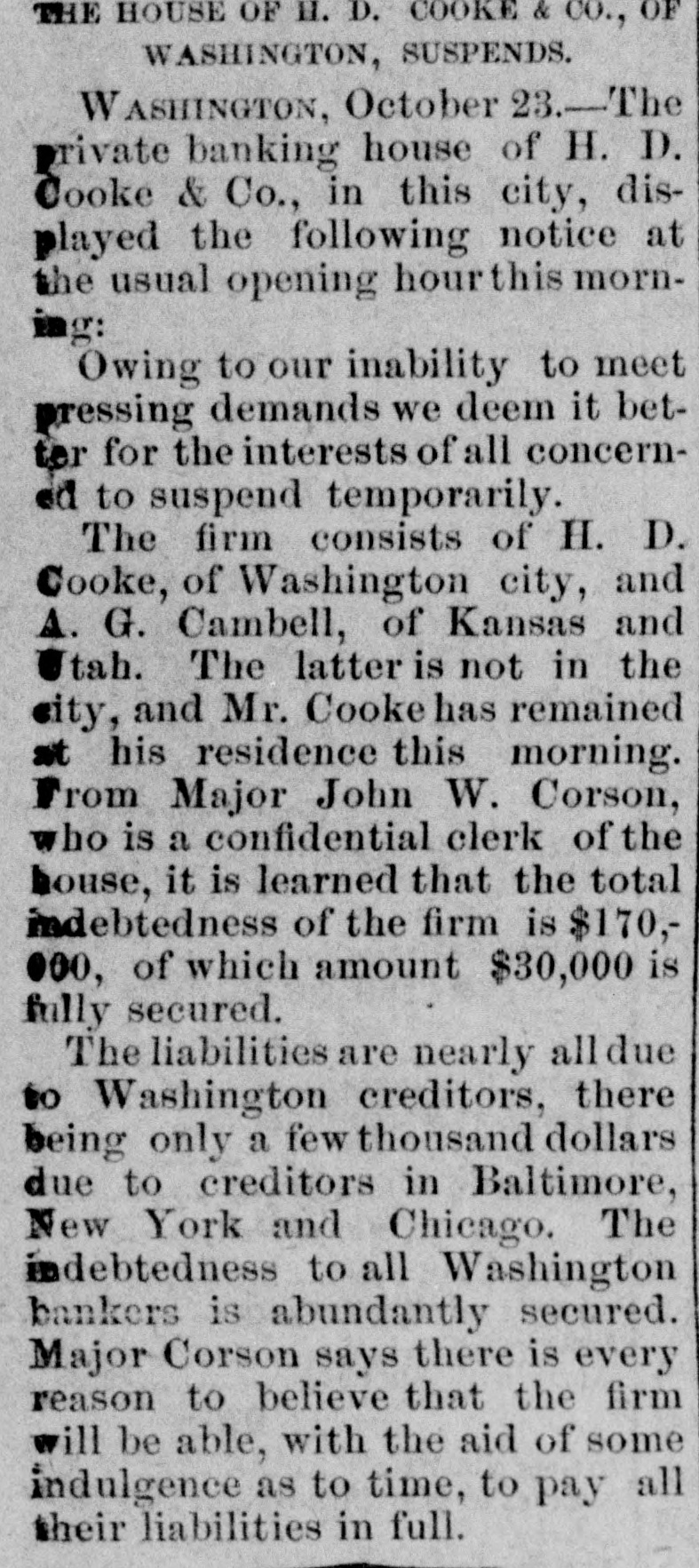 TWO CENTS. card it as the last of these failures here. It is the last of the weak banks. All of the banks now are strong and in excellent condition. I speak, of course of the recognized banking institutions WHAT BANKER BATEMAN SAYS Mr. Bateman, the banker, says: "Mr. Cooke has the earnest sympathy or all the bankers in the city. I have no doubt from what I know of Mr. Cooke's affairs that the assets far exceed the liabilities, and his suspension, in my opinion, will be but temporary. The failure of Middleton & Co. and Squier & Co. has to some extent affected all the private banks in the District, and the general distrust and panic has caused a gradual but steady decline in deposits. The banks of the city will lose nothing. I am satisfied. when all the facts are known, Mr. Cooke's conduct will be judged highly honorable in all respects." NO EXCITEMENT AT THE DOWN-TOWN BANKS. The announcement of the suspension down town caused little excitement, and some of the banking houses were unaware of it as late as 11 o'clock. The banks on 7th street-the Second National, the National Bank of the Republic, the Central National, and the Bank of Washington-were found quietly doing their usual business this afternoon. being entrely unaffected by the rumor. Mr. Norment, of the Central National, said that the National and other down-town banks were not the least affected by the suspension, and he saw no reason whatever to doubt the stability of the down-town banks. This sentiment was voiced by officers of the other banks. A HISTORY OF THE FIRM. The firm of H. D. Cooke & Co., which suspended to-day, was established in 1873. The name of Cooke has been intimately identified with the banking interests of the city for many years. Mr. Henry D. Cooke was a son of the late Henry D. Cooke, and a nephew of Jay Cooke, the once celebrated banker. Mr. Henry D. Cooke, sr., was a member of the banking firm of Jay Cooke & Co., which falled in September, 1873, causing one of the most memorable financial panies ever experienced in this country. He was also president of the First National bank of this city, which was located on 15th street, and which fell in the crash that followed the Jay Cooke failure. He was highly esteemed as a citizen, and when the territorial form of government for the District was adopted, in 1871, was appointed as the first governor of the District, in which office he was succeeded by Alex. R. Shepherd. Mr. Cooke, Sr., died about four years ago. Mr. Henry D. Cooke, jr., was assistant cashier in the First National bank under the presidency of his father. About a year after the failure in 1873 be began banking busine-s for himself, being first associated with Mr. John Sherman, a nephew of Senator Sherman. Subsequently he was in business with Mr. Lester A. Bartiett and other gentlemen, the name of the firm being H. D. Cooke & Co. He formed his present partnership about a year ago. Mr. Cooke has been considered as one of the ablestand brightest of the young business men of the city. He has always been very popular, and his present reverses have called forth expressions of sympathy from every side. When the condition of his affairs became known this morning the sum of $30,000 was tendered by bankers to tide him over his difficulties, but was declined. The firm, It is stated, had no connection with any New York house, such as would involve it in the suspension. The business has been largely a brokerage business, and it is said the largest creditors are persons who have been speculating through the firm. Mr. Cooke was in New York yesterday, and coming home on the train seemed to be in such good spirits as to preclude the idea that he had any knowledge that the house would close. At the depot he was met by Mr. Corson.