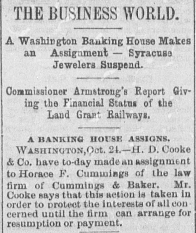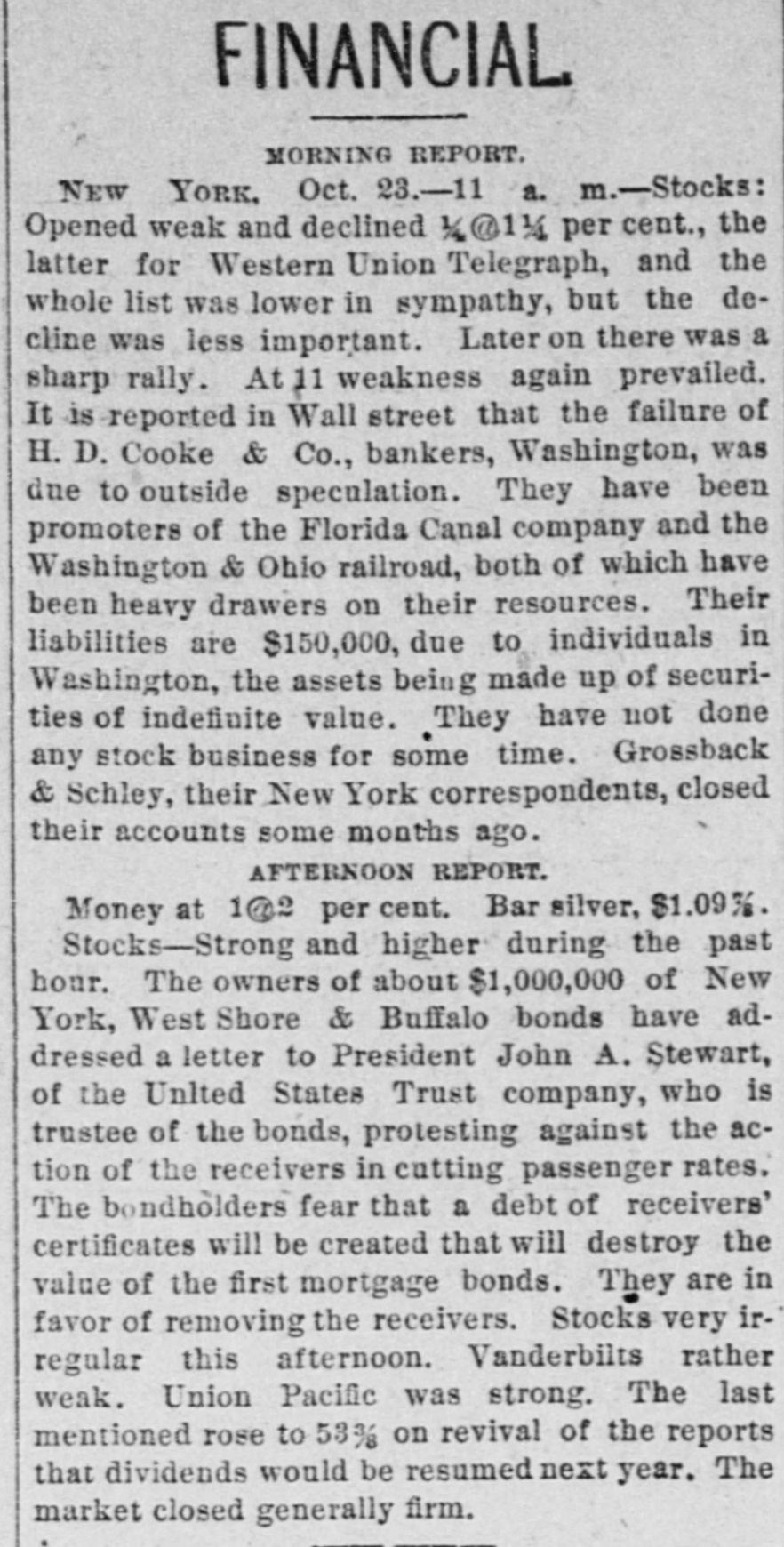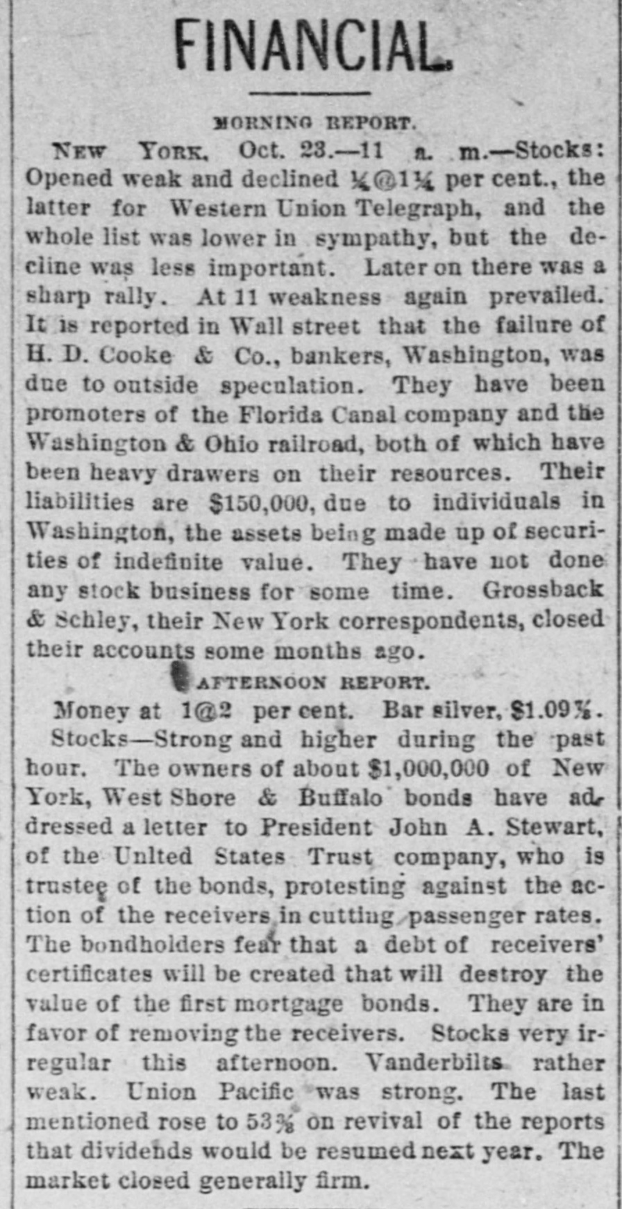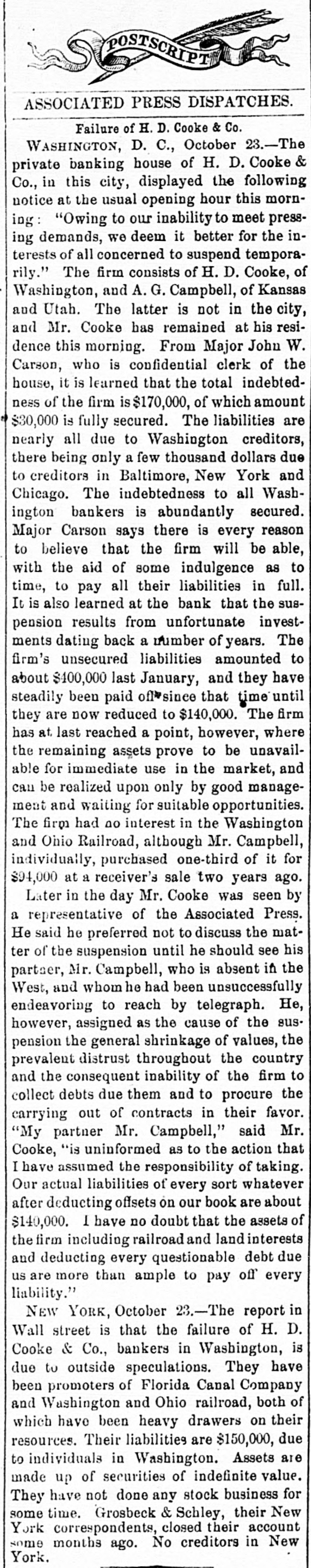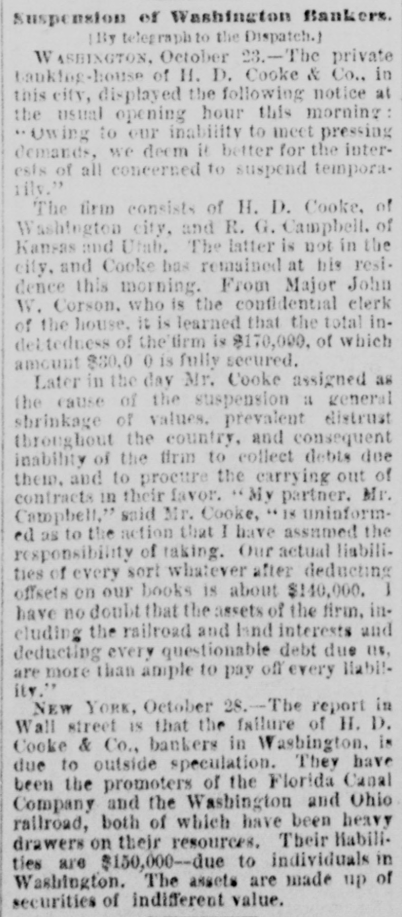 TWO CENTS. card it as the last of these failures here. It is the last of the weak banks. All of the banks now are strong and in excellent condition. I speak, of course of the recognized banking institutions WHAT BANKER BATEMAN SAYS Mr. Bateman, the banker, says: "Mr. Cooke has the earnest sympathy or all the bankers in the city. I have no doubt from what I know of Mr. Cooke's affairs that the assets far exceed the liabilities, and his suspension, in my opinion, will be but temporary. The failure of Middleton & Co. and Squier & Co. has to some extent affected all the private banks in the District, and the general distrust and panic has caused a gradual but steady decline in deposits. The banks of the city will lose nothing. I am satisfied. when all the facts are known, Mr. Cooke's conduct will be judged highly honorable in all respects." NO EXCITEMENT AT THE DOWN-TOWN BANKS. The announcement of the suspension down town caused little excitement, and some of the banking houses were unaware of it as late as 11 o'clock. The banks on 7th street-the Second National, the National Bank of the Republic, the Central National, and the Bank of Washington-were found quietly doing their usual business this afternoon. being entrely unaffected by the rumor. Mr. Norment, of the Central National, said that the National and other down-town banks were not the least affected by the suspension, and he saw no reason whatever to doubt the stability of the down-town banks. This sentiment was voiced by officers of the other banks. A HISTORY OF THE FIRM. The firm of H. D. Cooke & Co., which suspended to-day, was established in 1873. The name of Cooke has been intimately identified with the banking interests of the city for many years. Mr. Henry D. Cooke was a son of the late Henry D. Cooke, and a nephew of Jay Cooke, the once celebrated banker. Mr. Henry D. Cooke, sr., was a member of the banking firm of Jay Cooke & Co., which falled in September, 1873, causing one of the most memorable financial panies ever experienced in this country. He was also president of the First National bank of this city, which was located on 15th street, and which fell in the crash that followed the Jay Cooke failure. He was highly esteemed as a citizen, and when the territorial form of government for the District was adopted, in 1871, was appointed as the first governor of the District, in which office he was succeeded by Alex. R. Shepherd. Mr. Cooke, Sr., died about four years ago. Mr. Henry D. Cooke, jr., was assistant cashier in the First National bank under the presidency of his father. About a year after the failure in 1873 be began banking busine-s for himself, being first associated with Mr. John Sherman, a nephew of Senator Sherman. Subsequently he was in business with Mr. Lester A. Bartiett and other gentlemen, the name of the firm being H. D. Cooke & Co. He formed his present partnership about a year ago. Mr. Cooke has been considered as one of the ablestand brightest of the young business men of the city. He has always been very popular, and his present reverses have called forth expressions of sympathy from every side. When the condition of his affairs became known this morning the sum of $30,000 was tendered by bankers to tide him over his difficulties, but was declined. The firm, It is stated, had no connection with any New York house, such as would involve it in the suspension. The business has been largely a brokerage business, and it is said the largest creditors are persons who have been speculating through the firm. Mr. Cooke was in New York yesterday, and coming home on the train seemed to be in such good spirits as to preclude the idea that he had any knowledge that the house would close. At the depot he was met by Mr. Corson.