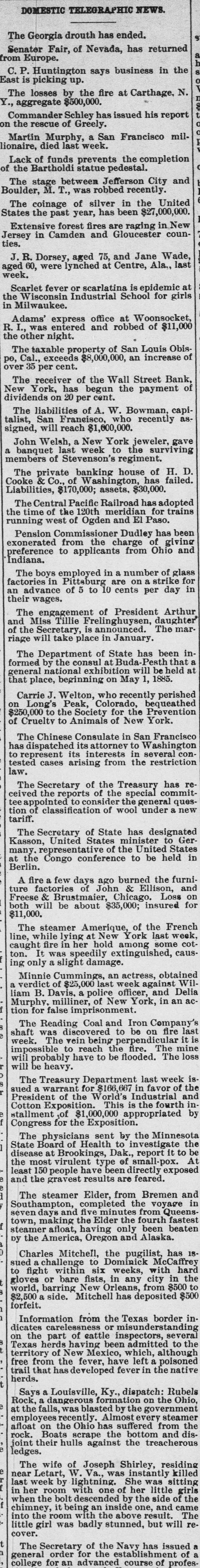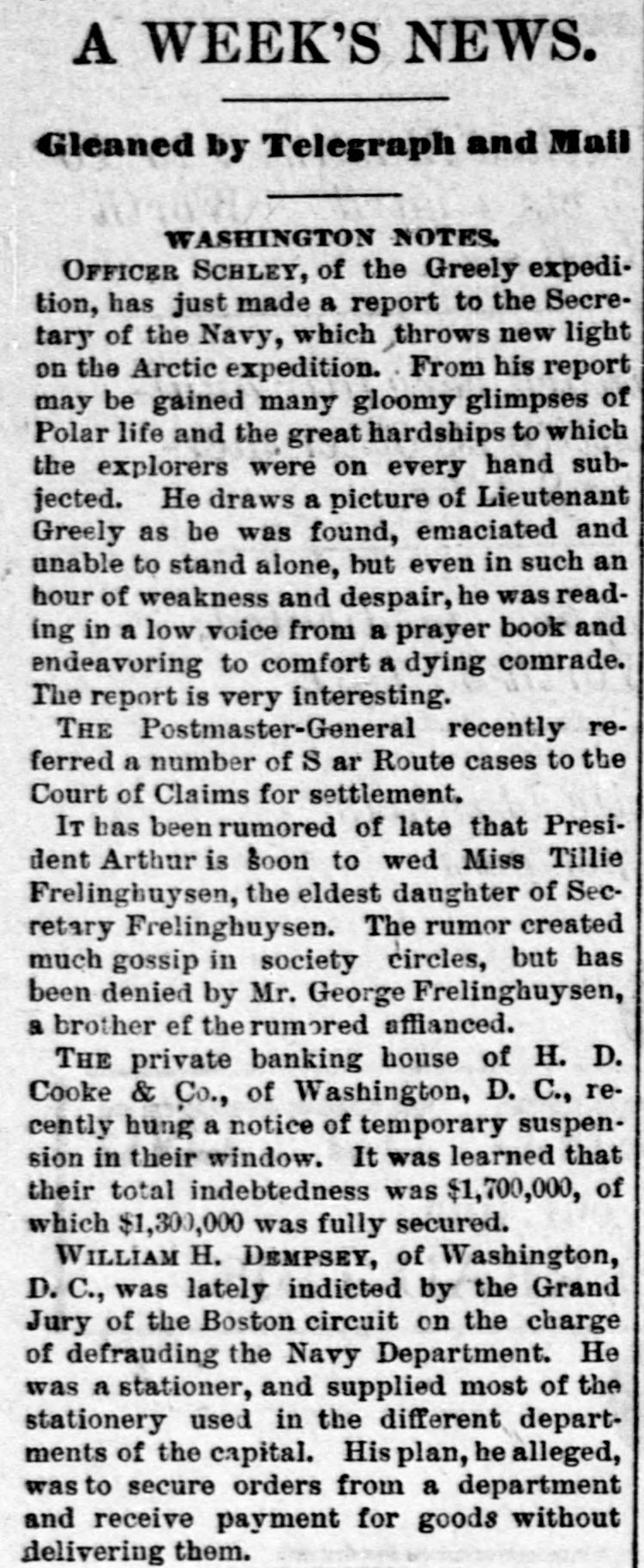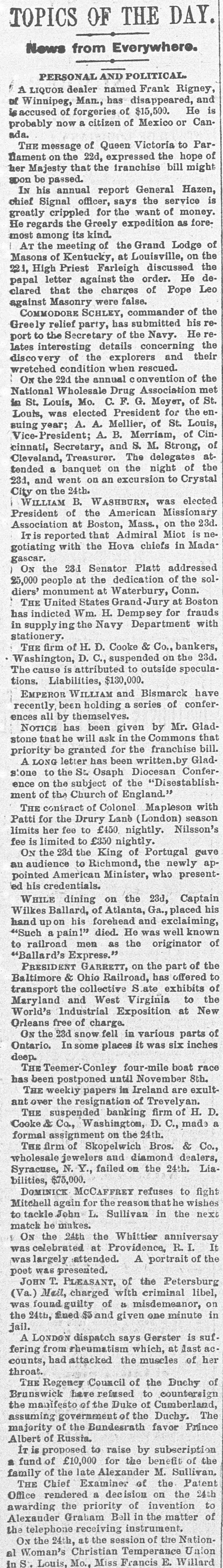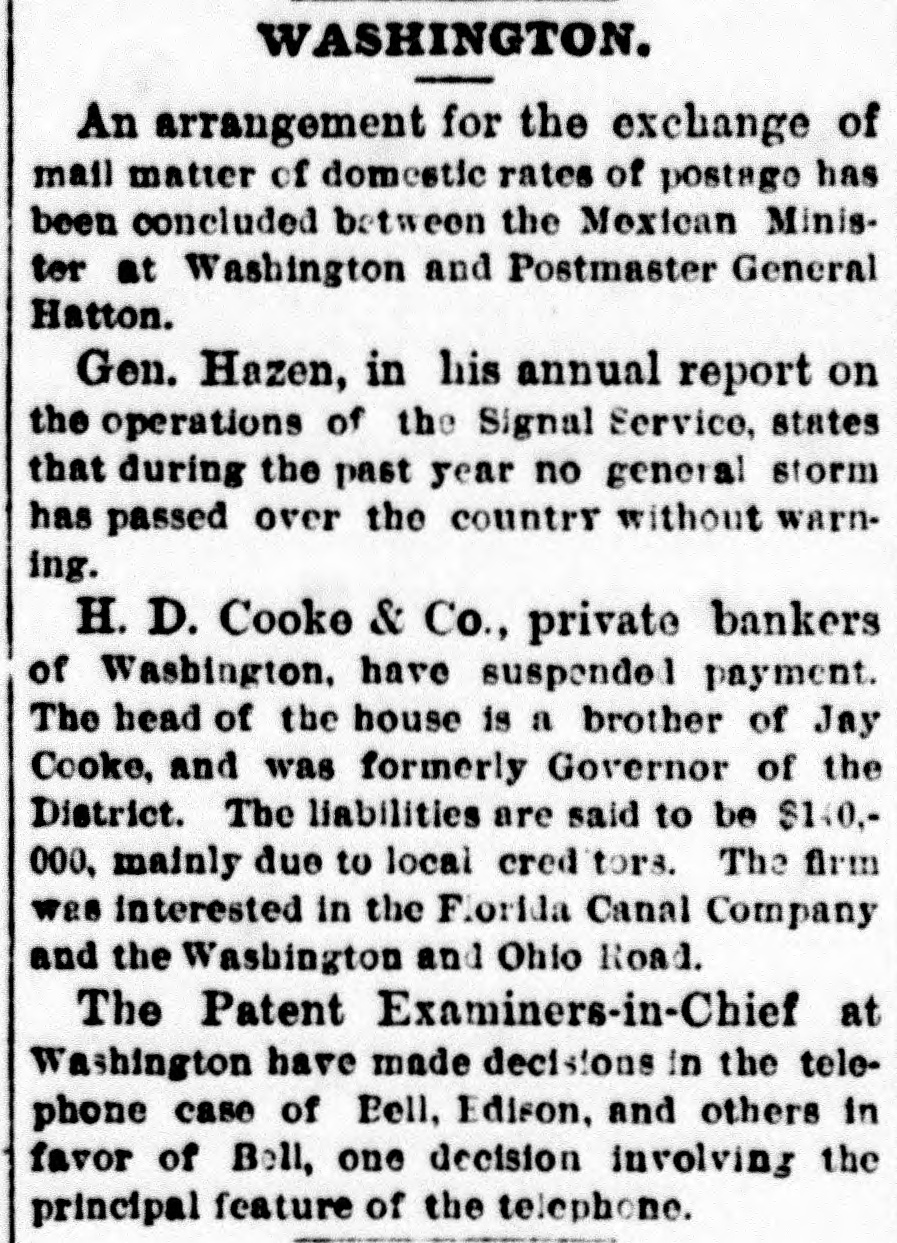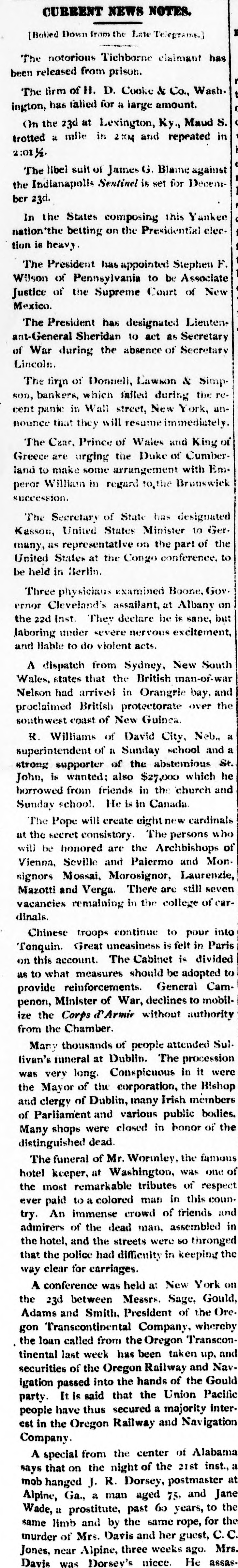 TWO CENTS. card it as the last of these failures here. It is the last of the weak banks. All of the banks now are strong and in excellent condition. I speak, of course of the recognized banking institutions WHAT BANKER BATEMAN SAYS Mr. Bateman, the banker, says: "Mr. Cooke has the earnest sympathy or all the bankers in the city. I have no doubt from what I know of Mr. Cooke's affairs that the assets far exceed the liabilities, and his suspension, in my opinion, will be but temporary. The failure of Middleton & Co. and Squier & Co. has to some extent affected all the private banks in the District, and the general distrust and panic has caused a gradual but steady decline in deposits. The banks of the city will lose nothing. I am satisfied. when all the facts are known, Mr. Cooke's conduct will be judged highly honorable in all respects." NO EXCITEMENT AT THE DOWN-TOWN BANKS. The announcement of the suspension down town caused little excitement, and some of the banking houses were unaware of it as late as 11 o'clock. The banks on 7th street-the Second National, the National Bank of the Republic, the Central National, and the Bank of Washington-were found quietly doing their usual business this afternoon. being entrely unaffected by the rumor. Mr. Norment, of the Central National, said that the National and other down-town banks were not the least affected by the suspension, and he saw no reason whatever to doubt the stability of the down-town banks. This sentiment was voiced by officers of the other banks. A HISTORY OF THE FIRM. The firm of H. D. Cooke & Co., which suspended to-day, was established in 1873. The name of Cooke has been intimately identified with the banking interests of the city for many years. Mr. Henry D. Cooke was a son of the late Henry D. Cooke, and a nephew of Jay Cooke, the once celebrated banker. Mr. Henry D. Cooke, sr., was a member of the banking firm of Jay Cooke & Co., which falled in September, 1873, causing one of the most memorable financial panies ever experienced in this country. He was also president of the First National bank of this city, which was located on 15th street, and which fell in the crash that followed the Jay Cooke failure. He was highly esteemed as a citizen, and when the territorial form of government for the District was adopted, in 1871, was appointed as the first governor of the District, in which office he was succeeded by Alex. R. Shepherd. Mr. Cooke, Sr., died about four years ago. Mr. Henry D. Cooke, jr., was assistant cashier in the First National bank under the presidency of his father. About a year after the failure in 1873 be began banking busine-s for himself, being first associated with Mr. John Sherman, a nephew of Senator Sherman. Subsequently he was in business with Mr. Lester A. Bartiett and other gentlemen, the name of the firm being H. D. Cooke & Co. He formed his present partnership about a year ago. Mr. Cooke has been considered as one of the ablestand brightest of the young business men of the city. He has always been very popular, and his present reverses have called forth expressions of sympathy from every side. When the condition of his affairs became known this morning the sum of $30,000 was tendered by bankers to tide him over his difficulties, but was declined. The firm, It is stated, had no connection with any New York house, such as would involve it in the suspension. The business has been largely a brokerage business, and it is said the largest creditors are persons who have been speculating through the firm. Mr. Cooke was in New York yesterday, and coming home on the train seemed to be in such good spirits as to preclude the idea that he had any knowledge that the house would close. At the depot he was met by Mr. Corson.