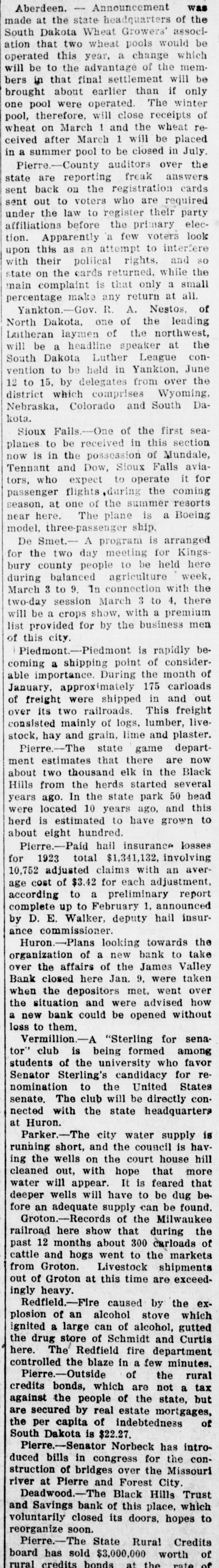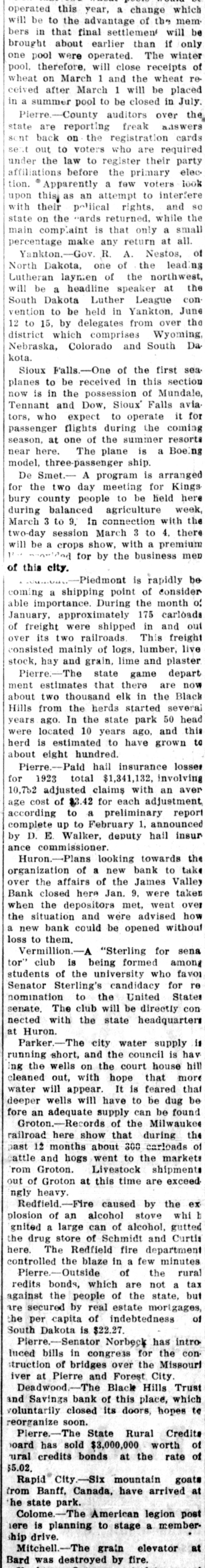 brought about earlier than if only one pool were operated. The winter pool, therefore, will close receipts of wheat on March 1 and the wheat received after March 1 will be placed a summer pool to be closed in July. Pierre.-County auditors over the state are reporting freak answers sent back on the registration cards sent out to voters who are required under the law to register their party affiliations before the primary election. Apparently a few voters look upon this as an attempt to interfere with their poliical rights, and SO state on the cards returned, while the main complaint is that only a small percentage make any return at all. Yankton.-Gov. R. A. Nestos, of North Dakota, one of the leading Laitheran laymen of the northwest, will be a headline speaker at the South Dakota Luther League convention to be held in Yankton, June 12 to 15, by delegates from over the district which comprises Wyoming, Nebraska, Colorado and South Dakota. Sioux Falls.-One of the first seaplanes to be received in this section now is in the possession of Mundale, Tennant and Dow, Sioux Falls aviators, who expect to operate it for passenger flights ,during the coming season, at one of the summer resorts near here. The plane is a Boeing model, three-passenger ship. De Smet.- A program is arranged for the two day meeting for Kingsbury county people to be held here during balanced agriculture week, March 3 to 9. In connection with the two-day session March 3 to 4, there will be a crops show, with a premium list provided for by the business men of this city. Piedmont.-Piedmont is rapidly becoming a shipping point of considerable importance. During the month of January, approximately 175 carloads of freight were shipped in and out over its two railroads. This freight consisted mainly of logs, lumber, livestock, hay and grain, lime and plaster. Pierre.-The state game department estimates that there are now about two thousand elk in the Black Hills from the herds started several years ago. In the state park 50 head were located 10 years ago, and this herd is estimated to have grown to about eight hundred. Pierre.-Paid hail insurance losses for 1923 total $1,341,132, involving 10,752 adjusted claims with an average cost of $3.42 for each adjustment, according to a preliminary report complete up to February 1, announced by D. E. Walker, deputy hail insurance commissioner. Huron.-Plans looking towards the organization of a new bank to take over the affairs of the James Valley Bank closed here Jan. 9, were taken when the depositors met. went over the situation and were advised how a new bank could be opened without loss to them. Vermillion.-A "Sterling for senator" club is being formed among students of the university who favor Senator Sterling's candidacy for renomination to the United States senate. The club will be directly connected with the state headquarters at Huron. Parker.-The city water supply is running short, and the council is having the wells on the court house hill cleaned out, with hope that more water will appear. It is feared that deeper wells will have to be dug before an adequate supply can be found. Groton.-Records of the Milwaukee railroad here show that during the past 12 months about 300 carloads of cattle and hogs went to the markets from Groton. Livestock shipments out of Groton at this time are exceedingly heavy. Redfield.-Fire caused by the explosion of an alcohol stove which ignited a large can of alcohol, gutted the drug store of Schmidt and Curtis here. The Redfield fire department controlled the blaze in a few minutes. Pierre.-Outside of the rural credits bonds, which are not a tax against the people of the state, but are secured by real estate mortgages, of the per capita of indebtedness South Dakota is $22.27. Pierre.-Senator Norbeck has introduced bills in congress for the construction of bridges over the Missouri river at Pierre and Forest City. Deadwood.-The Black Hills Trust and Savings bank of this place, which voluntarily closed its doors, hopes to reorganize soon. Pierre.-The State Rural Credits board has sold $3,000,000 worth of credits. rural