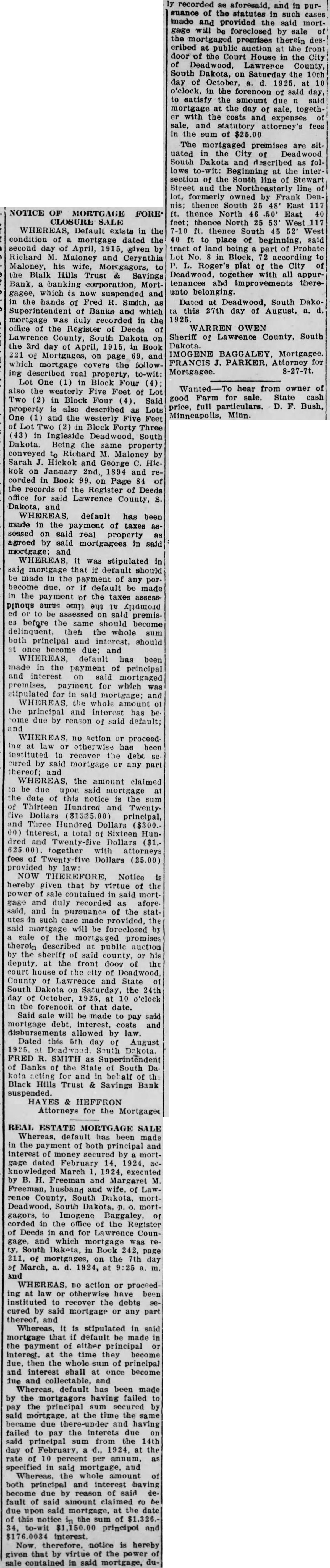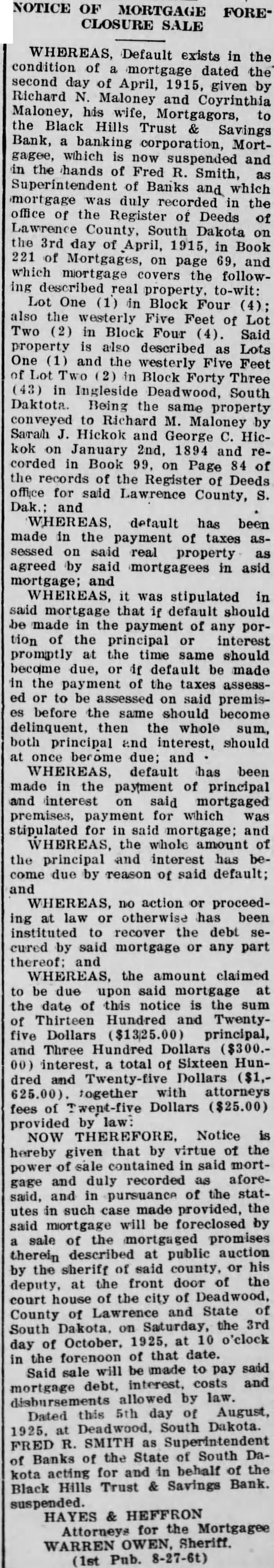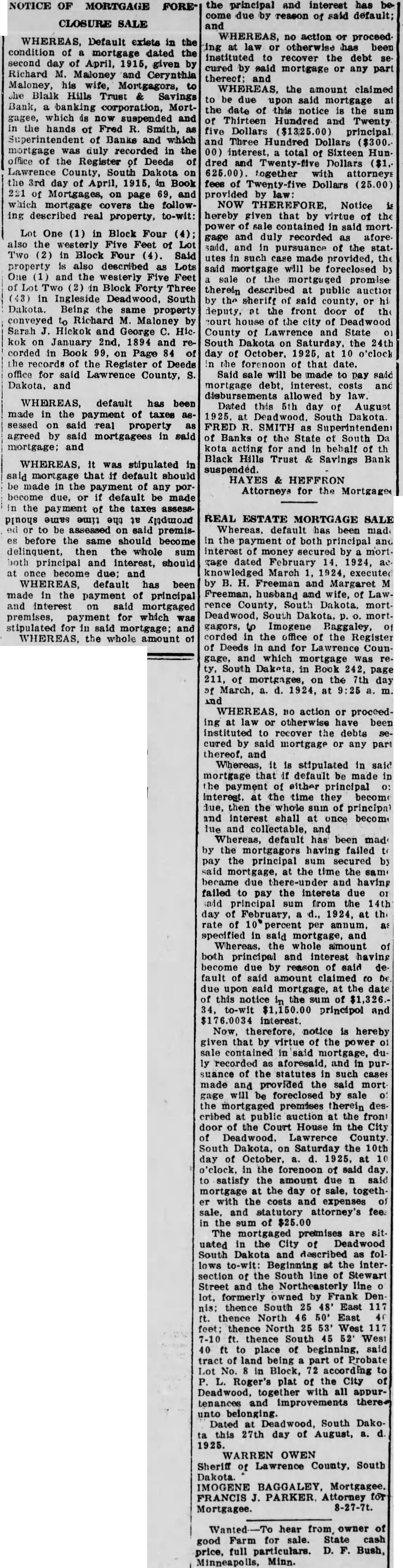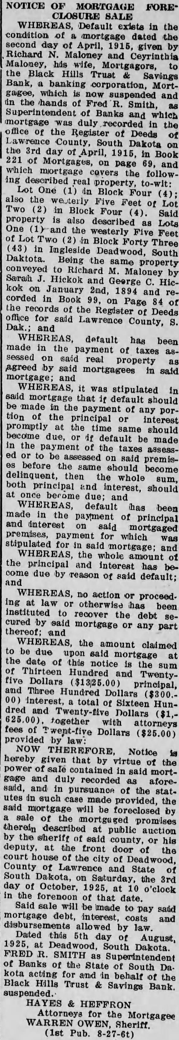 NOTICE OF MORTGAGE FORE* CLOSURE SALE WHEREAS, Default exists in the condition mortgage dated the second day April, given Richard Maloney and Coyrinthia Maloney, his Mortgagors, the Black Hills Trust Savings Bank, banking corporation, Mortgagee, which now suspended and the hands Fred Smith, Superintendent of Banks which duly recorded in the office of the Register of Deeds of South Dakota the 3rd day of April, 1915, Book 221 of on page 69, and which mortgage the followreal property. One Block Four also the Five Feet of Two (2) in Block Four Said property described Lots One and the westerly Feet Block Forty Three Ingleside Deadwood, South Daktota. Being the property conveyed Richard Maloney Sarah Hickok and George Hickok January 2nd, 1894 and corded in Book Page of the records of Register Deeds office for said Lawrence County, and WHEREAS, default has been made in the payment of taxes sessed on said real property agreed by said mortgagees in asid mortgage; and WHEREAS, mortgage that default should made the payment of any tion the interest promptly the time same should due, default made the payment the taxes to said premisbefore same should become delinquent, then the whole both principal and interest, should once become due; and WHEREAS, default has been made in the payment of principal and interest said mortgaged premises, payment which stipulated for in said mortgage; and WHEREAS, whole amount the principal and interest has due by reason of said default; and