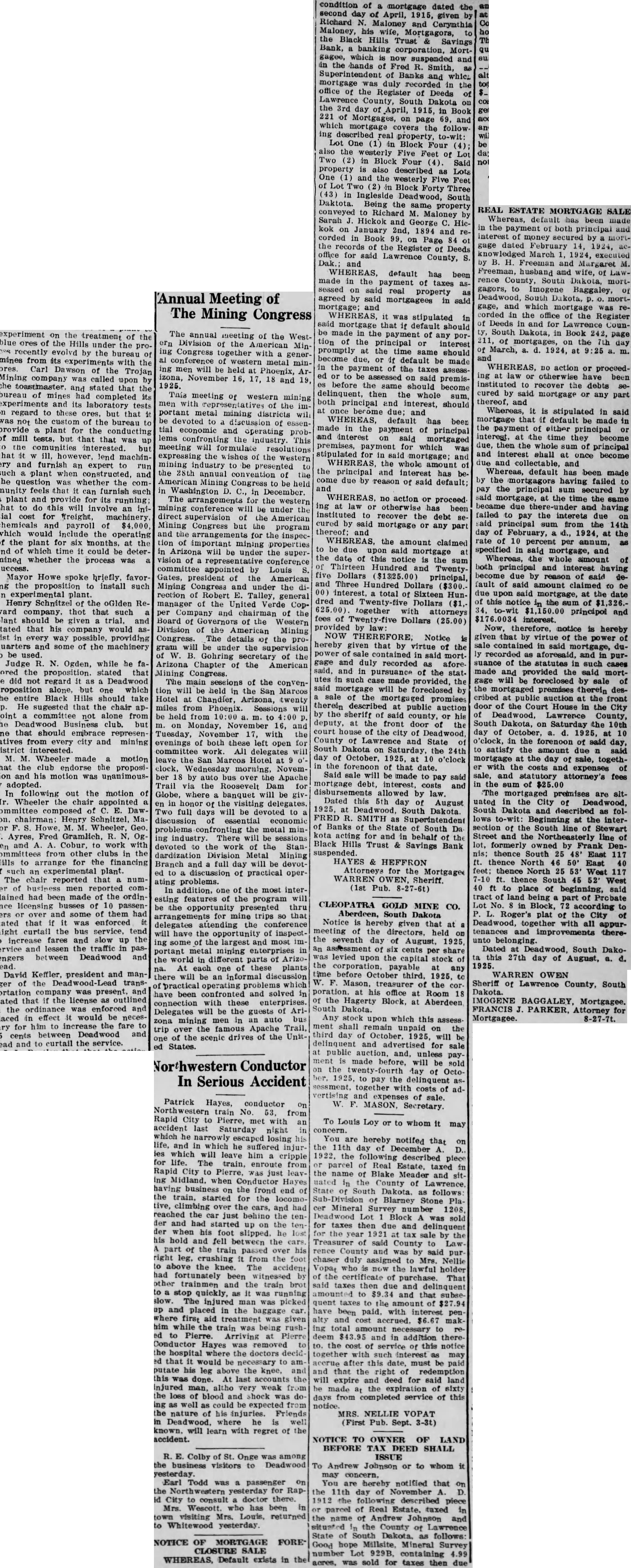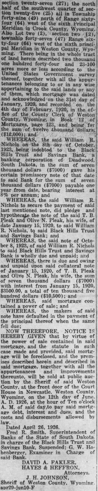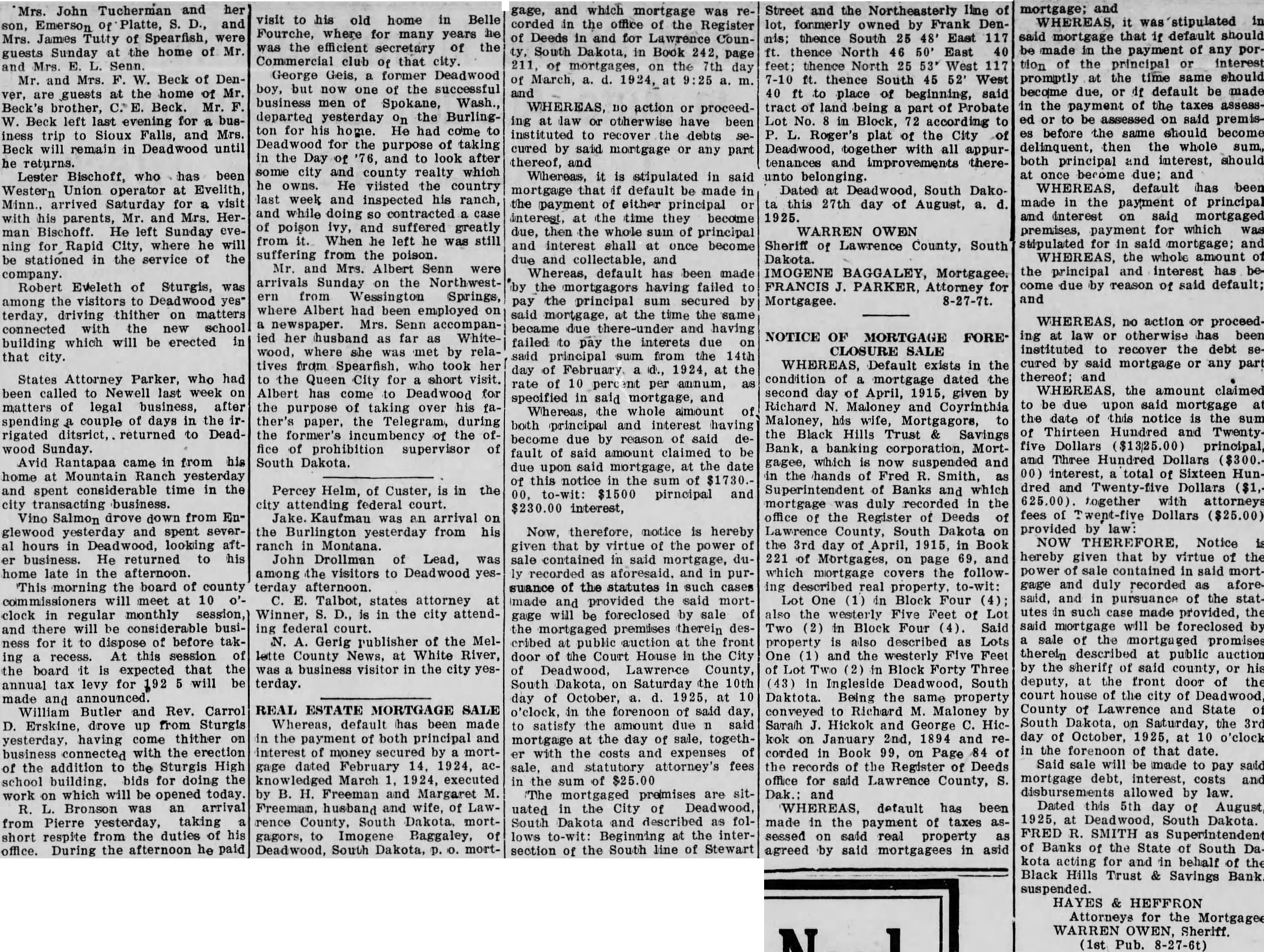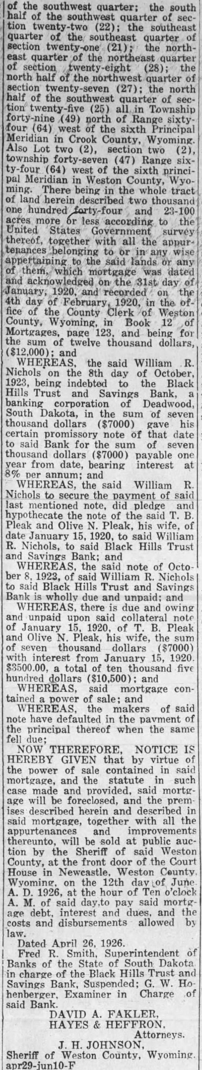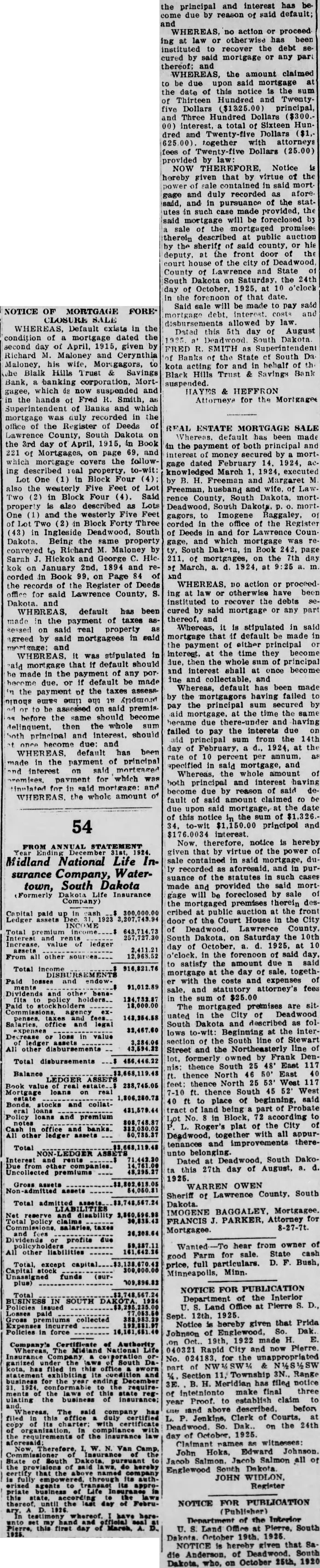 NOTICE OF MORTGAGE FORE* CLOSURE SALE WHEREAS, Default exists in the condition mortgage dated the second day April, given Richard Maloney and Coyrinthia Maloney, his Mortgagors, the Black Hills Trust Savings Bank, banking corporation, Mortgagee, which now suspended and the hands Fred Smith, Superintendent of Banks which duly recorded in the office of the Register of Deeds of South Dakota the 3rd day of April, 1915, Book 221 of on page 69, and which mortgage the followreal property. One Block Four also the Five Feet of Two (2) in Block Four Said property described Lots One and the westerly Feet Block Forty Three Ingleside Deadwood, South Daktota. Being the property conveyed Richard Maloney Sarah Hickok and George Hickok January 2nd, 1894 and corded in Book Page of the records of Register Deeds office for said Lawrence County, and WHEREAS, default has been made in the payment of taxes sessed on said real property agreed by said mortgagees in asid mortgage; and WHEREAS, mortgage that default should made the payment of any tion the interest promptly the time same should due, default made the payment the taxes to said premisbefore same should become delinquent, then the whole both principal and interest, should once become due; and WHEREAS, default has been made in the payment of principal and interest said mortgaged premises, payment which stipulated for in said mortgage; and WHEREAS, whole amount the principal and interest has due by reason of said default; and