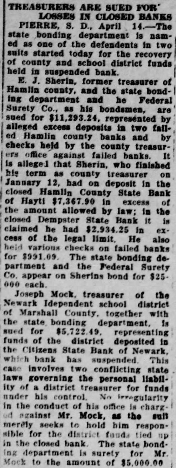 ARE SUED FOR' IN CLOSED BANKS PIERRE, April bonding department one defendents in suits started today for the and school district funds bank. Sherin, treasurer Hamlin county, and the state bonddepartment and he Federal Surety his bondsmen, sued for represented alleged excess deposits in two failHamlin county banks and checks held by the county treasuroffice against failed alleged that Sherin, who finished his term county treasurer January 12, had deposit the closed Hamlin County State Bank Hayti excess law; the closed Dempster State Bank claimed he had of the legal limit. He also on failed banks for The bonding department and the Federal Surety appear on Sherins bond for each. Joseph Mock, treasurer of the Idependent school district Marshall together with state bonding department, sued for representing funds of the district deposited Citizens State Bank Newark, bank has This involves conflicting state governing the personal liability district treasurer for funds under his the conduct of his office Mr. Mock, the hold him responthe district funds closed bank. The surety for Mr. Mock to the amount