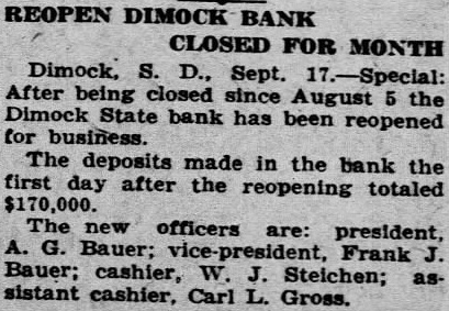 REOPEN DIMOCK CLOSED Dimock, S. Sept. After being closed August the Dimock State bank has been reopened business. The deposits made in the bank the first after the reopening totaled The new officers president, Bauer; Frank Bauer; cashier, Steichen; sistant cashier, Carl Gross.
