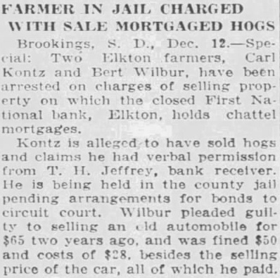 FARMER IN JAIL CHARGED WITH SALE MORTGAGED HOGS Brookings, D., Dec. 12.-SpeTwo Elkton Carl Kontz and Bert ilbur have been arrested on charges of selling prop erty on which the closed First Na tional bank, Elkton, holds chattel mortgages. Kontz is alleged to have sold hogs and claims he had verbal permission from T. H. Jeffrey, bank receiver He is being held in the county jail pending arrangements for bonds to circuit court Wilbur pleaded gull ty to selling an old automobile for $65 two years ago, and was fined $50 and costs of $28. besides the selling price of the car, all of which he paid.