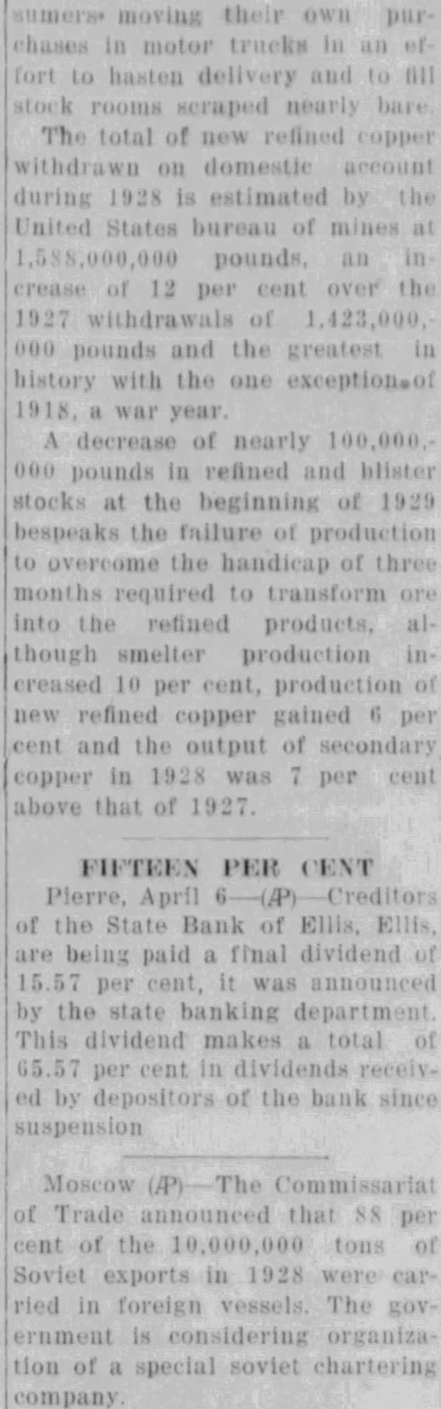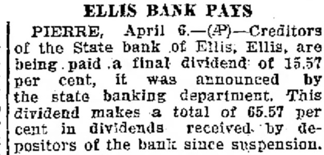 Pierre, April of the State Bank of Ellis, Ellis, being paid final dividend per cent, was announced by the state banking department This dividend makes total cent in dividends ed by depositors of the bank since suspension
