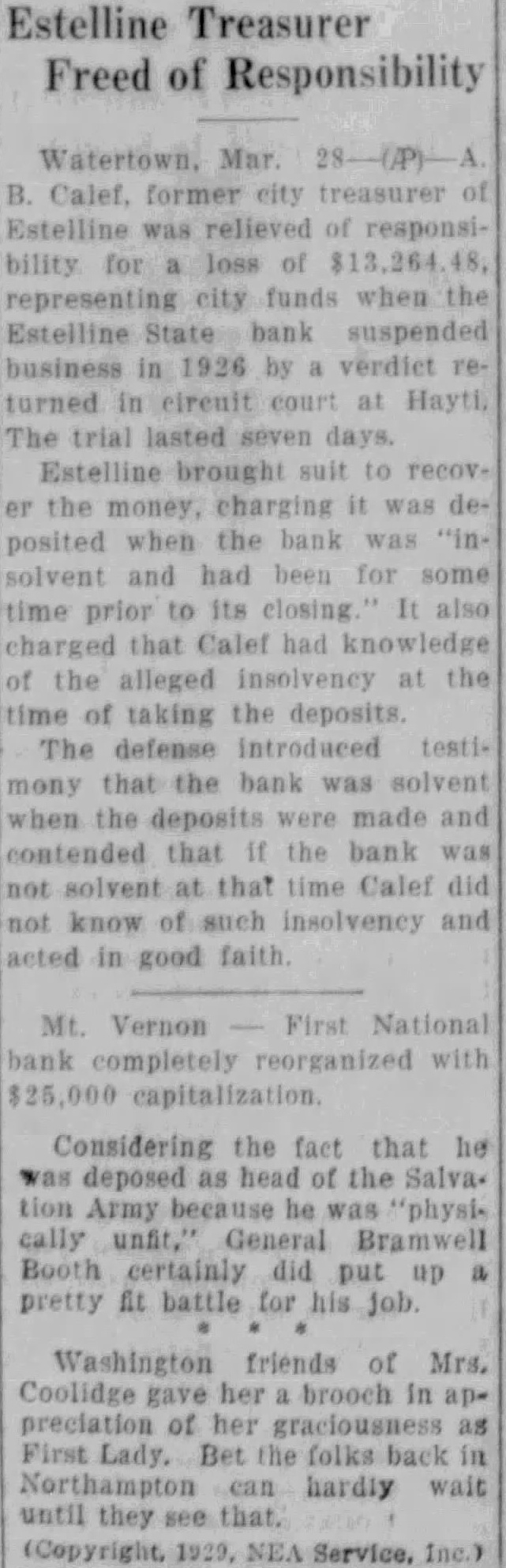 Estelline Treasurer Freed of Responsibility B. Calef. former city treasurer of Estelline was relieved of responsibility for loss of $13.264 48, representing city funds when the Estelline State bank suspended business in 1936 by verdict returned in circuit court at Hayti, The trial lasted seven days. Estelline brought suit to recover the money, charging it was deposited when the bank was "insolvent and had been for some time prior to its closing It also charged that Calef had knowledge of the alleged insolvency at the time of taking the deposits. The defense introduced testimony that the bank was solvent when the deposits were made and contended that if the bank was not solvent at that time Calef did not know of such insolvency and acted in good faith Mt. Vernon First National bank completely reorganized with Considering the fact that he was deposed as head of the Salvation Army because he was "physis cally unfit," General Bramwell Booth certainly did put up a pretty fit battle for his job Washington friends of Mrs. Coolidge gave her brooch in appreciation of her graciousness as First Lady. Bet the folks back in Northampton can hardly wait until they that.