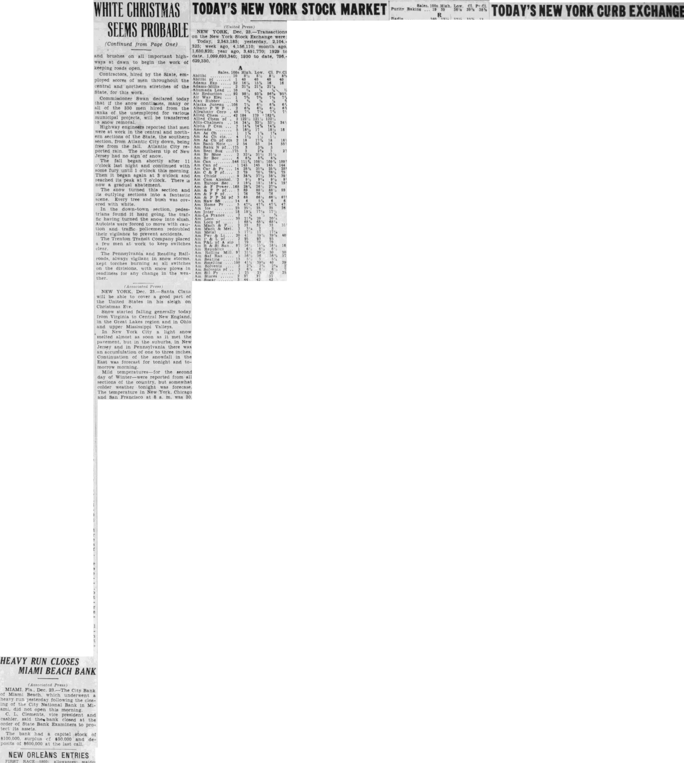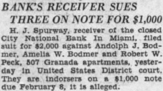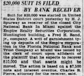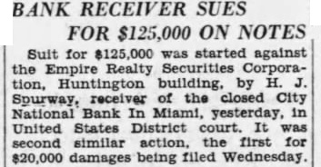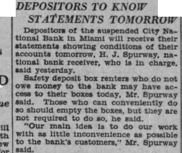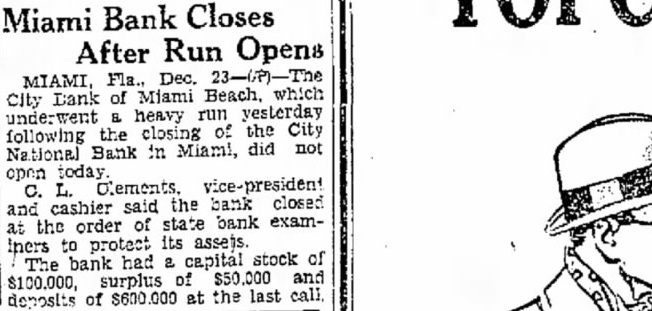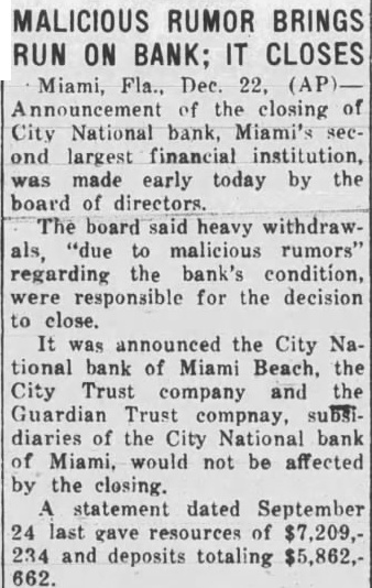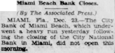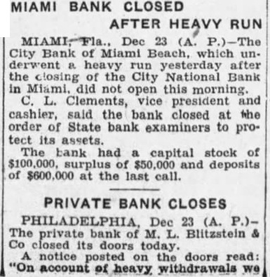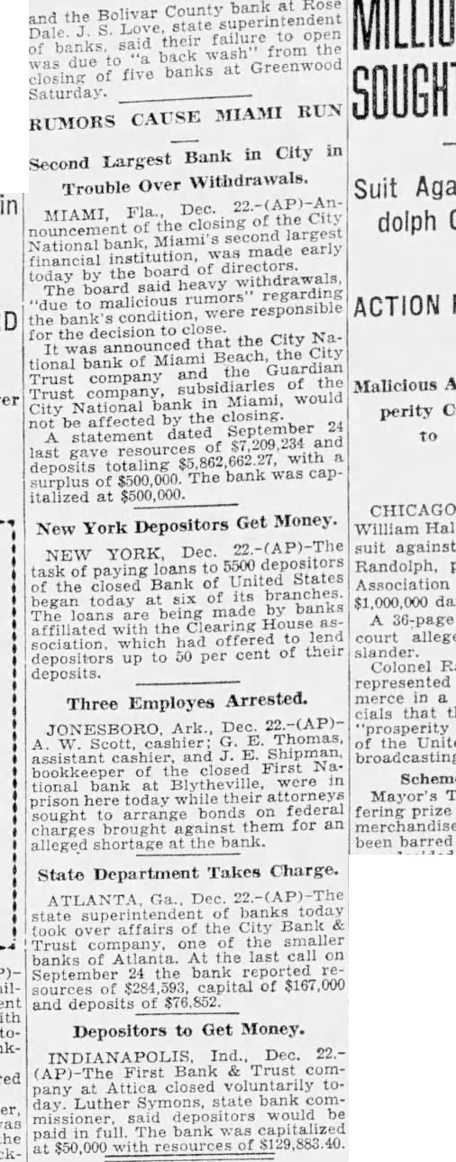 Miami, Fla.-(P)-The Bank of Bay Biscayne, with deposits of $15,037,198 as of the March 27 statement, and three affiliated financial institutions, failed to open for business Wednesday. A by directors of the bank attributed the closing to "resubstantial withdrawals.' The affiliated banks were the Biscayne Trust company, the Miami Beach Bank and Trust company, and the Bank of Coral Gables. The Bank of Bay Biscayne in its quarterly statement showed deposits of $15,037,198 and total resources of $17,182,292. J. H. Gilman is president of the bank. The Biscayne Trust company had $1,520,040 deposits and $1,962,14 resources. The Miami Beach Bank and Trust company had deposits of 943 and resources of $2,539,281 The Bank of Coral Gables, the third of the affiliated institutions, had deposits of $606,598 and resources of $743,759 Money Sent by Airplane E C. Romfh, president of the First National bank, said that $2,000,000 left Jacksonville by airplane Wednesday from the federal reserve depository there. He said the First National bank and its subsidiaries has money on hand to play all depositors, if necessary Depositors were orderly as they made withdrawals during the morning from other banks of the city and President Gilman said: "At meeting of the directors Wednesday morning, after consultation with the state comptroller, it was decided not to open this bank and its affiliated institutions, the Biscayne Trust company, Miami Beach Bank and Trust company and the Bank of Coral Gables, in order to protect all of our depositors to the fullest extent. "This decision was made after due consideration and was due to recent substantial withdrawals. Arthur W. Saarinen, bank examiner. has charge of the institution. The bank's resources include loans and discounts amounting to $7,478.458 and securities and commercial paper bonds valued at $5,368,497. Runs on Other Banks Withdrawals from other banks here up to the closing time were made in orderly fashion. bank officials said, and available funds were not E. Romfh, president of the First National bank, Laurie Yonce, Jacksonville pilot, had landed here shortly after 2 p. m. with $2, 000,000 in cash which he brought from the federal depository in Jack Hugh R. Gordon, Jr., president of the City National bank, said that approximately $350,000 had been withdrawn from his bank up to p. m (eastern standard time) and that the doors of the institution would be kept open as long as depositors remained. Mr. Romfh said approximately $500.000 had been withdrawn from the First National bank today telegram signed by E R. Black, governor of the federal reserve district in Atlanta. was posted in the window of the Third National bank which said 000.000 is en route to Miami banks. This total was believed locally to include the that came by airplane from Jacksonville Approximately 10,000 depositors in Miami, Miami Beach and Coral Gables were affected by the bank closings.