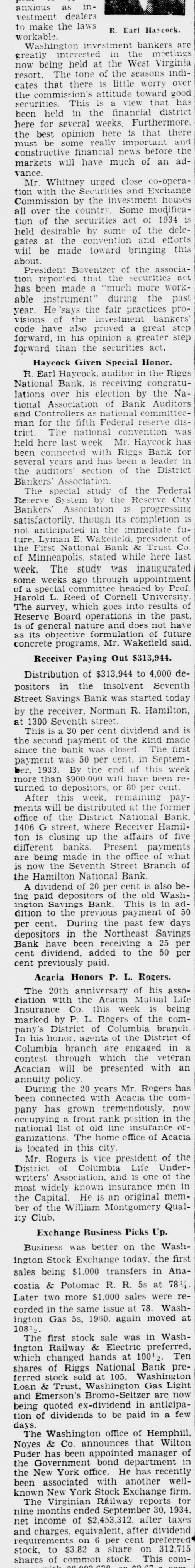 inas anxious vestment dealers laws to make the R. Earl Haycock are workable. investment bankers greatly Washington interested at the in West the meetings Virginia indibeing held the seasons resort. The is little worry that there attitude toward good cates now tone of over has the commission's is a view that district been held in securities. This the weeks. financial Furthermore for several is that there here opinion here and some really before the will the must best be financial news important admarkets constructive have much of an co-operavance. Mr. Whitney Securities urged close and Exchange houses with the Investment by Some modificathe country. of 1934 Commission tion the act is all over the securities the deleof of efforts this gates held tion desirable the convention by some bringing and will be at made toward associaabout. Bovenizer of securities the act President that the worktion reported been made a "much more the past has instrument during proinvestment able He "says the fair practices bankers year. visions of the proved a great step step code have in also his opinion a greater act. forward. forward than the securities Haycock Given Special Honor. the Bank. Haycock. auditor in congratu- Riggs R. Earl is receiving NaNational over his election by Auditors the tional national lations Association of Bank committeeand Controllers as Federal reserve disfor the fifth convention was man The national Haycock has trict. last week Mr. Bank for been a held here connected with Riggs leader in the auditors several been years and section has of the District Bankers Association of the Federal The special study by the Reserve City Reserve System Association is progressing though fuin the of satisfactorily. Bankers anticipated its immediate completion president not Wakeheld Co ture Lyman E Bank & Trust First while of the Minneapolis. National stated was inaugurated here last The study appointment week. weeks ago through headed by Prof some committee University of a special L. Reed of Cornell results of Harold which goes into in the past, The Reserve survey, Board operations and does not have general nature of future concrete is as of its objective programs, formulation Mr. Wakefield said. Receiver Paying Out $313,944. of $313,944 to 4,000 deDistribution in the insolvent started Seventh today positors Savings Bank was Hamilton, Street by the receiver, Norman R. is at 1300 Seventh street. dividend and is a 30 per cent the kind made the second bank was closed since This the payment of cent. in The Septem- first payment was 50 per end of this week reber. 1933. By will have been $900.000 the cent than 80 per more to depositors, or payturned this week. remaining former be distributed at Bank, will District National ments After of the Receiver the Hamiloffice G street, where affairs of five 1406 closing up the payments office ton is banks Present of what different are being made in the Street Branch of the Seventh Bank. bealso the is now Hamilton National cent is A dividend of 20 per of the old Wash50 ington Savings payment ing paid depositors previous Bank. This is in of adper dition to the the past few days depositors cent. have in During been the receiving Northeast a Savings 50 25 per per Bank cent dividend, added to the cent previously paid. Acacia Honors P. L. Rogers. anniversary of Mutual his asso- Life The 20th with the Acacia week is being Insurance ciation Co this Rogers of the comof District of pany's agents of the in marked his honor. District by P. L. Columbia engaged branch a Columbia In branch are the veteran which an Acacian contest through will be presented with has annuity policy. the 20 years Mr. Rogers the comDuring connected with Acacia now been grown tremendously in the pany has a front rank position insurance organizations occupying national list The of old home line office of Acacia of is located in this city. the the Mr. Rogers Columbia is vice president Life Under District writers Association, of insurance and is one men of in known memmost widely He is an original Qualber the of Capital the William Montgomery ity Club. Exchange Business Picks Up. was better on the the Wash- first Business Stock Exchange today. in Anaington being $1,000 transfers at 7814 sales & Potomac R. R. 5s were recostia two more $1,000 sales 78. WashLater same issue at moved at ington corded in Gas the 5s, 1960. again Wash10812. The first stock sale Electric was in preferred, & Ten ington changed Railway hands at 1001/2 Bank prewhich of Riggs National Washington shares stock sold at 105. Gas Light ferred Trust, Washington are now Loan Emerson's & Bromo-Selta anticipaand quoted ex-dividend in in a few being tion of dividends to be paid days. Washington office of that Hemphill. Wilton Noyes The & Co. announces appointed manager of in Puder has been bond department recently the New Government York office. He another has wellknown the associated with firm Railway been New York Stock Exchange reports for The months Virginian ended September after 30, taxes 1934, and nine income of $2,453,312. dividend net charges. equivalent. after preferred on on shares to of common stock stock, requirements $3.82 a 6 per share cent This 312,715 com-