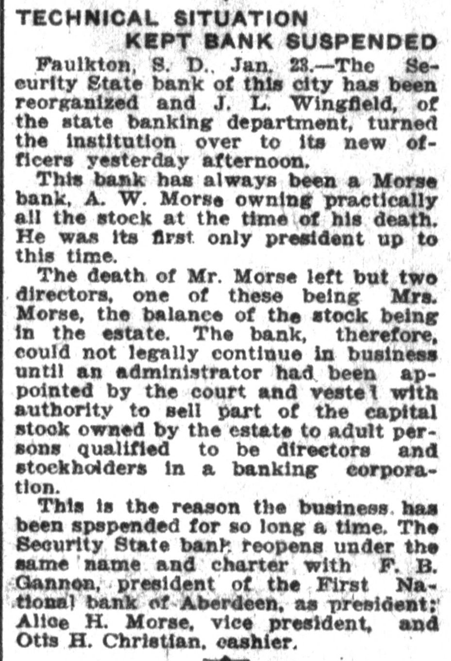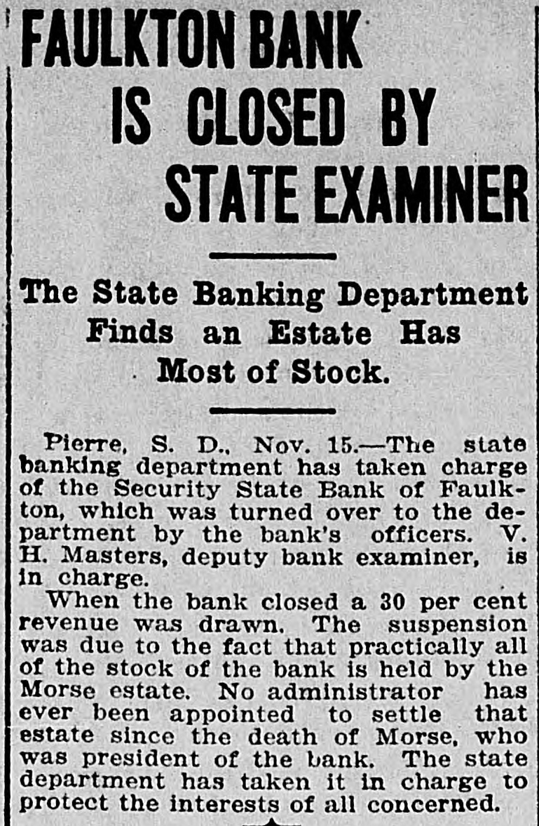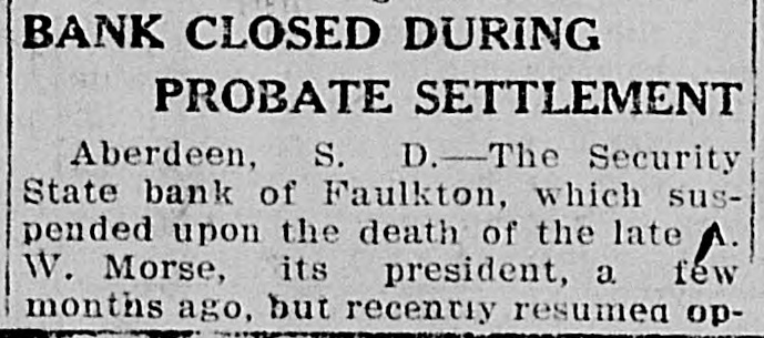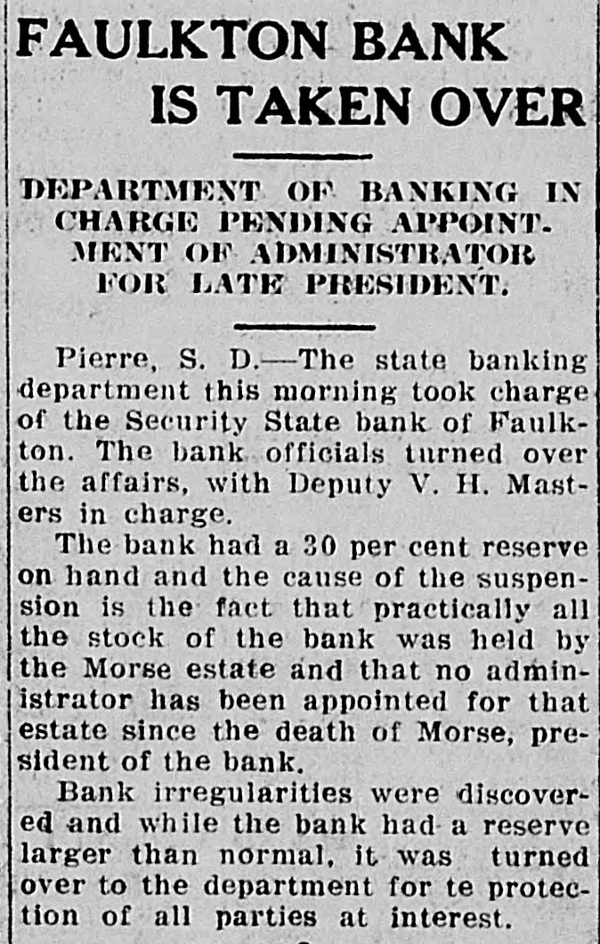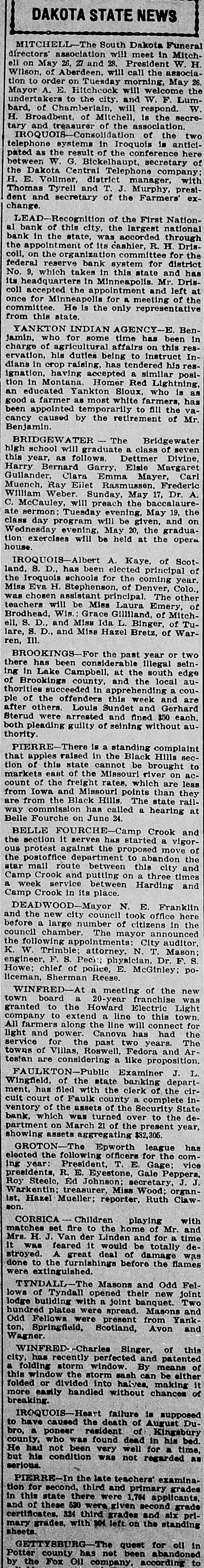 DAKOTA STATE NEWS MITCHELL-The South Dakota Funeral directors' association will meet in Mitchell on May 26, 27 and 28. President W. H. Wilson, of Aberdeen, will call the association to order on Tuesday morning, May 26 Mayor A. E Hitchcock will welcome the undertakers to the city, and W. F. Lumbard, of Chamberlain, will respond. W H. Broadbent. of Mitchell, is the secretary and treasurer of the association. IROQUOIS-Consolidation of the two telephone systems in Iroquois is anticipated as the result of the conference here between W G Bickelhaupt, secretary of the Dakota Central Telephone company; H. E. Vollmer, district manager, with Thomas Tyrell and T J. Murphy, president and secretary of the Farmers' exchange. LEAD-Recognition of the First National bank of this city, the largest national bank in the state, was accorded through the appointment of its cashier, R. H. Dris. coll, on the organization committee for the federal reserve bank system for district No. 9. which takes in this state and has its headquarters in Minneapolis Mr. Driscoll accepted the appointment and left at once for Minneapolis for a meeting of the committee. He is the only representative from this state. YANKTON INDIAN AGENCY-E Benjamin, who for some time has been in charge of agricultural affairs on this reservation, his duties being to instruct Indians in crop raising, has tendered his resignation, having accepted a similar position in Montana. Homer Red Lightning, an educated Yankton Sioux, who is as good a farmer as most white farmers, has been appointed temporarily to fill the vacancy caused by the retirement of Mr. Benjamin BRIDGEWATER The Bridgewater high school will graduate a class of seven this year, as follows. Dettmer Divine, Harry Bernard Garry, Elsie Margaret Gullander, Clara Emma Mayer, Carl Muench, Ray Eilet Rasmussen, Frederic William Weber. Sunday, May 17, Dr. A. C. McCauley, will preach the baccalaureate sermon: Tuesday evening, May 19, the class day program will be given, and on Wednesday evening, May 20, the graduation exercises will be held at the opera house. IROQUOIS-Albert A. Kaye, of Scotland, S. D., has been elected principal of the Iroquois schools for the coming year. Miss Eva H. Stephenson, of Denver, Colo., was chosen assistant principal. The other teachers will be Miss Laura Emery, of Brodhead, Wis.: Grace Gilliland, of Mitchell, S. D., and Miss Ida L. Binger, of Tulare, S. D., and Miss Hazel Bretz, of Warren, III. BROOKINGS-For the past year or two there has been considerable illegal seining in Lake Campbell, at the south edge of Brookings county, and the local authorities succeeded in apprehending a couple of the offenders this week and are after others. Louis Sundet and Gerhard Sterud were arrested and fined $50 each, both pleading guilty of seining without authority PIERRE-There is a standing complaint that apples raised in the Black Hills section of this state cannot be brought to markets east of the Missouri river on account of the freight rates, which are less from Iowa and Missouri points than they are from the Black Hills. The state railway commission has called a hearing at Belle Fourche on June 24. BELLE FOURCHE-Camp Crook and the section it serves has started a vigorous protest against the proposed move of the postoffice department to abandon the star mail route between this city and Camp Crook and putting on a three times a week service between Harding and Camp Crook in its place. DEADWOOD-Mayor N. E. Franklin and the new city council took office here before a large number of citizens in the council chamber. The mayor announced the following appointments: City auditor. K. W. Trimble: attorney, N. T. Mason; engineer, F. S. Pecis physician, Dr. F. S. Howe: chief of police, E. McGinley policeman, Sherman Reese. WINFRED-At a meeting of the new town board a 20-year franchise was granted to the Howard Electric Light company to extend a line to this town. All farmers along the line will connect for light and power. Canova has had the service for the past two years. The towns of Villas, Roswell, Fedora and Artesian are considering a like proposition. FAULKTON-Public Examiner J. L Wingfield, of the state banking department, has filed with the clerk of the circuit court of Faulk county a complete inventory of the assets of the Security State bank. which was turned over to the department on March 21 of the present year, showing assets aggregating $82,305. GROTON-The Epworth league has elected the following officers for the coming year: President, T. E. Gage: vice presidents, R. E. Eyestone, Gale Peppers, Roy Steele, Ed Johnson; secretary, J. J. Warkentin: treasurer, Miss Wood; organist, Hazel Mueller; reporter, Ruth Clawson. CORSICA Children playing with matches set fire to the home of Mr. and Mrs. H. J. Van der Linden and for a time it was feared it would be totally destroyed. A great deal of damage was done to the furnishings before the flames were extinguished. TYNDALL-The Masons and Odd Fellows of Tyndall opened their new joint lodge building with a joint banquet. Two hundred plates were spread. Masons and Odd Fellows were present from Yankton, Springfield, Scotland, Avon and Wagner. WINFRED -Charles Singer, of this city, has recently perfected and patented a folding storm window. By means of this window the storm sash can be either folded or divided into halves, making it more easily handled without chances of breaking. IROQUOIS-Heart failure is supposed to have caused the death of August Dubro, a poneer resident of Kingsbury county, who was found dead in his bed. He had not been very well for a time, but his condition was not regarded as serious. PIERRE-In the late teachers' examination for second, third and primary grades in this state there were 1,764 applicants, and of these 530 were given second grade certificates, 324 third grades and six primary grades, with 904 left on the standing sheets. GETTYSBURG-The quest for oil in Potter county has not been abandoned by the Fox Oil 