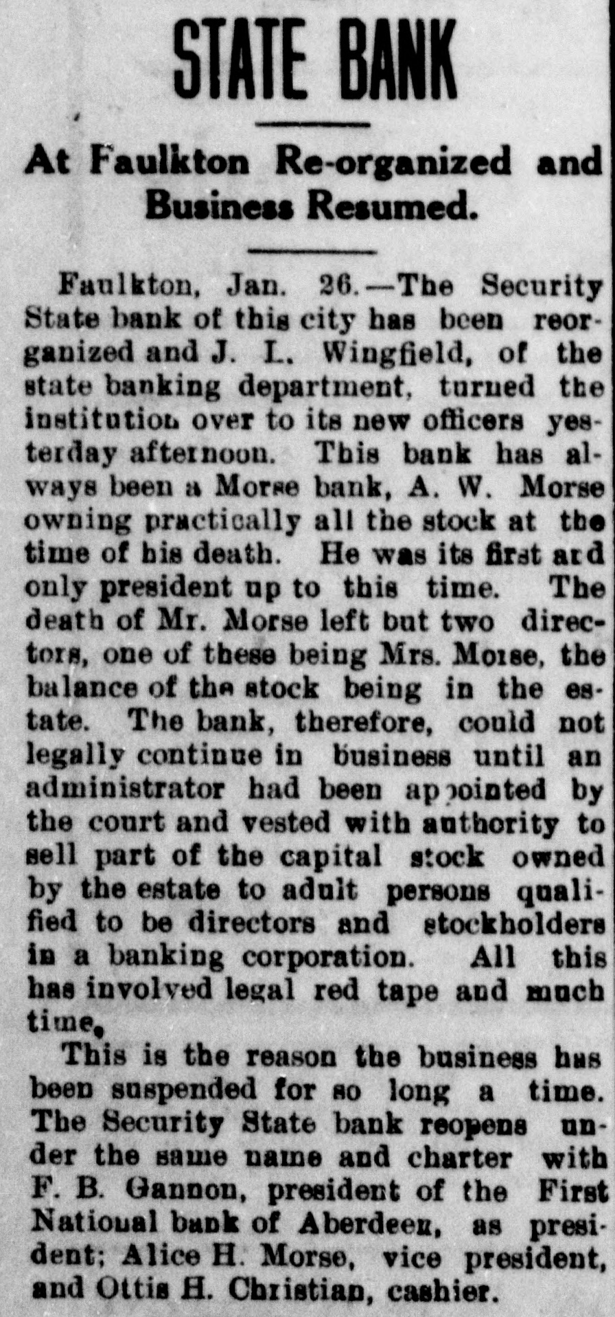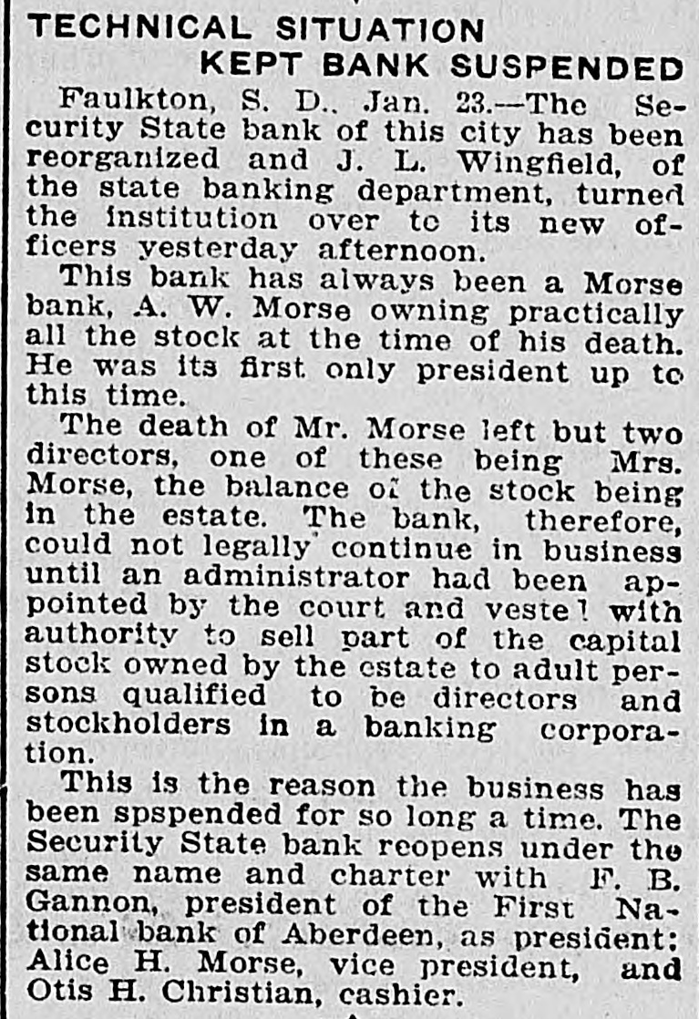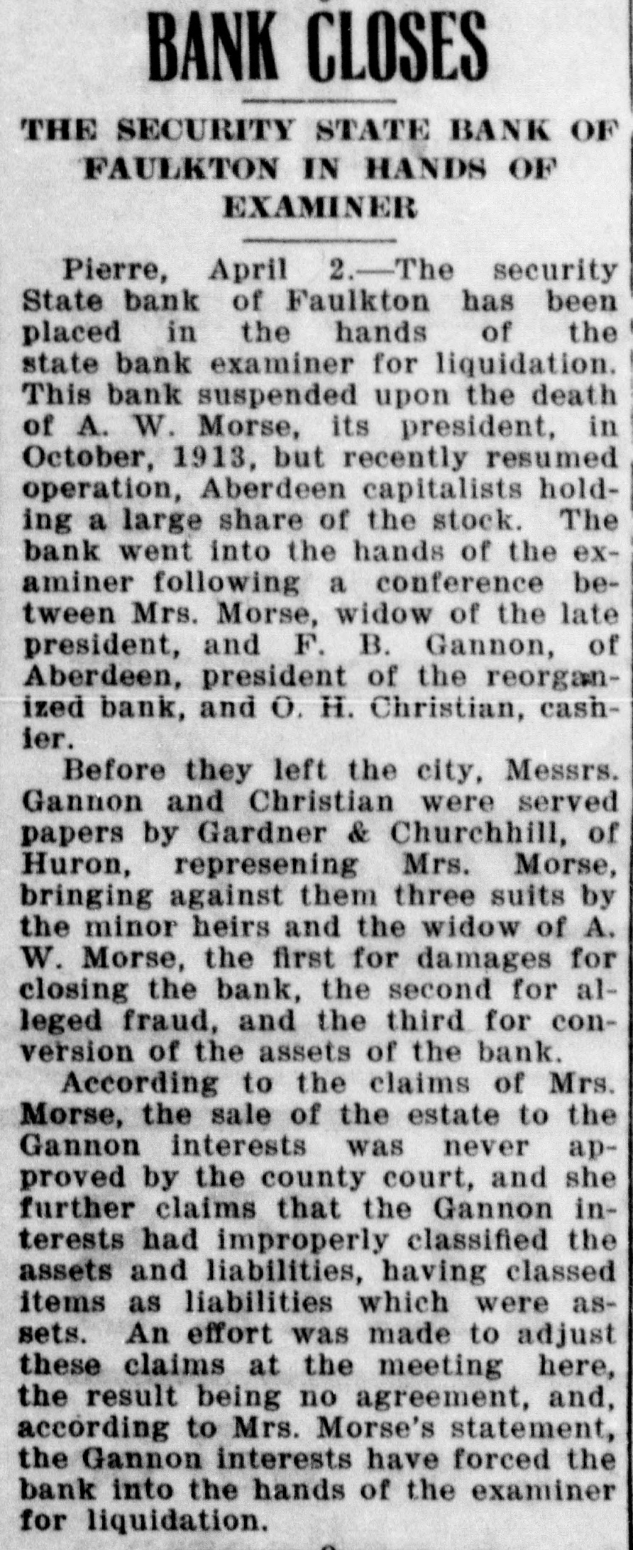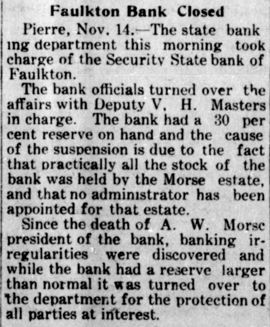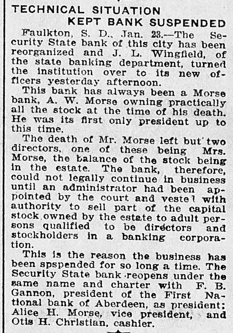 DAKOTA STATE NEWS MITCHELL-The South Dakota Funeral directors' association will meet in Mitchell on May 26, 27 and 28. President W. H. Wilson, of Aberdeen, will call the association to order on Tuesday morning, May 26 Mayor A. E Hitchcock will welcome the undertakers to the city, and W. F. Lumbard, of Chamberlain, will respond. W H. Broadbent. of Mitchell, is the secretary and treasurer of the association. IROQUOIS-Consolidation of the two telephone systems in Iroquois is anticipated as the result of the conference here between W G Bickelhaupt, secretary of the Dakota Central Telephone company; H. E. Vollmer, district manager, with Thomas Tyrell and T J. Murphy, president and secretary of the Farmers' exchange. LEAD-Recognition of the First National bank of this city, the largest national bank in the state, was accorded through the appointment of its cashier, R. H. Dris. coll, on the organization committee for the federal reserve bank system for district No. 9. which takes in this state and has its headquarters in Minneapolis Mr. Driscoll accepted the appointment and left at once for Minneapolis for a meeting of the committee. He is the only representative from this state. YANKTON INDIAN AGENCY-E Benjamin, who for some time has been in charge of agricultural affairs on this reservation, his duties being to instruct Indians in crop raising, has tendered his resignation, having accepted a similar position in Montana. Homer Red Lightning, an educated Yankton Sioux, who is as good a farmer as most white farmers, has been appointed temporarily to fill the vacancy caused by the retirement of Mr. Benjamin BRIDGEWATER The Bridgewater high school will graduate a class of seven this year, as follows. Dettmer Divine, Harry Bernard Garry, Elsie Margaret Gullander, Clara Emma Mayer, Carl Muench, Ray Eilet Rasmussen, Frederic William Weber. Sunday, May 17, Dr. A. C. McCauley, will preach the baccalaureate sermon: Tuesday evening, May 19, the class day program will be given, and on Wednesday evening, May 20, the graduation exercises will be held at the opera house. IROQUOIS-Albert A. Kaye, of Scotland, S. D., has been elected principal of the Iroquois schools for the coming year. Miss Eva H. Stephenson, of Denver, Colo., was chosen assistant principal. The other teachers will be Miss Laura Emery, of Brodhead, Wis.: Grace Gilliland, of Mitchell, S. D., and Miss Ida L. Binger, of Tulare, S. D., and Miss Hazel Bretz, of Warren, III. BROOKINGS-For the past year or two there has been considerable illegal seining in Lake Campbell, at the south edge of Brookings county, and the local authorities succeeded in apprehending a couple of the offenders this week and are after others. Louis Sundet and Gerhard Sterud were arrested and fined $50 each, both pleading guilty of seining without authority PIERRE-There is a standing complaint that apples raised in the Black Hills section of this state cannot be brought to markets east of the Missouri river on account of the freight rates, which are less from Iowa and Missouri points than they are from the Black Hills. The state railway commission has called a hearing at Belle Fourche on June 24. BELLE FOURCHE-Camp Crook and the section it serves has started a vigorous protest against the proposed move of the postoffice department to abandon the star mail route between this city and Camp Crook and putting on a three times a week service between Harding and Camp Crook in its place. DEADWOOD-Mayor N. E. Franklin and the new city council took office here before a large number of citizens in the council chamber. The mayor announced the following appointments: City auditor. K. W. Trimble: attorney, N. T. Mason; engineer, F. S. Pecis physician, Dr. F. S. Howe: chief of police, E. McGinley policeman, Sherman Reese. WINFRED-At a meeting of the new town board a 20-year franchise was granted to the Howard Electric Light company to extend a line to this town. All farmers along the line will connect for light and power. Canova has had the service for the past two years. The towns of Villas, Roswell, Fedora and Artesian are considering a like proposition. FAULKTON-Public Examiner J. L Wingfield, of the state banking department, has filed with the clerk of the circuit court of Faulk county a complete inventory of the assets of the Security State bank. which was turned over to the department on March 21 of the present year, showing assets aggregating $82,305. GROTON-The Epworth league has elected the following officers for the coming year: President, T. E. Gage: vice presidents, R. E. Eyestone, Gale Peppers, Roy Steele, Ed Johnson; secretary, J. J. Warkentin: treasurer, Miss Wood; organist, Hazel Mueller; reporter, Ruth Clawson. CORSICA Children playing with matches set fire to the home of Mr. and Mrs. H. J. Van der Linden and for a time it was feared it would be totally destroyed. A great deal of damage was done to the furnishings before the flames were extinguished. TYNDALL-The Masons and Odd Fellows of Tyndall opened their new joint lodge building with a joint banquet. Two hundred plates were spread. Masons and Odd Fellows were present from Yankton, Springfield, Scotland, Avon and Wagner. WINFRED -Charles Singer, of this city, has recently perfected and patented a folding storm window. By means of this window the storm sash can be either folded or divided into halves, making it more easily handled without chances of breaking. IROQUOIS-Heart failure is supposed to have caused the death of August Dubro, a poneer resident of Kingsbury county, who was found dead in his bed. He had not been very well for a time, but his condition was not regarded as serious. PIERRE-In the late teachers' examination for second, third and primary grades in this state there were 1,764 applicants, and of these 530 were given second grade certificates, 324 third grades and six primary grades, with 904 left on the standing sheets. GETTYSBURG-The quest for oil in Potter county has not been abandoned by the Fox Oil 