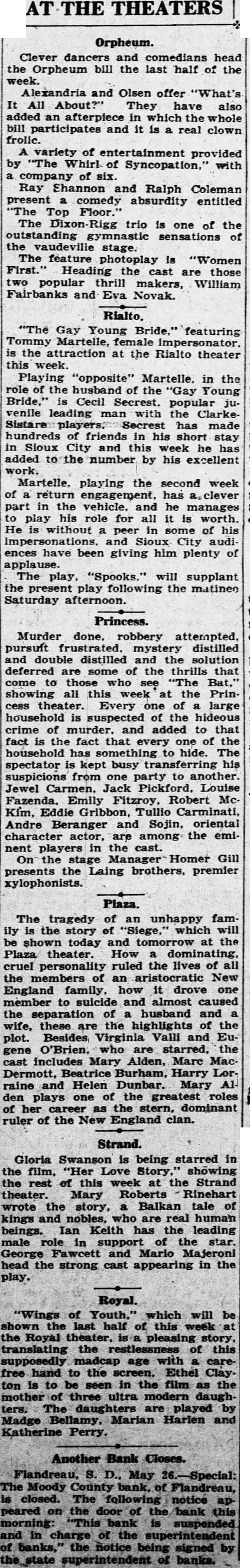 AT THE THEATERS Orpheum. Clever dancers and comedians head the Orpheum bill the last half of the Alexandria and Olsen offer "What's It All About?" They have also added an afterpiece in which the whole bill participates and it is a real clown frolic. A variety of entertainment provided by "The Whirl of Syncopation," with a company of six. Ray Shannon and Ralph Coleman present comedy absurdity entitled "The Top Floor. The Dixon-Rigg trio is one of the outstanding gymnastic sensations of the vaudeville stage. The feature photoplay is "Women First.' Heading the cast are those two popular thrill makers, William Fairbanks and Eva Novak. Rialto. "The Gay Young Bride." featuring Tommy Martelle, is the attraction at the Rialto theater this week. Playing "opposite" Martelle. in the role of the husband of the "Gay Young Bride," is Cecil Secrest, popular ju. venile leading with the ClarkeSistare has made hundreds of friends in his short stay in Sioux City and this week he has added to the number by his excellent work. Martelle. playing the second week of return engagement, has clever part in the vehicle. and he manages to play his role for all it is worth. He is without peer in some of his impersonations. and Sioux City audiences have been giving him plenty of applause. The play, "Spooks," will supplant the present play following the matineo Saturday afternoon. Princess. Murder done. robbery attempted. pursuit frustrated. mystery distilled and distilled and the solution deferred are some of the thrills that come to those who see "The Bat," showing all this week at the Princess theater. Every one of large household is suspected of the hideous crime of murder. and added to that fact is the fact that every one of the household has something to hide. The spectator is kept busy transferring his suspicions from one party to another Jewel Carmen, Jack Pickford. Louise Fazenda. Emily Fitzroy, Robert McKim, Eddie Gribbon, Tullio Carminati, Andre Beranger and Sojin, oriental character actor, are among the eminent players in the cast. On the stage Manager Homer Gill presents the Laing brothers, premier xylophonists. Plaza. The tragedy of an unhappy fam ily is the story of "Siege, which will be shown today and at the Plaza theater. How dominating. cruel personality ruled the lives of all the members of an aristocratic New England family. how it drove one member to suicide and almost caused the separation of husband and wife, these are the highlights of the plot. Besides Virginia Valli and Eugene O'Brien, who are starred, the cast includes Mary Alden, Marc MacDermott, Beatrice Burham, Harry Lorraine and Helen Dunbar. Mary den plays one of the greatest roles of her career as the stern, dominant ruler of the New England clan. Strand. Gloria Swanson is being starred in the film, "Her Love Story,' showing the rest of this week at the Strand theater. Mary Roberts Rinehart wrote the story, Balkan tale kings and nobles, who are real human beings. Ian Keith has the leading male role in support of the star. George Fawcett and Mario Majeroni head the strong cast appearing in the play. Royal. "Wings of Youth," which will be shown the last half of this week the Royal theater, a pleasing story, translating the of this supposedly age with a carefree hand to the screen. Ethel Clayton is to be in the film as the mother three ultra modern daughters. daughters are played by Madge Bellamy, Marian Harlen and Katherine Perry. Another Bank Closes. Flandreau, S. D., May 6.-Special: The Moody County bank, of Flandreau, is closed. The following notice appeared on the door of the bank this morning "This bank is suspended and in charge of the of banks, the notice being signed by the state superintendent of banks.