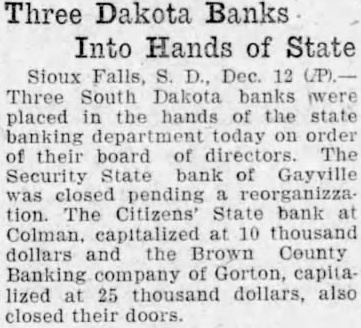 Three Dakota Banks Into Hands of State Sioux Falls, S. D., Dec. Three South Dakota banks placed hands of the banking department today order their board directors. The Security State bank of Gayville was closed pending tion. The Citizens' State bank Colman. capitalized at 10 thousand dollars Brown County Banking company of Gorton, capitalized 25 thousand dollars, also closed their doors.