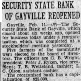 SECURITY STATE BANK OF GAYVILLE REOPENED Feb. State Bank of Gayville, which curity closed about six weeks ago, opened for business under ization which was completed at yesterday Five farmers the elected to the direcwere tors. The officers are B. Wright. president: vice Olson. cashier The bank has capitalization of $25,000.
