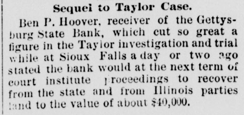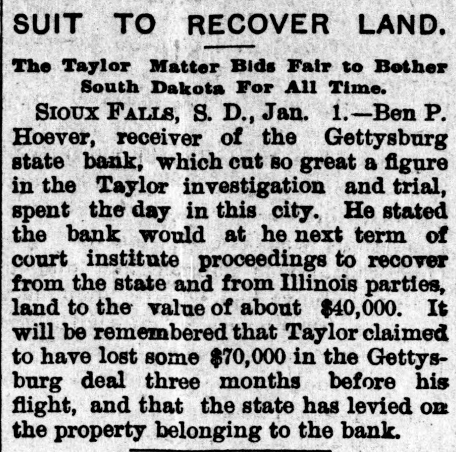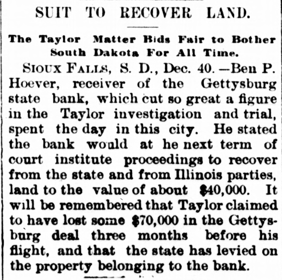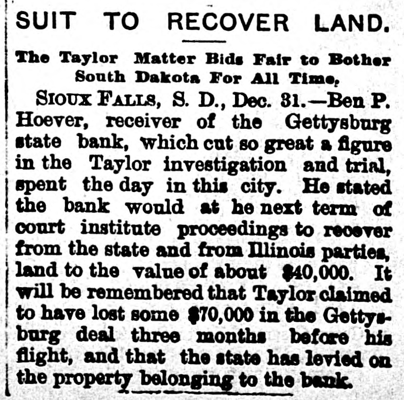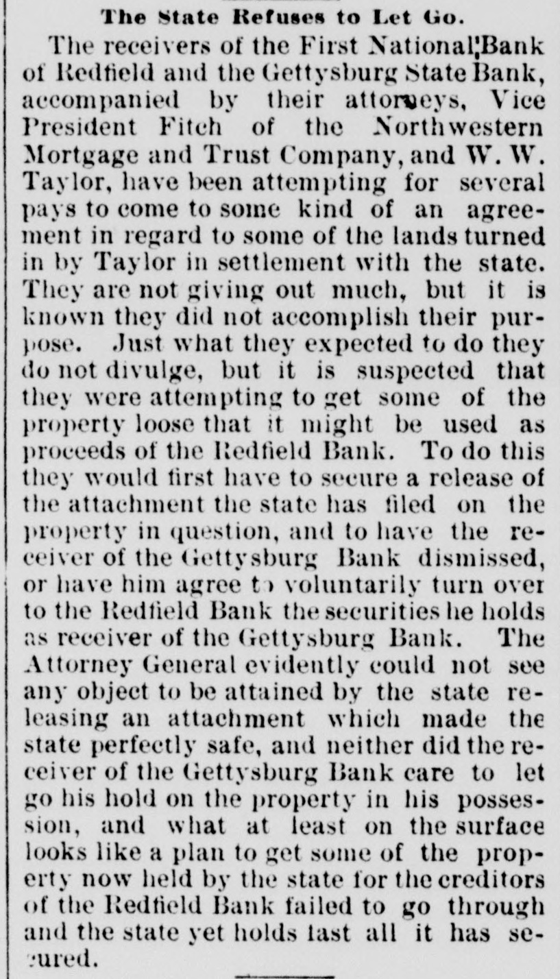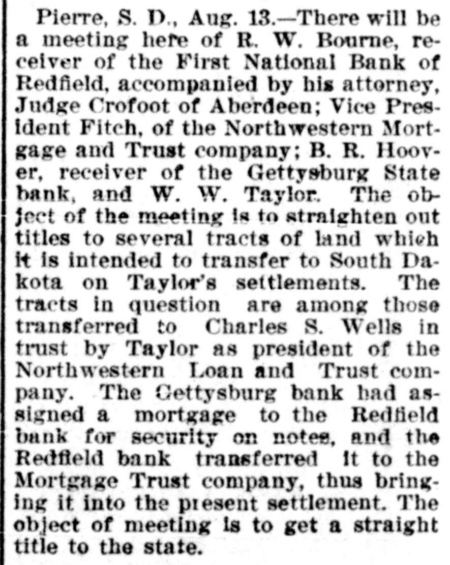 THE CITY. LOCAL BREVITIES. B. E. Beers returned to Easton, Minn. I. D. Smith was a passenger for Iowa points. Miss Laura Fuller went to Vilas on the evening train. John Miller went to Flandreau on a visit to old acquaintances. S. E. Baldwin always keeps a good supply of Dwight's flour in stock. The town has been billed to day for Lemen's circus which shows here September 3. Weather report: Fair, followed by increasing cloudiness to-night and Friday Warmer to-night and Friday; southerly winds. New wheat begins to move. One car load came east to-day from Artesian, two carloads from Howard and six were sent out from Flandreau. Arrivals at the Lake Park are: Court Boyd, Huron; L. P. Comstock and D. Webster, Aberdeen; John Stewart, Minneapolis; W. H. Tarbox, La Crosse. In the advertised letter list last evening, the name of J. E. Tanner appeared when it should have been J. E. Tamer. There are several letters in the postoffice for the gentleman which will be sent to the dead letter office unless called for within the regulation time. Rev. W. J. Cleveland received a telegram last evening announcing the death of Willis Leiby who, it will be remembered, spent some time with his wife in the family of Mr. Cleveland last spring. He died at Hamberg, Pa., among friends, and was the victim of consumption. Iver Hyland of the north east part of county who returned from the asylum at Yankton some two months ago IS again partially violent and in charge of Sheriff Fox. Judge Williamson to-day notified the asylum authorities of his condition and he will probably soon be cared for. Mitchell Republican, 12: "Miss Marion L. Krom has just finished a course of study at the Cook County Normal school, Chicago. She is now visiting with friends at Perrysburg, Ohio." Miss Krom was a graduate of the Madison Normal school, class of '93. Train Dispatcher H. R. Wood and as sistant, J. E. Hickey, have control of the wires at the depot to day and John Moore started for LaCrosse. Mr. Wood says there will soon be a change in time table and an abandonment of mixed trains, which will be very agreeable to the traveling public. Langdon, N. D., dispatch, 14: A. H. Garfield' the Aberdeen, S. D., music dealer who eloped with 16-year-old Bessie Moore, of that city, arrived on the 6 o'clock train last night and at once hired a livery rig aud started for Manitou, Manitoba, about 35 miles ditant, on the Northern Pacific railroad. Garfield had shaved off bis beard and appeared fearful of arrest. Six local wheel sprinters took a spurt to Wentworth and back-a distance of 16 miles round trip-last evening. Martin Johnson was handicapped 8 minutes as against Harry Hunt and SIX minutes as against the others-Wm. Rae, Ivan Hubbell, Bert Holdridge and Frank Smith. The riding was fast and furious, Rae coming in ahead in 56:57, with the others close behind, except Smith who "bust" his wheel in a rut two or three miles from Wentworth. Johnson, however, made best time, 55:35. Some of the boys were pretty badly spavined and ringboned when they returned and have needed considerable rubbing down to keep them limber since. Pierre dispatch, 14: The receivers of the First National Bank of Redfield, and of the Gettysburg State Bank, accompanied by their attorneys, Vice President Fitch, of the Northwestern Mortgage Trust Co., and W. W. Taylor, have been attempting for several days to come to somr kind of an agreement in regard to some of the lands turned in by Taplor in settlement with the state. They failed to accomplish the purpose for which they came here. Just what they expected to do they do not divulge. but it eus. pected that they were attempting to get some of the property losse thatit might be used as proceeds of the Redfield bank. The attorney general, evidently 'could not see any object to be attained by the state in releasing an attachment, neither did the receiver of the Gettysburg bank care to let go his hold on the property in his possession, and what on the surface