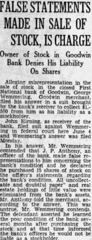 FALSE STATEMENTS MADE IN SALE OF STOCK, IS CHARGE Owner of Stock in Goodwin Bank Denies His Liability On Shares Alleging misrepresentation in the sale of stock in the closed First National bank of Goodwin, George Wemmering Goodwin merchant. filed his in suit brought the bank's collect $1,500 from him as his liability as a stockholder. John Hirning. as receiver of the bank, filed suit against Wemmering in federal court here June Monday. and 'emmering's answer was filed In his answer. Mr. Wemmering contended that J. Anthony, an officer of the bank. made false to the bank's condition and he declared he purchased 15 shares of stock on the officer's statements regarding the bank's condition All uncollectable and doubtful paper" and real estate holdings of little value were from the bank's assets, Mr. Anthony told the merchant according to the answer. This was untrue. Wemmering contends The defendant asserted he learned the poor condition of the bank sev. eral months after purchasing the stock and at that time the bank's officers he would not be liable as stockholder.