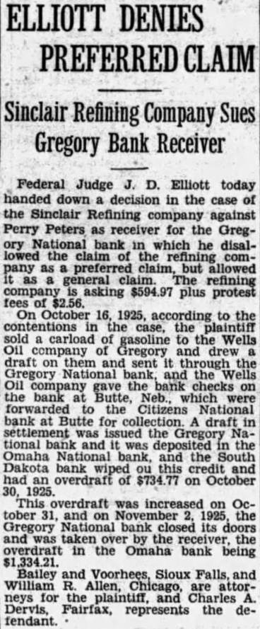 ELLIOTT DENIES PREFERRED Sinclair Refining Company Sues Gregory Bank Receiver Federal Judge D. Elliott today handed down decision in the case of the Sinclair Refining against Perry Peters as receiver for the GregNational bank which he disalclaim the company but allowed general refining asking plus protest On October 16, 1925, according to the the case, the plaintiff sold carload gasoline to the Wells company of Gregory and drew draft them and sent through the bank checks bank Butte, which Citizens National bank at Butte for draft in was issued the tional bank and was deposited in the Omaha National and the South Dakota bank this credit of on October was increased October 31, and on Gregory National bank closed its doors and taken the the overdraft in the Omaha bank being Bailey and Voorhees, Sioux Falls, and William Allen, are neys for the and Charles Dervis, Fairfax, represents the defendant.