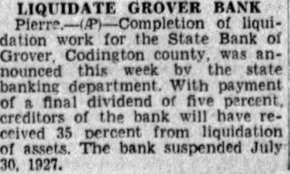 Article states State Bank (Grover, SD) suspended July 30, 1927 and in 1932 is being liquidated with a 35% dividend — indicates permanent closure/liquidation. No run mentioned; cause of suspension not specified in the text.
