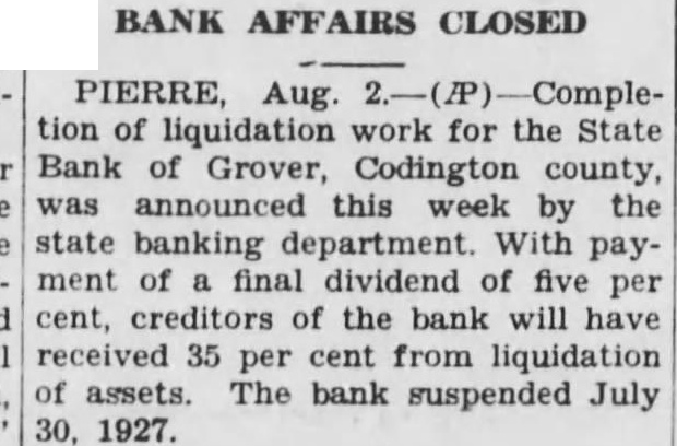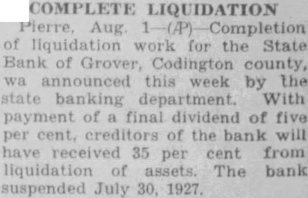 Aug. tion of liquidation work for the State Bank of Grover, Codington county, was announced this week by the state banking department. With payment of final dividend of five per cent, creditors of the bank will have received 35 per cent from liquidation assets. The bank suspended July 30, 1927.