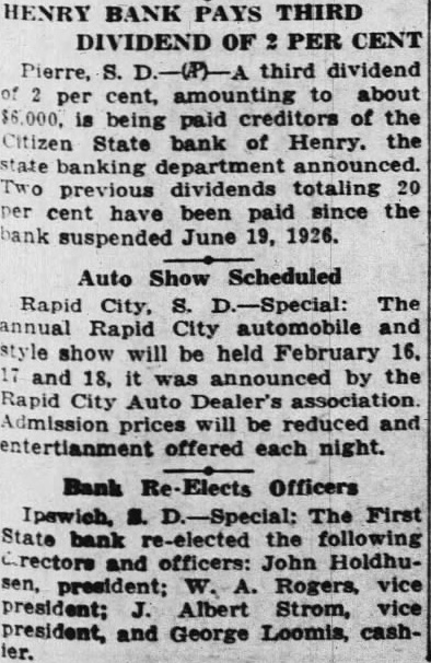 HENRY BANK PAYS THIRD DIVIDEND OF CENT Pierre, third dividend cent, amounting to about being paid creditors the State bank of Henry. banking department announced. previous dividends totaling have been paid since suspended June 1926. Auto Show Scheduled Rapid City, The annual Rapid City automobile and show will be held February and announced the City Auto Dealer's prices reduced and offered each night. Bank Officers The First re-elected the following and officers: John HoldhuRogers, president: Albert Strom, vice George Loomis, cash-