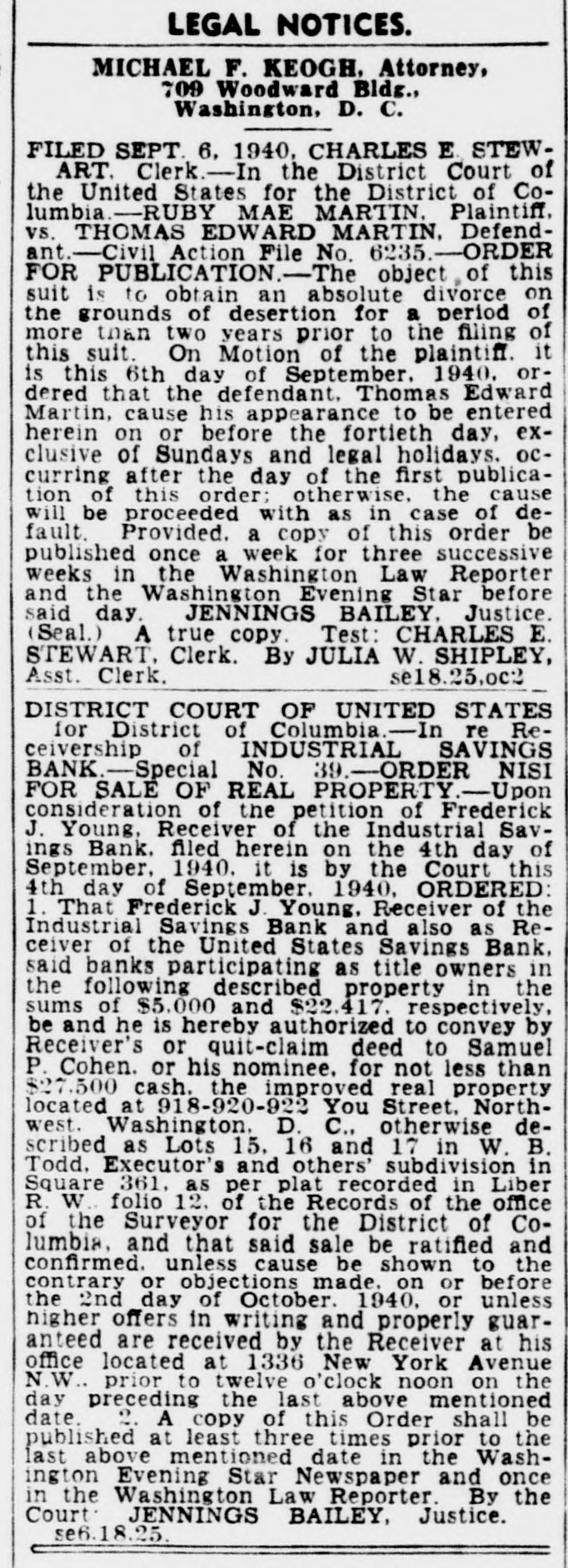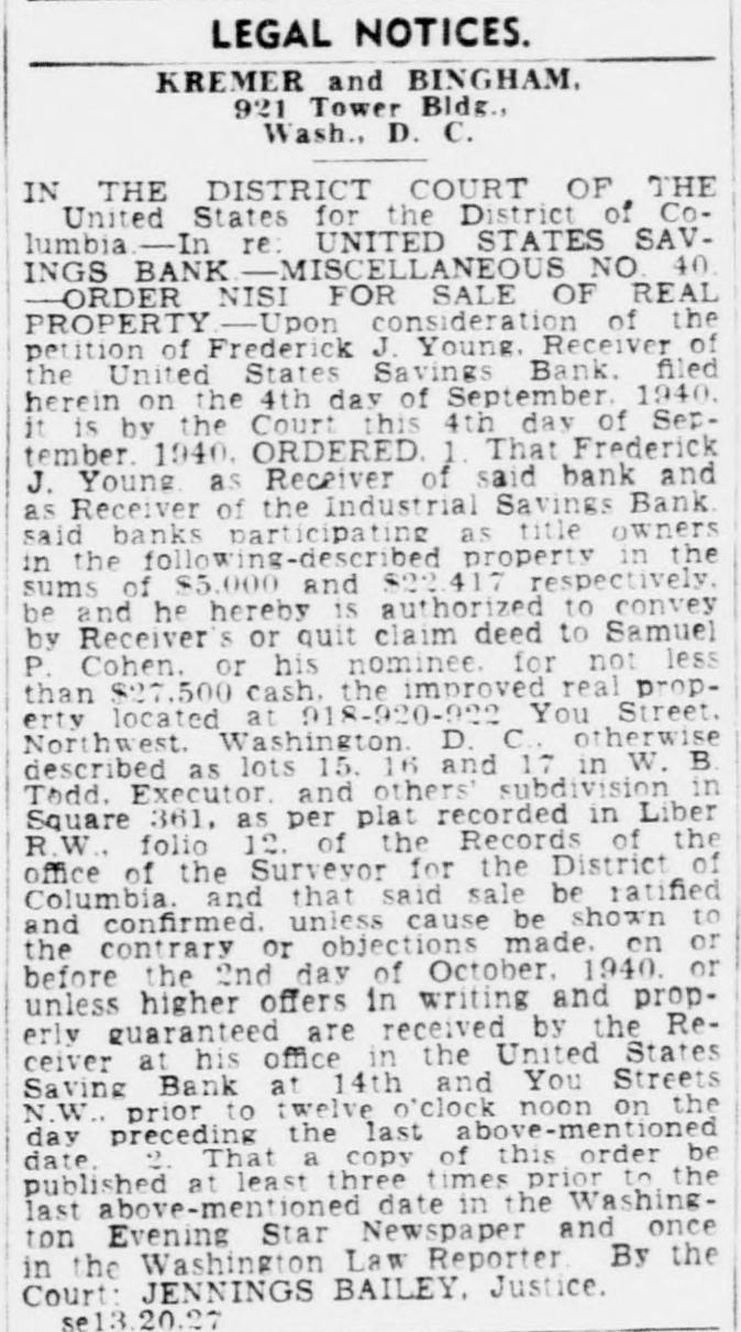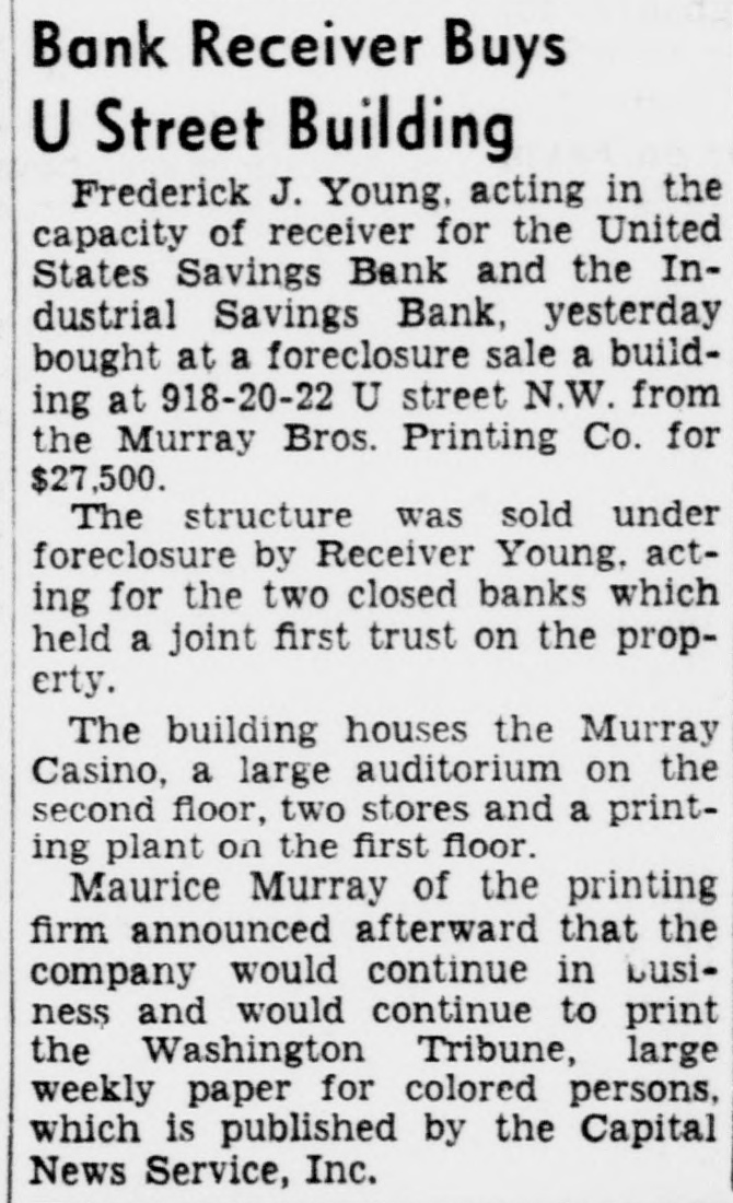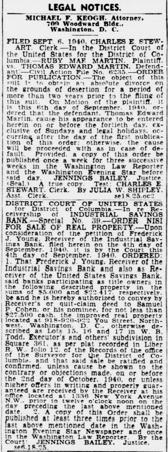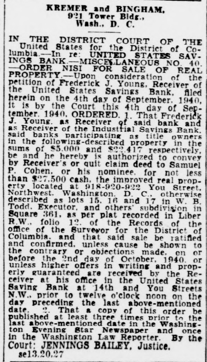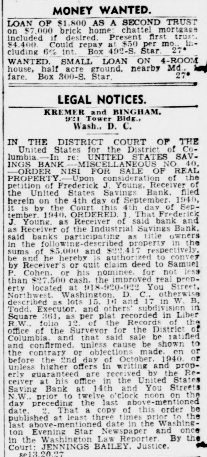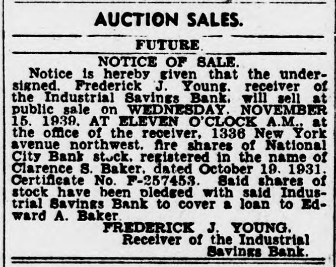 $600,000Unclaimed,Receiver Opens Drive to Find Owners Half Million in Deposits, More in Dividends Await Depositors of Six Closed Banks Frederick J. Young, receiver for $60,000. These have been made out six Washington banks, has started a to persons who had proven their claims. campaign to find the depositors who own more than half a million The Commercial National Bank, dollars worth of "unproven claims," for which the receivership office is and about $100,000 in unclaimed dialso at 1336 New York avenue, has vidend checks, ready to be cashed. unproven claims amounting to Letters are being sent out to de$206,000, and 2,111 undelivered positors listed as owners of the checks amounting to about $26,000. money, at their last address, and It has paid 70 per cent. a representative of the receiver is The four other bank receiverships working out of the receiver's office under supervision of Mr. Young are in an endeavor personally to find located at the site of the closed missing depositors who cannot be United States Savings Bank at located by mail. Fourteenth and U streets. Receivers of closed banks, accordPaid 100 Per Cent. ing to the official records of the Government, consistently have diffiThe United States Savings Bank, culty in getting creditors to call which has paid 100 per cent has for the last funds left in a receiver$50,846 of unproven claims, and unship. delivered dividend checks amount$160,000 in One Bank. ing to $7,996. Mr. Young said the Federal The Bank of Brightwood, which American National Bank and Trust has paid 62 1/2 per cent, has unproven Co., for which the receivership office claims of $41,500, and undelivered is located at 1336 New York avenue checks amounting to $6,986. N.W., has paid 75 per cent dividends The International Exchange Bank, to depositors and has $160,000 unwhich has paid 45 per cent, has proven claims for which no one has unproven claims amounting to called to prove ownership. Persons $17,000 and undelivered dividend who can prove claim to their part checks worth $7,500. of this fund will receive dividends totalling 75 per cent of the claim. The Industrial Savings Bank has In addition there are about 5,000 no undelivered checks, Mr. Young dividend checks in this bank, unreports, but has unproven claims totalling $114,500. called for, amounting to about