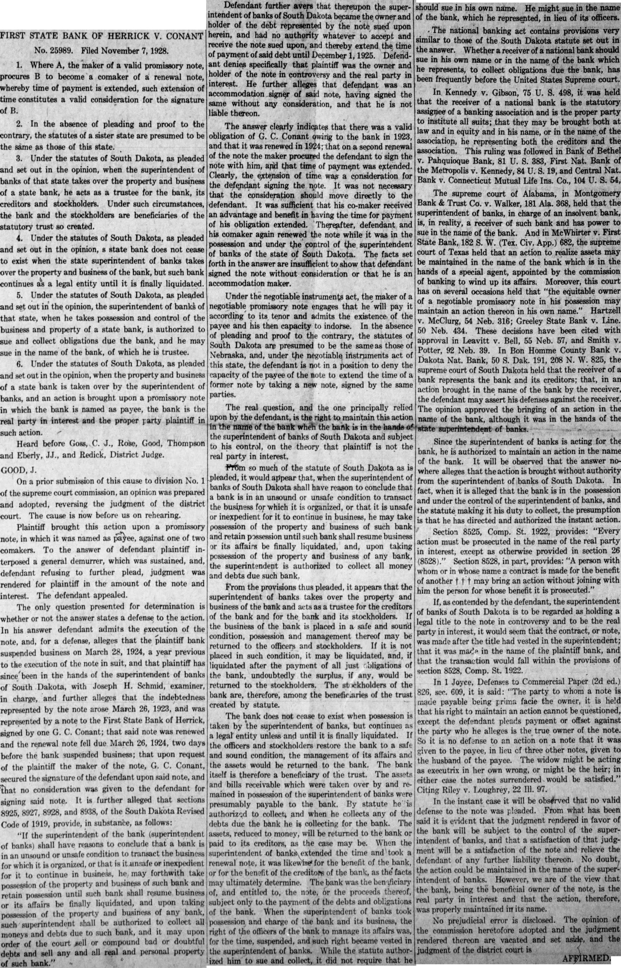 FIRST STATE BANK OF HERRICK V. CONANT No. 25989. Filed November 7, 1928. 1. Where A, the maker of a valid promissory note, procures B to become a comaker of a renewal note, whereby time of payment is extended, such extension of time constitutes a valid consideration for the signature of B. 2. In the absence of pleading and proof to the contrary, the statutes of a sister state are presumed to be the same as those of this state. 3. Under the statutes of South Dakota, as pleaded and set out in the opinion, when the superintendent of banks of that state takes over the property and business of a state bank, he acts as a trustee for the bank, its creditors and stockholders. Under such circumstances, the bank and the stockholders are beneficiaries of the statutory trust SO created. 4. Under the statutes of South Dakota, as pleaded and set out in the opinion, S state bank does not cease to exist when the state superintendent of banks takes over the property and business of the bank, but such bank continues as a legal entity until it is finally liquidated. 5. Under the statutes of South Dakota, as pleaded and set out in the opinion, the superintendent of banks of that state, when he takes possession and control of the business and property of a state bank, is authorized to sue and collect obligations due the bank, and he may sue in the name of the bank, of which he is trustee. 6. Under the statutes of South Dakota, as pleaded and set out in the opinion, when the property and business of a state bank is taken over by the superintendent of banks, and an action is brought upon a promissory note in which the bank is named as payee, the bank is the real party in interest and the proper party plaintiff in such action. Heard before Goss, C. J., Rose, Good, Thompson and Eberly, JJ., and Redick, District Judge. GOOD, J. On a prior submission of this cause to division No. 1 of the supreme court commission, an opinion was prepared and adopted, reversing the judgment of the district court. The cause is now before us on rehearing. Plaintiff brought this action upon a promissory 'note, in which it was named as payee, against one of two comakers. To the answer of defendant plaintiff interposed a general demurrer, which was sustained, and, defendant refusing to further plead, judgment was rendered for plaintiff in the amount of the note and interest. The defendant appealed. The only question presented for determination is whether or not the answer states a defense to the action. In his answer defendant admits the execution of the note, and, for a defense, alleges that the plaintiff bank suspended business on March 28, 1924, a year previous to the execution of the note in suit, and that plaintiff has since been in the hands of the superintendent of banks of South Dakota, with Joseph H. Schmid, examiner, in charge, and further alleges that the indebtedness represented by the note arose March 26, 1923, and was represented by a note to the First State Bank of Herrick, signed by one G. C. Conant; that said note was renewed and the renewal note fell due March 26, 1924, two days before the bank suspended business; that upon request of the plaintiff the maker of the note, G. C. Conant, secured the signature of the defendant upon said note, and that no consideration was given to the defendant for signing said note. It is further alleged that sections 8925, 8927, 8928, and 8938, of the South Dakota Revised Code of 1919, provide, in substance, as follows: "If the superintendent of the bank (superintendent of banks) shall have reasons to conclude that a bank is in an unsound or unsafe condition to transact the business for which it is organized, or that is it unsafe or inexpedient for it to continue in business, he, may forthwith take possession of the property and business of such bank and retain possession until such bank shall resume business or its affairs be finally liquidated, and upon taking possession of the property and business of any bank, such superintendent shall be authorized to collect all moneys and debts due to such bank, and it may upon order of the court sell or compound bad or doubtful debts and sell any and all real and personal property of such bank." Defendant further avers that thereupon the superintendent of banks of South Dakota became the owner and holder of the debt represented by the note sued upon herein, and had no authority whatever to accept and receive the note sued upon, and thereby extend the time of payment of said debt until December 1, 1925. Defendant denies specifically that plaintiff was the owner and holder of the note in controversy and the real party in interest. He further alleges that defendant was an accommodation signer of said note, having signed the same without any consideration, and that he is not liable thereon. The answer clearly indicates that there was a valid obligation of G. C. Conant owing to the bank in 1923, and that it was renewed in 1924; that on a second renewal of the note the maker procured the defendant to sign the note with him, and that time of payment was extended. Clearly, the extension of time was a consideration for the defendant signing the note. It was not necessary that the consideration should move directly to the defendant. It was sufficient that his co-maker received an advantage and benefit in having the time for payment of his obligation extended. Thereafter, defendant and his comaker again renewed the note while it was in the possession and under the control of the superintendent of banks of the state of South Dakota. The facts set forth in the answer are insufficient to show that defendant signed the note without consideration or that he is an accommodation maker. Under the negotiable instruments act, the maker of a negotiable promissory note engages that he will pay it according to its tenor and admits the existence of the payee and his then capacity to indorse. In the absence of pleading and proof to the contrary, the statutes of South Dako