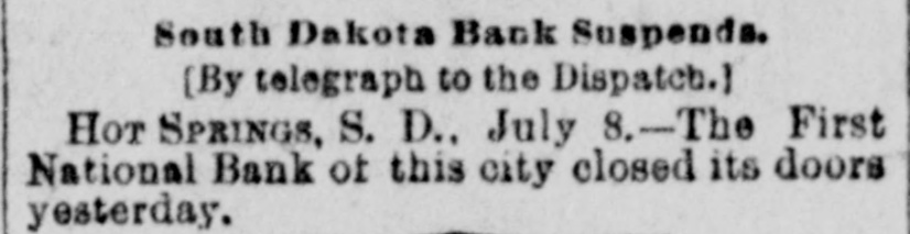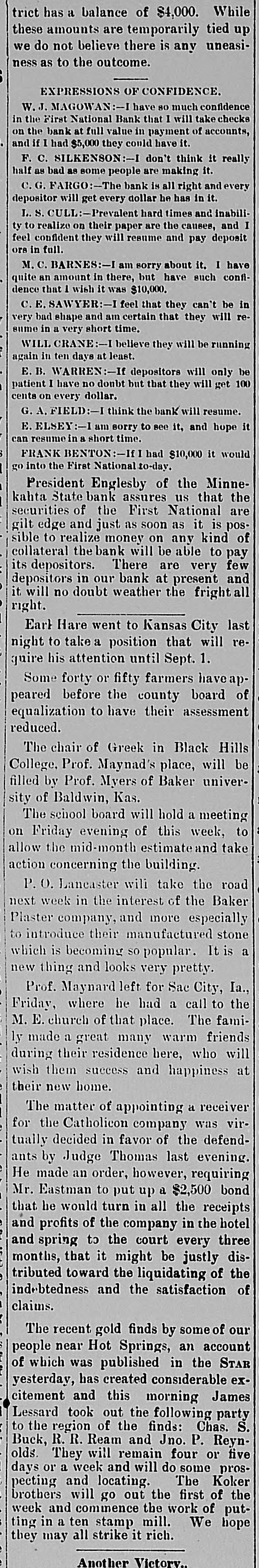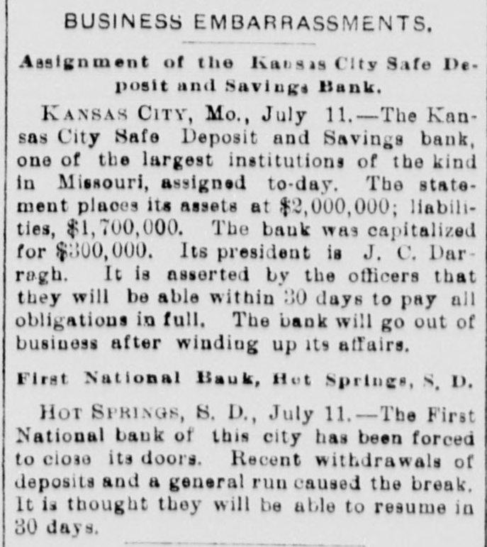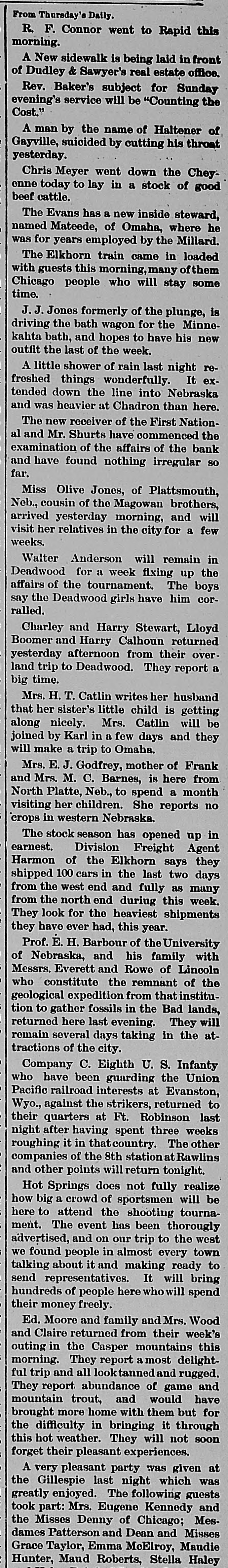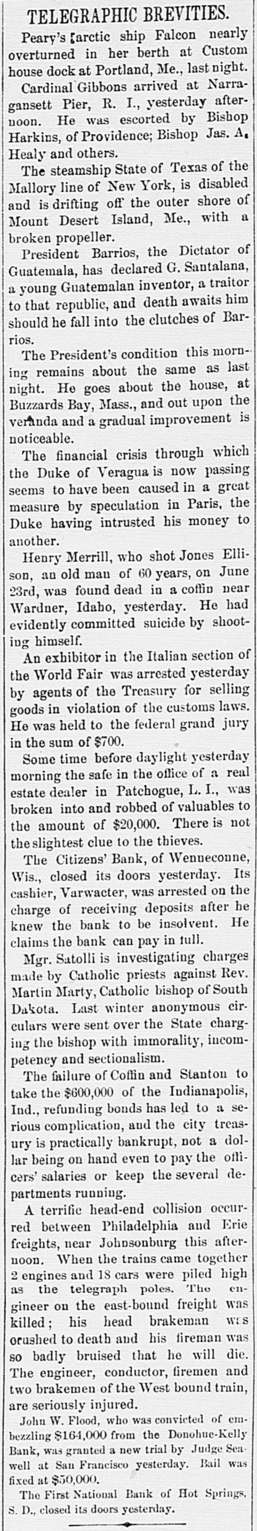 TELEGRAPHIC BREVITIES. Peary's [arctic ship Falcon nearly overturned in her berth at Custom house dock at Portland, Me., last night. Cardinal Gibbons arrived at Narragansett Pier, R. I., yesterday afternoon. He was escorted by Bishop Harkins, of Providence; Bishop Jas. A. Healy and others. The steamship State of Texas of the Mallory line of New York, is disabled and is drifting off the outer shore of Mount Desert Island, Me., with a broken propeller. President Barrios, the Dictator of Guatemala, has declared G. Santalana, a young Guatemalan inventor, a traitor to that republic, and death awaits him should he fall into the clutches of Barrios. The President's condition this morning remains about the same as last night. He goes about the house, at Buzzards Bay, Mass., and out upon the veranda and a gradual improvement is noticeable. The financial crisis through which the Duke of Veragua is now passing seems to have been caused in a great measure by speculation in Paris, the Duke having intrusted his money to another. Henry Merrill, who shot Jones Ellison, an old man of 60 years, on June 23rd, was found dead in a coffin near Wardner, Idaho, yesterday. He had evidently committed suicide by shooting himself. An exhibitor in the Italian section of the World Fair was arrested yesterday by agents of the Treasury for selling goods in violation of the customs laws. He was held to the federal grand jury in the sum of $700. Some time before daylight yesterday morning the safe in the office of a real estate dealer in Patchogue, L. I., was broken into and robbed of valuables to the amount of $20,000. There is not the slightest clue to the thieves. The Citizens' Bank, of Wenneconne, Wis., closed its doors yesterday. Its cashier, Varwacter, was arrested on the charge of receiving deposits after he knew the bank to be insolvent. He claims the bank can pay in full. Mgr. Satolli is investigating charges made by Catholic priests against Rev. Martin Marty, Catholic bishop of South Dakota. Last winter anonymous circulars were sent over the State charging the bishop with immorality, incompetency and sectionalism. The failure of Coffin and Stanton to take the $600,000 of the Indianapolis, Ind., refunding bonds has led to a serious complication, and the city treasis practically bankrupt, not a dolury the offilar being on hand even to pay cers' salaries or keep the several departments running. A terrific head-end collision occurred between Philadelphia and Erie freights, near Johnsonburg this afternoon. When the trains came together 2 engines and 18 cars were piled high as the telegraph poles. The engineer on the east-bound freight was killed; his head brakeman was orushed to death and his fireman was so badly bruised that he will die. The engineer, conductor, firemen and two brakemen of the West bound train, are seriously injured. John W. Flood, who was convicted of em$164,000 from the Donohue-Kelly bezzling SeaBank, was granted a new trial by Judge well at San Francisco yesterday. Bail was fixed at $50,000. The First National Bank of Hot Springs, S. D., closed its doors yesterday.