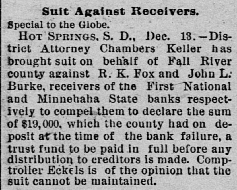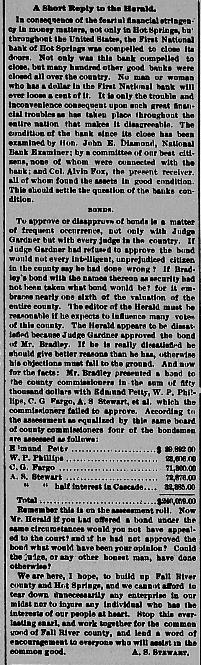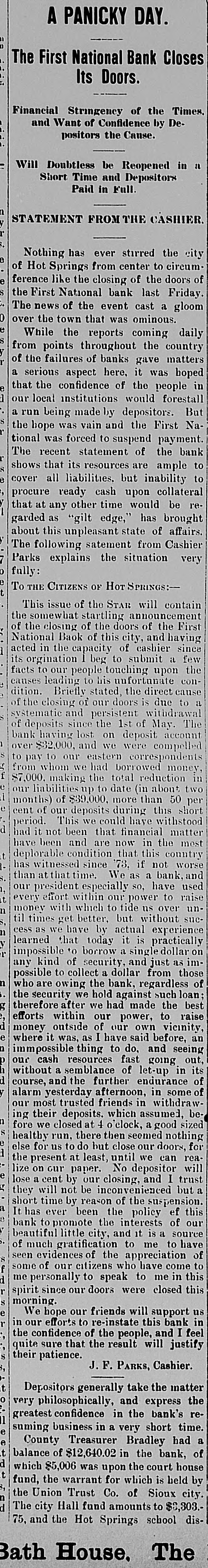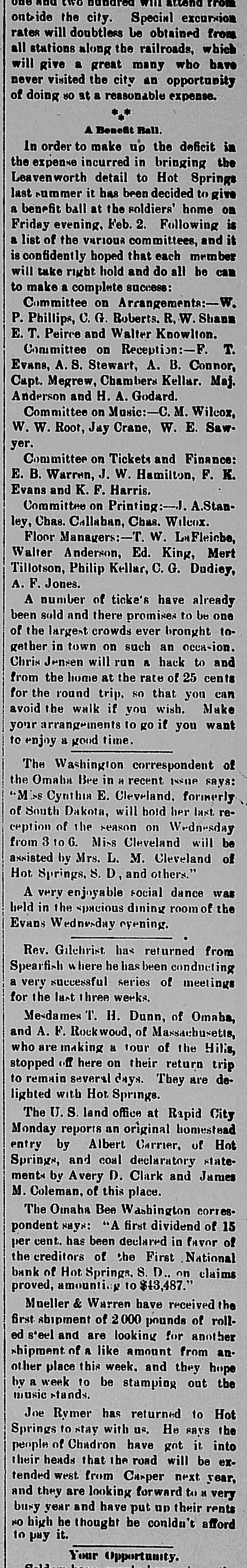 TELEGRAPHIC BREVITIES. Peary's [arctic ship Falcon nearly overturned in her berth at Custom house dock at Portland, Me., last night. Cardinal Gibbons arrived at Narragansett Pier, R. I., yesterday afternoon. He was escorted by Bishop Harkins, of Providence; Bishop Jas. A. Healy and others. The steamship State of Texas of the Mallory line of New York, is disabled and is drifting off the outer shore of Mount Desert Island, Me., with a broken propeller. President Barrios, the Dictator of Guatemala, has declared G. Santalana, a young Guatemalan inventor, a traitor to that republic, and death awaits him should he fall into the clutches of Barrios. The President's condition this morning remains about the same as last night. He goes about the house, at Buzzards Bay, Mass., and out upon the veranda and a gradual improvement is noticeable. The financial crisis through which the Duke of Veragua is now passing seems to have been caused in a great measure by speculation in Paris, the Duke having intrusted his money to another. Henry Merrill, who shot Jones Ellison, an old man of 60 years, on June 23rd, was found dead in a coffin near Wardner, Idaho, yesterday. He had evidently committed suicide by shooting himself. An exhibitor in the Italian section of the World Fair was arrested yesterday by agents of the Treasury for selling goods in violation of the customs laws. He was held to the federal grand jury in the sum of $700. Some time before daylight yesterday morning the safe in the office of a real estate dealer in Patchogue, L. I., was broken into and robbed of valuables to the amount of $20,000. There is not the slightest clue to the thieves. The Citizens' Bank, of Wenneconne, Wis., closed its doors yesterday. Its cashier, Varwacter, was arrested on the charge of receiving deposits after he knew the bank to be insolvent. He claims the bank can pay in full. Mgr. Satolli is investigating charges made by Catholic priests against Rev. Martin Marty, Catholic bishop of South Dakota. Last winter anonymous circulars were sent over the State charging the bishop with immorality, incompetency and sectionalism. The failure of Coffin and Stanton to take the $600,000 of the Indianapolis, Ind., refunding bonds has led to a serious complication, and the city treasis practically bankrupt, not a dolury the offilar being on hand even to pay cers' salaries or keep the several departments running. A terrific head-end collision occurred between Philadelphia and Erie freights, near Johnsonburg this afternoon. When the trains came together 2 engines and 18 cars were piled high as the telegraph poles. The engineer on the east-bound freight was killed; his head brakeman was orushed to death and his fireman was so badly bruised that he will die. The engineer, conductor, firemen and two brakemen of the West bound train, are seriously injured. John W. Flood, who was convicted of em$164,000 from the Donohue-Kelly bezzling SeaBank, was granted a new trial by Judge well at San Francisco yesterday. Bail was fixed at $50,000. The First National Bank of Hot Springs, S. D., closed its doors yesterday.