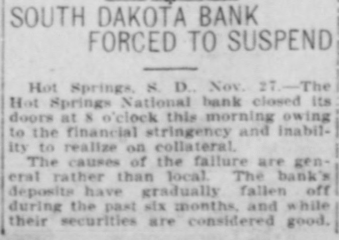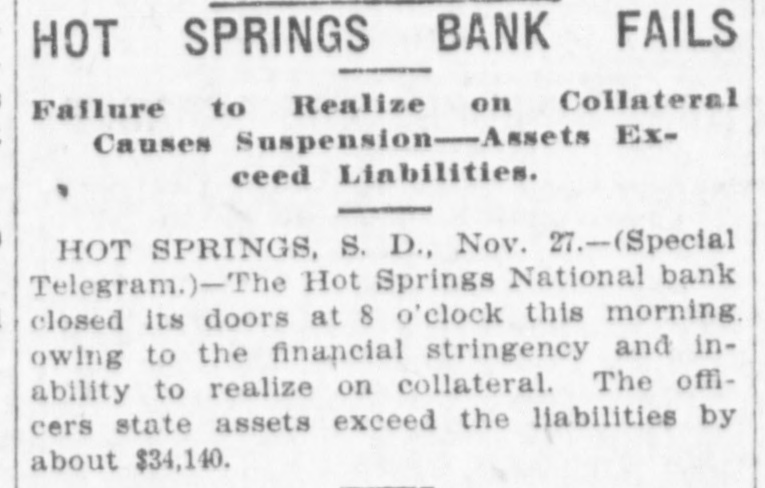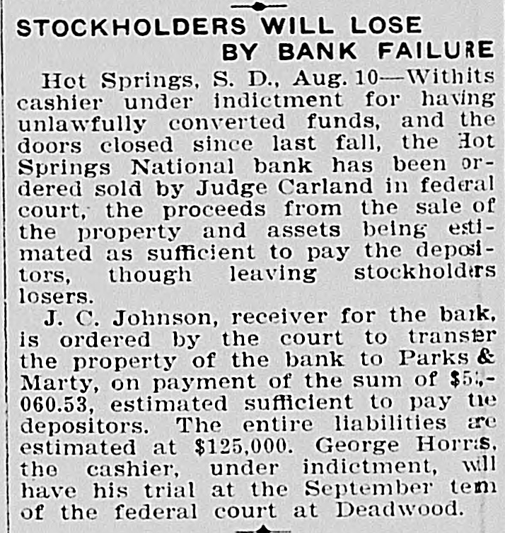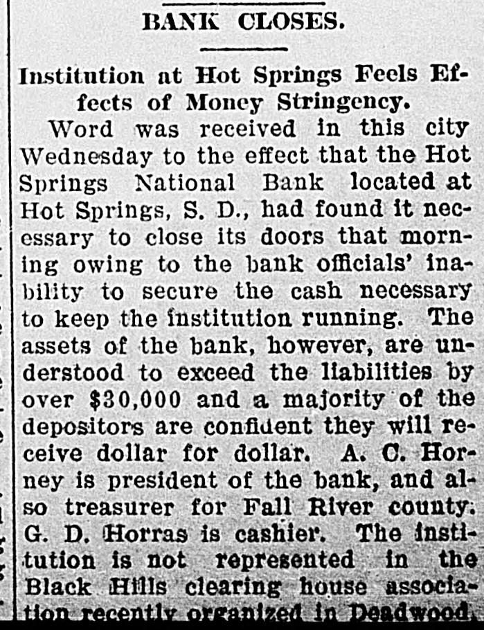 BANK CLOSES. / Institution at Hot Springs Feels Effects of Money Stringency. Word was received in this city Wednesday to the effect that the Hot Springs National Bank located at Hot Springs, S. D., had found it necessary to close its doors that morning owing to the bank officials' inability to secure the cash necessary to keep the institution running. The assets of the bank, however, are understood to exceed the liabilities by over $30,000 and a majority of the depositors are confident they will receive dollar for dollar. A. C. Horney is president of the bank, and also treasurer for Fall River county. G. D. Horras is cashier. The institution is not represented in the Black Hills clearing house association recently organized in Deadwood