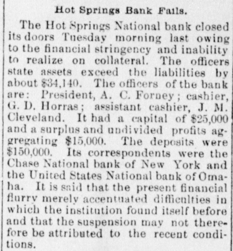 Hot Springs Bank Fails. The Hot Springs National bank closed its doors Tuesday morning last owing to the financial stringency and inability to realize on collateral. The officers state assets exceed the liabilities by about $34,140. The officers of the bank are: President, A. C. Forney; cashier, G. D. Horras; assistant cashier, J. M. Cleveland. It had a capital of $25,000 and a surplus and undivided profits aggregating $15,000. The deposits were $150,000. Its correspondents were the Chase National bank of New York and the United States National bank of Omaha. It is said that the present financial flurry merely accentuated difficulties in which the institution found itself before and that the suspension may not therefore be attributed to the recent conditions.