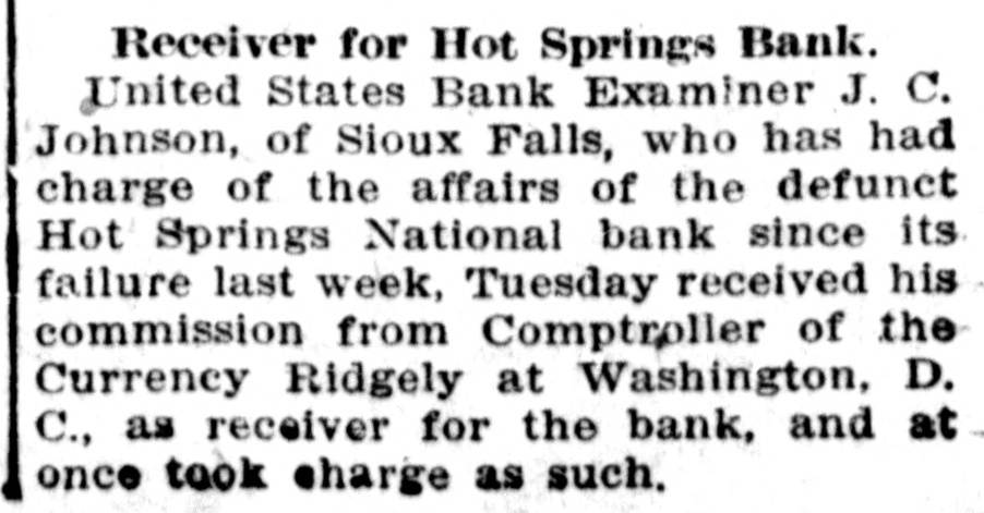 Receiver for Hot Springs Bank. United States Bank Examiner J. C. Johnson, of Sioux Falls, who has had charge of the affairs of the defunct Hot Springs National bank since its failure last week, Tuesday received his commission from Comptroller of the Currency Ridgely at Washington, D. C., as receiver for the bank, and at once took charge as such.