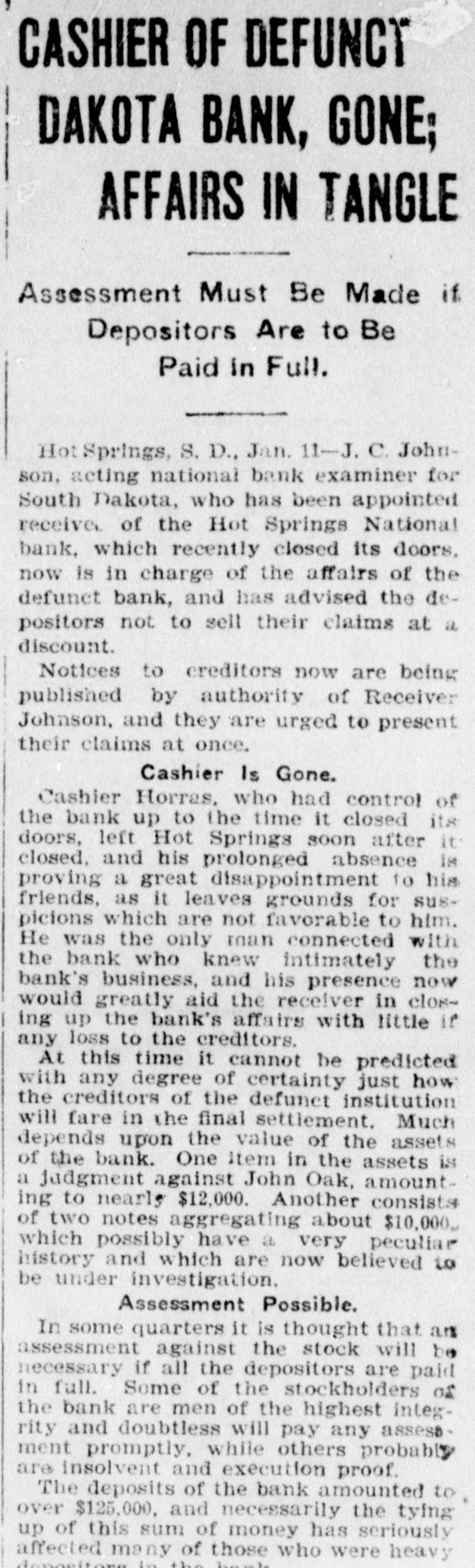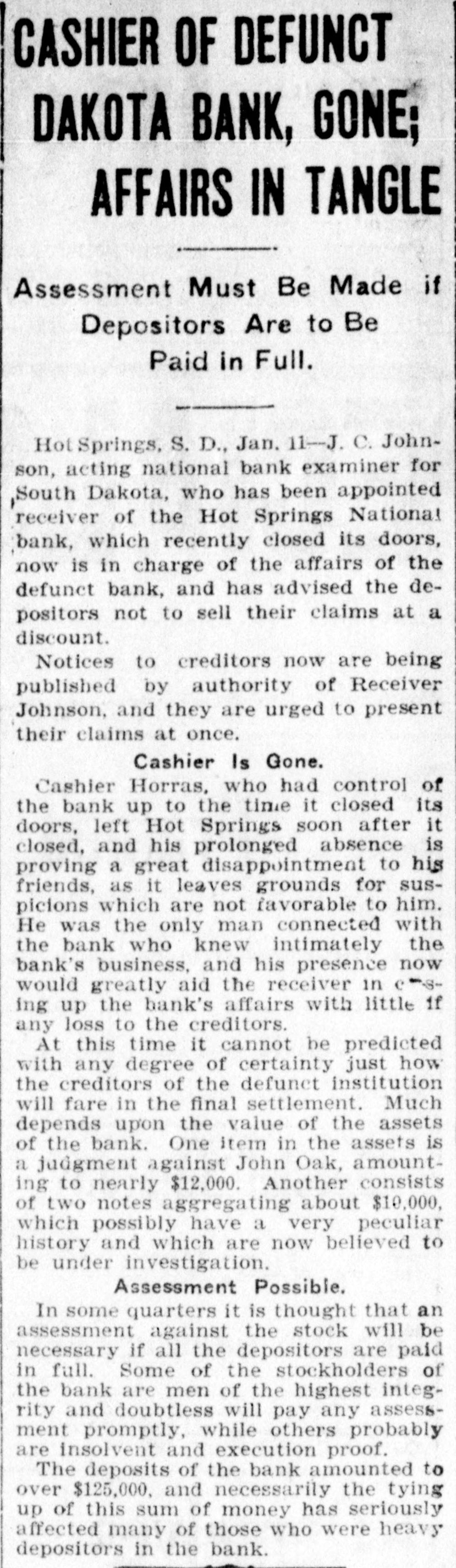 CASHIER OF DEFUNCT DAKOTA BANK, GONE; AFFAIRS IN TANGLE Assessment Must Be Made if Depositors Are to Be Paid in Full. Hot Springs, S. D., Jan. 11-J. C. Johnson, acting national bank examiner for South Dakota, who has been appointed receiver of the Hot Springs National bank, which recently closed its doors, now is in charge of the affairs of the defunct bank, and has advised the depositors not to sell their claims at a discount. Notices to creditors now are being published by authority of Receiver Johnson, and they are urged to present their claims at once. Cashier Is Gone. Cashier Horras, who had control of the bank up to the time it closed its doors, left Hot Springs soon after it closed, and his prolonged absence is proving a great disappointment to his friends, as it leaves grounds for suspicions which are not favorable to him. He was the only man connected with the bank who knew intimately the bank's business, and his presence now would greatly aid the receiver in e-sing up the bank's affairs with little if any loss to the creditors. At this time it cannot be predicted with any degree of certainty just how the creditors of the defunct institution will fare in the final settlement. Much depends upon the value of the assets of the bank. One item in the assets is a judgment against John Oak, amounting to nearly $12,000. Another consists of two notes aggregating about $10,000, which possibly have a very peculiar history and which are now believed to be under investigation. Assessment Possible. In some quarters it is thought that an assessment against the stock will be necessary if all the depositors are paid in full. Some of the stockholders of the bank are men of the highest integrity and doubtless will pay any assessment promptly, while others probably are insolvent and execution proof. The deposits of the bank amounted to over $125,000, and necessarily the tying up of this sum of money has seriously affected many of those who were heavy depositors in the bank.