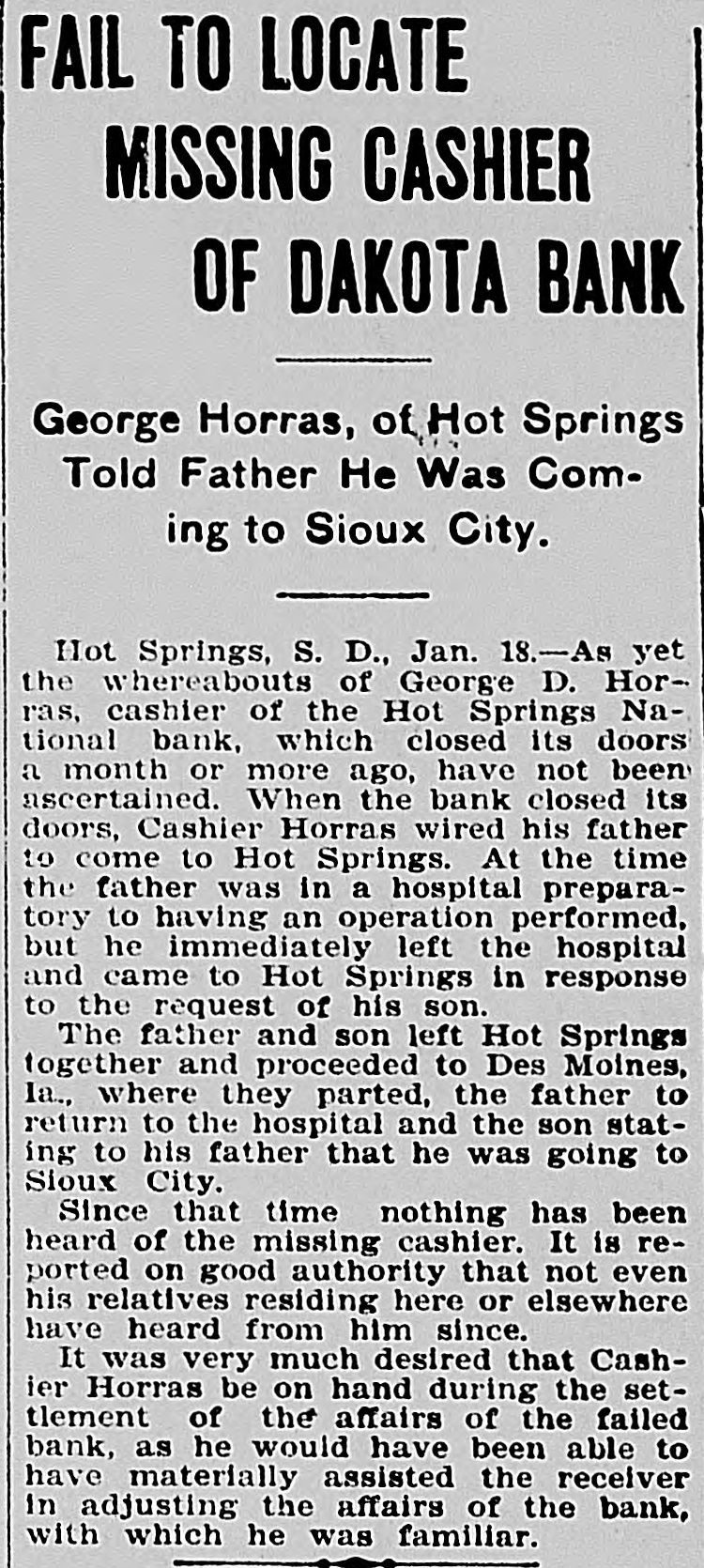 FAIL TO LOCATE MISSING CASHIER OF DAKOTA BANK George Horras, of Hot Springs Told Father He Was Coming to Sioux City. Hot Springs, S. D., Jan. 18.-As yet the whereabouts of George D. Horras, cashier of the Hot Springs National bank, which closed its doors a month or more ago, have not been ascertained. When the bank closed its doors, Cashier Horras wired his father to come to Hot Springs. At the time the father was in a hospital preparatory to having an operation performed, but he immediately left the hospital and came to Hot Springs in response to the request of his son. The father and son left Hot Springs together and proceeded to Des Moines, Ia., where they parted, the father to return to the hospital and the son stating to his father that he was going to Sioux City. Since that time nothing has been heard of the missing cashier. It is reported on good authority that not even his relatives residing here or elsewhere have heard from him since. It was very much desired that Cashier Horras be on hand during the settlement of the affairs of the failed bank, as he would have been able to have materially assisted the receiver in adjusting the affairs of the bank, with which he was familiar.
