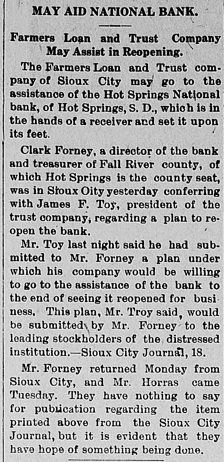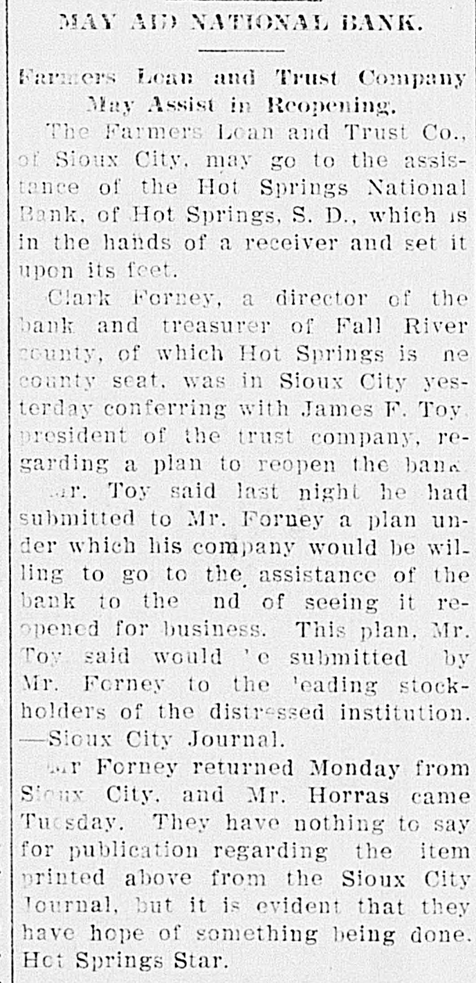 MAY AID NATIONAL BANK. Farmers Loan and Trust Company May Assist in Reopening. The Farmers Loan and Trust company of Sioux City may go to the assistance of the Hot Springs National bank, of Hot Springs, S. D., which is in the hands of a receiver and set it upon its feet. Clark Forney, a director of the bank and treasurer of Fall River county, of which Hot Springs is the county seat, was in Sioux Oity yesterday conferring with James F. Toy, president of the trust company, regarding a plan to reopen the bank. Mr. Toy last night said he had submitted to Mr. Forney a plan under which his company would be willing to go to the assistance of the bank to the end of seeing it reopened for business. This plan, Mr. Troy said, would be submitted by Mr. Forney to the leading stockholders of the distressed institution.-Sioux City Journal, 18. Mr. Forney returned Monday from Sioux City, and Mr. Horras came Tuesday. They have nothing to say for publication regarding the item printed above from the Sioux City Journal, but it is evident that they have hope of something being done.