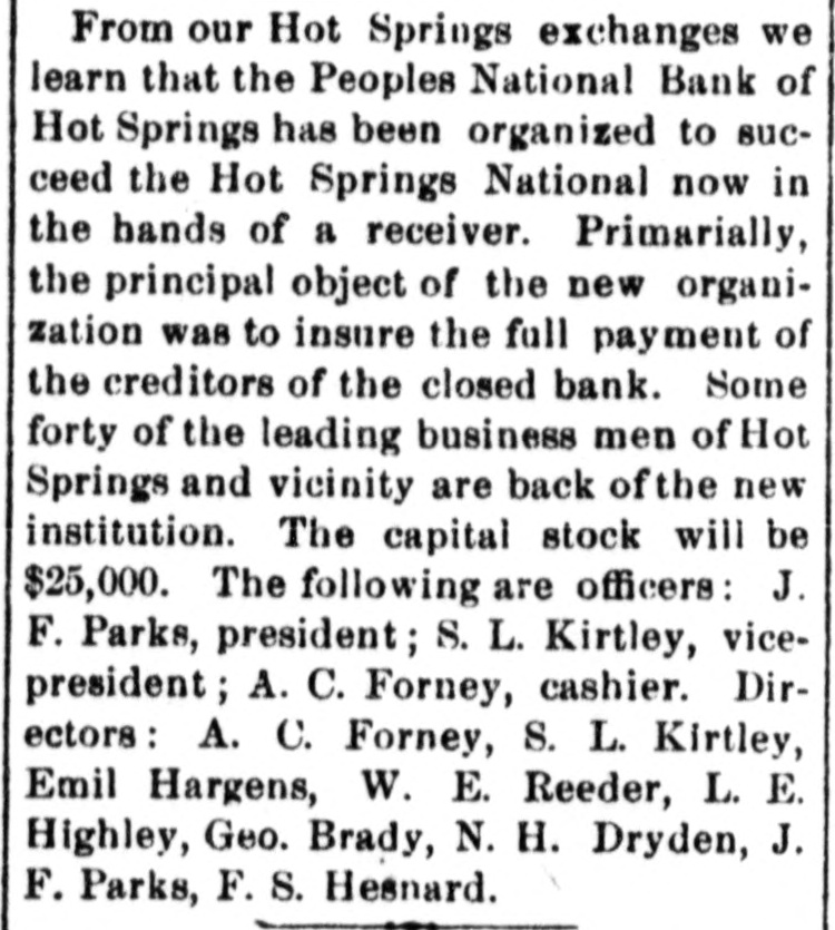 From our Hot Springs exchanges we learn that the Peoples National Bank of Hot Springs has been organized to succeed the Hot Springs National now in the hands of a receiver. Primarially, the principal object of the new organization was to insure the full payment of the creditors of the closed bank. Some forty of the leading business men of Hot Springs and vicinity are back ofthe new institution. The capital stock will be $25,000. The following are officers: J. F. Parks, president; S. L. Kirtley, vicepresident; A. C. Forney, cashier. Directors : A. C. Forney, S. L. Kirtley, Emil Hargens, W. E. Reeder, L. E. Highley, Geo. Brady, N. H. Dryden, J. F. Parks, F. S. Hesnard.